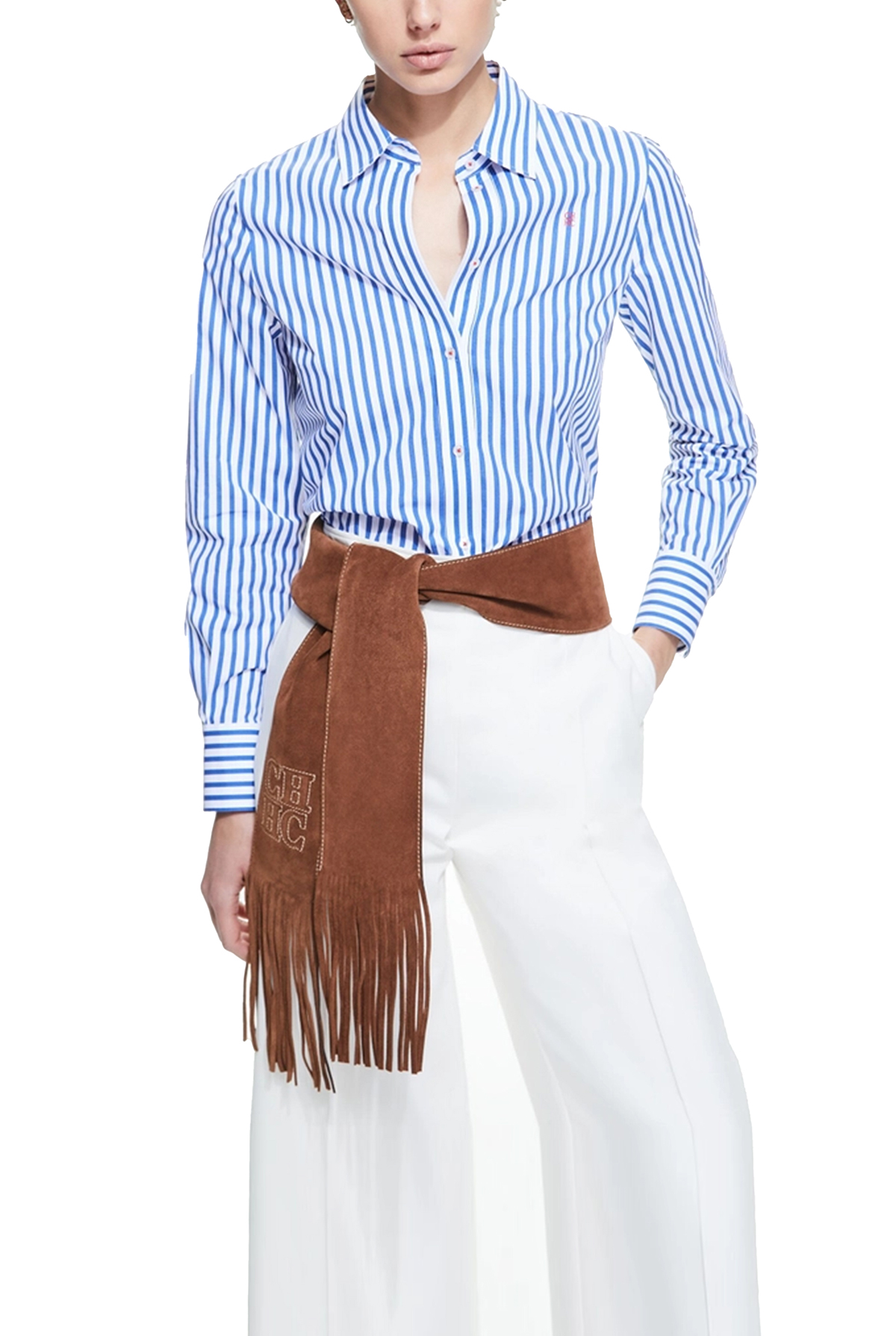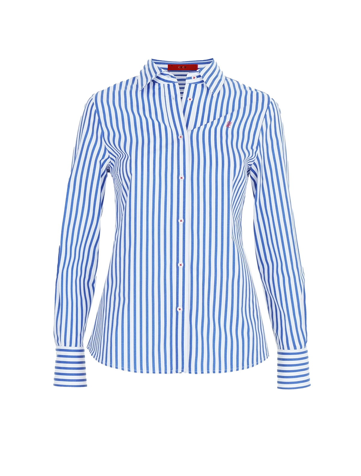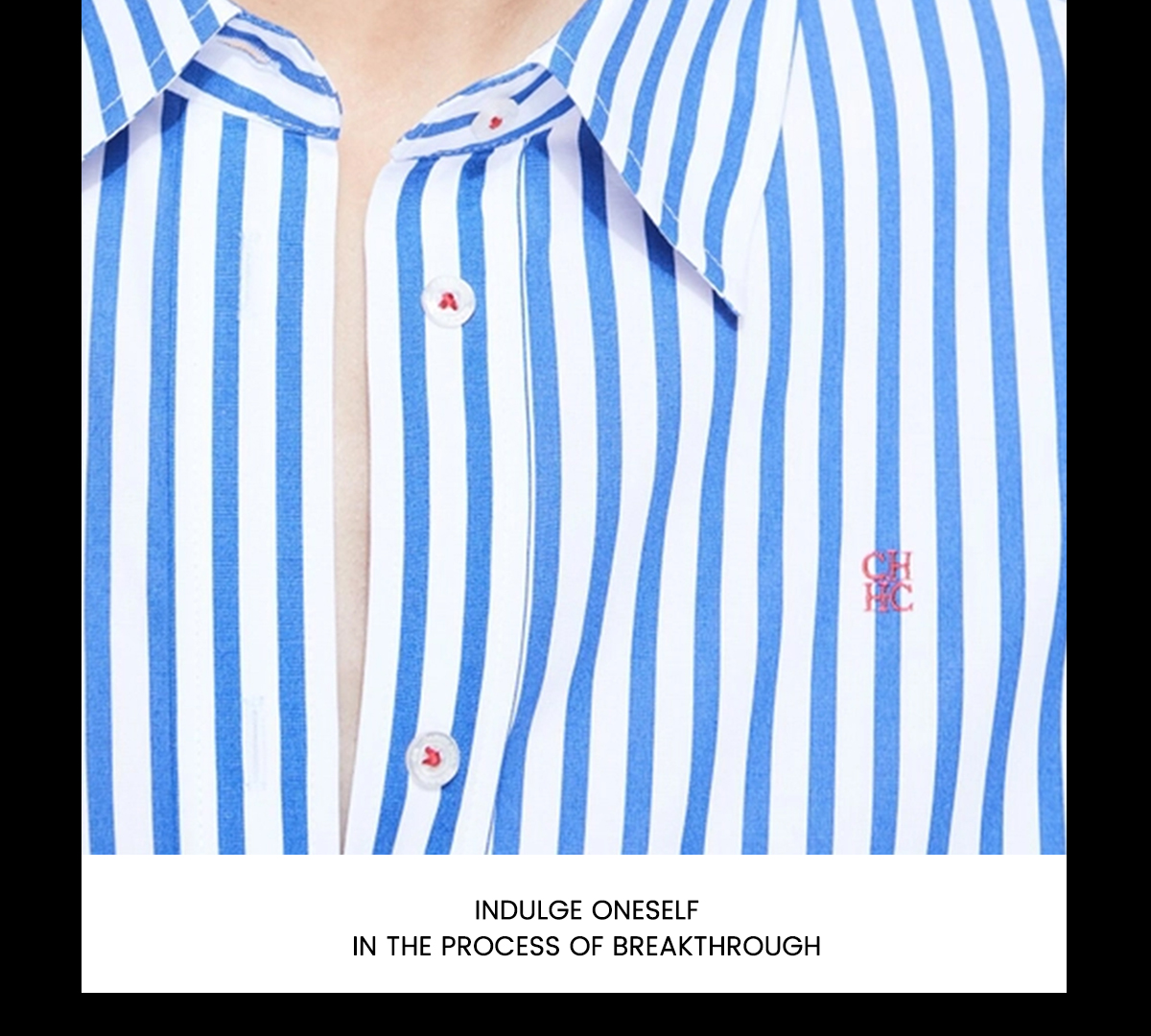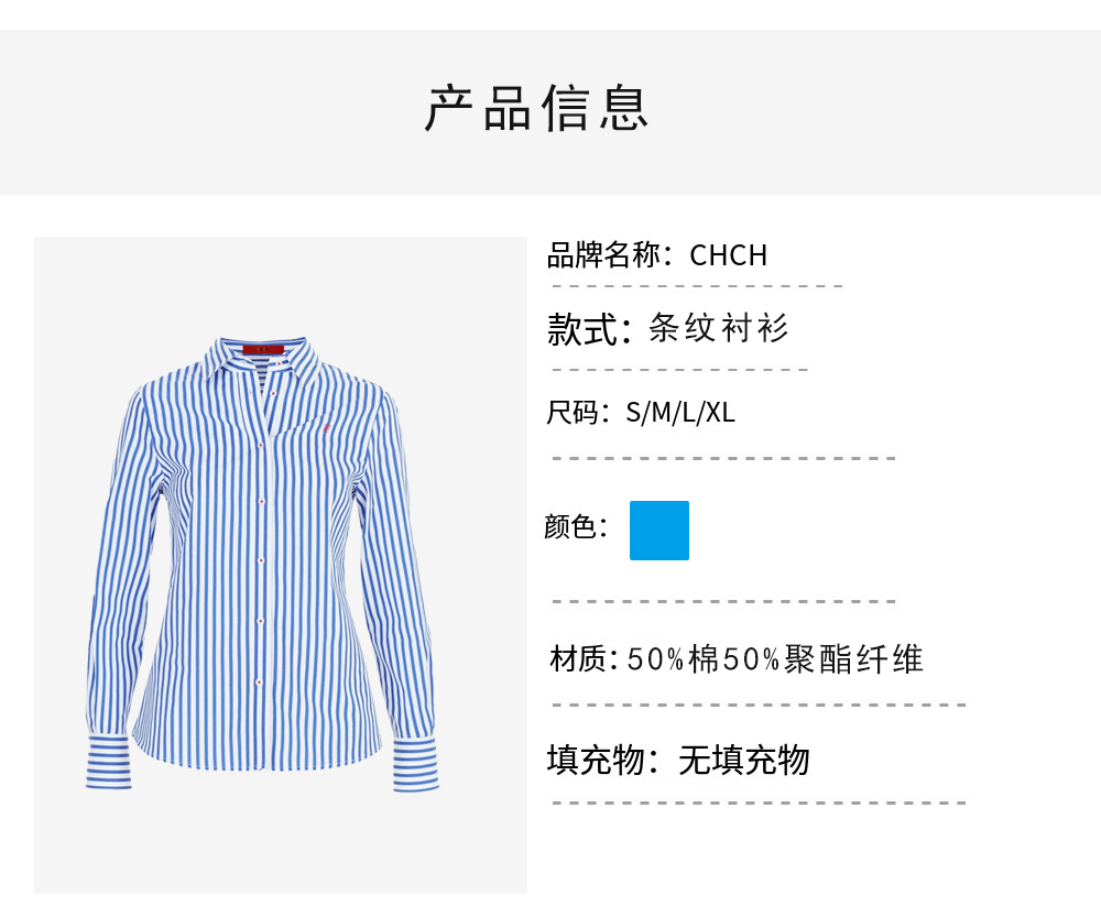 CHCH2025春夏休闲蓝色条纹时髦衬衫女上衣修身设计感通勤衬衣