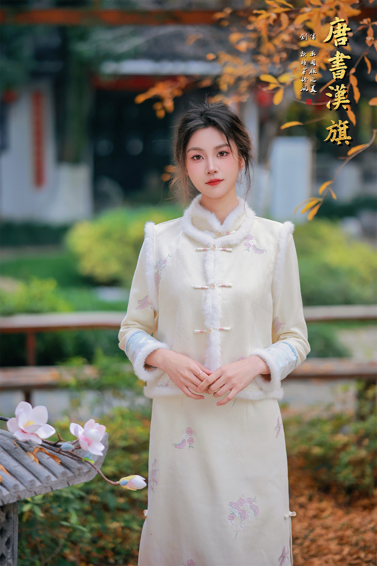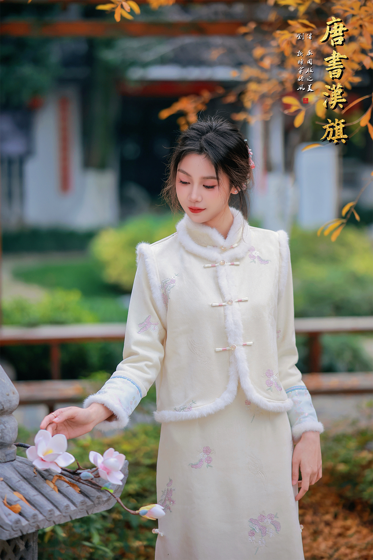 【雾蓝绣影】新中式立领盘扣造型,领口与袖口拼接毛绒边,裙身缀有淡雅花卉刺绣,下摆蕾丝花边点缀,修身剪裁勾勒温婉身形,米白色调清新雅致