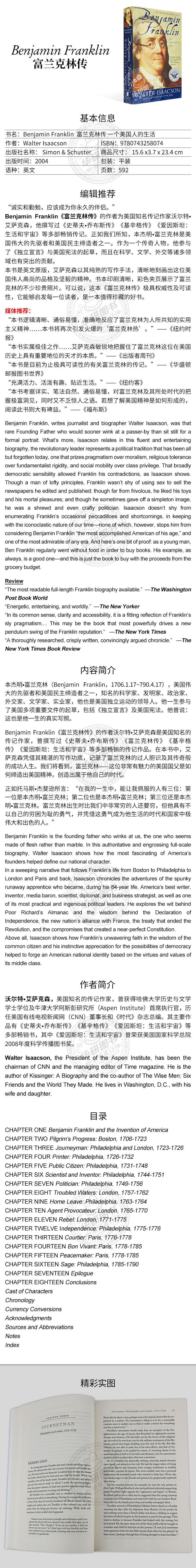 本书是英文原版,艾萨克森以其纯熟的写作手法,清晰地刻画出这位美国伟人高尚的品格及坚毅的精神。书本印刷清晰,彩色夹页展示了富兰克林的不少珍贵照片。可以说,这本《富兰克林传》极具权威性及可读性,它能够启发每一位读者,是一本值得珍藏的好书。