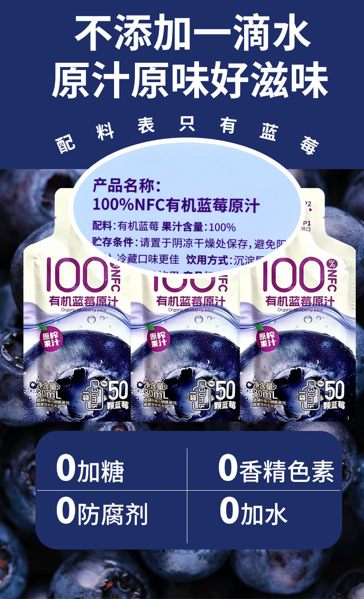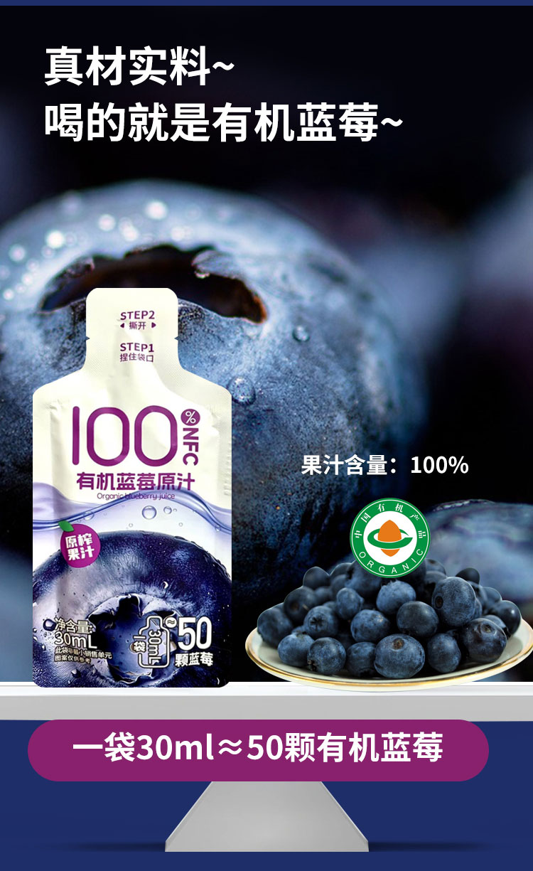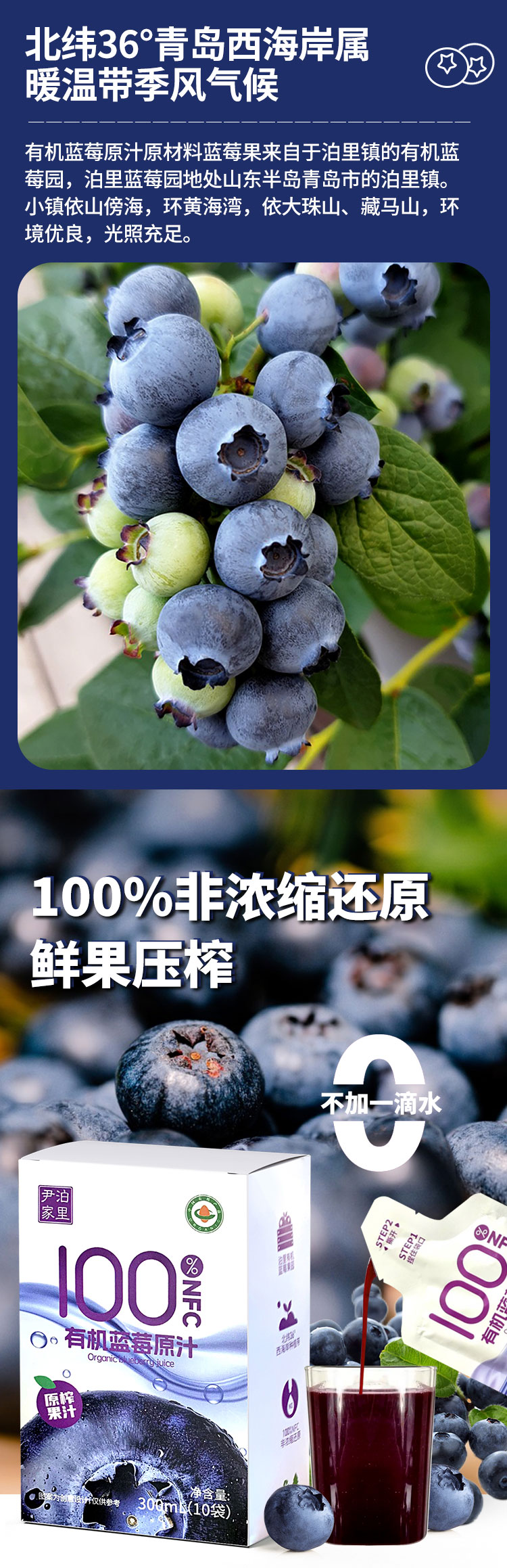 【厂商直发】鲜果压榨尹家泊里有机蓝莓原汁100%NFC鲜果压榨0色素包邮