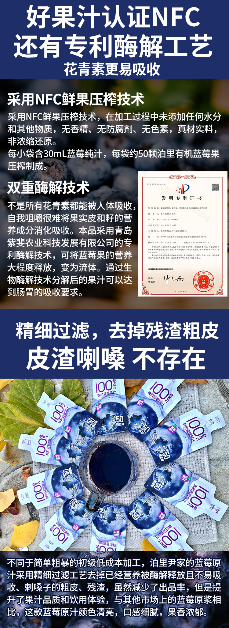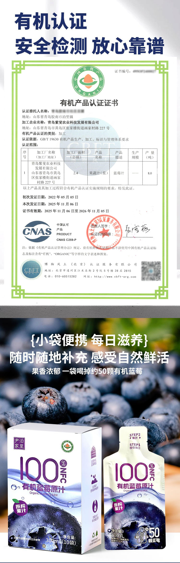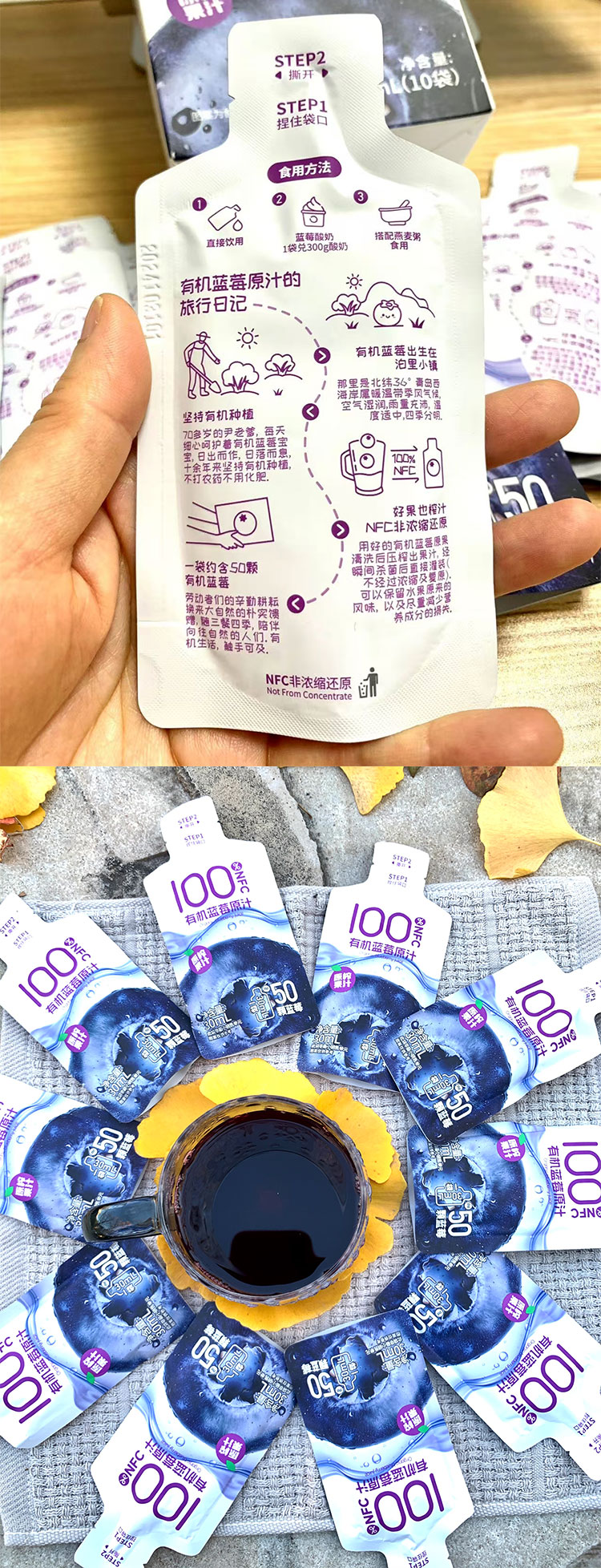 【厂商直发】鲜果压榨尹家泊里有机蓝莓原汁100%NFC鲜果压榨0色素包邮