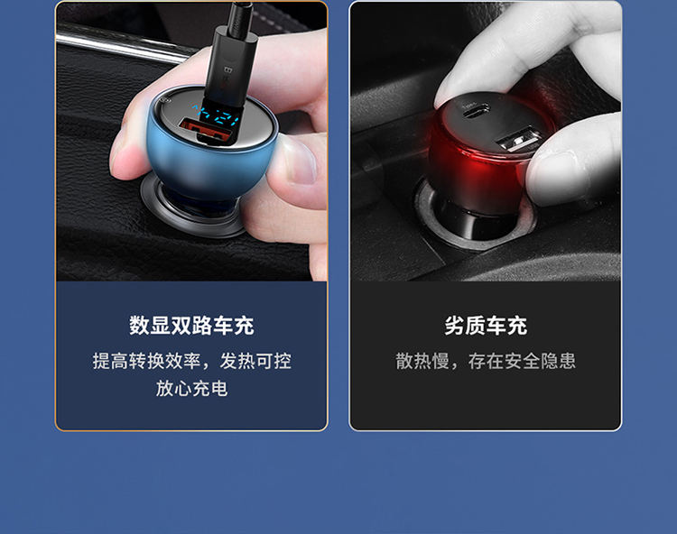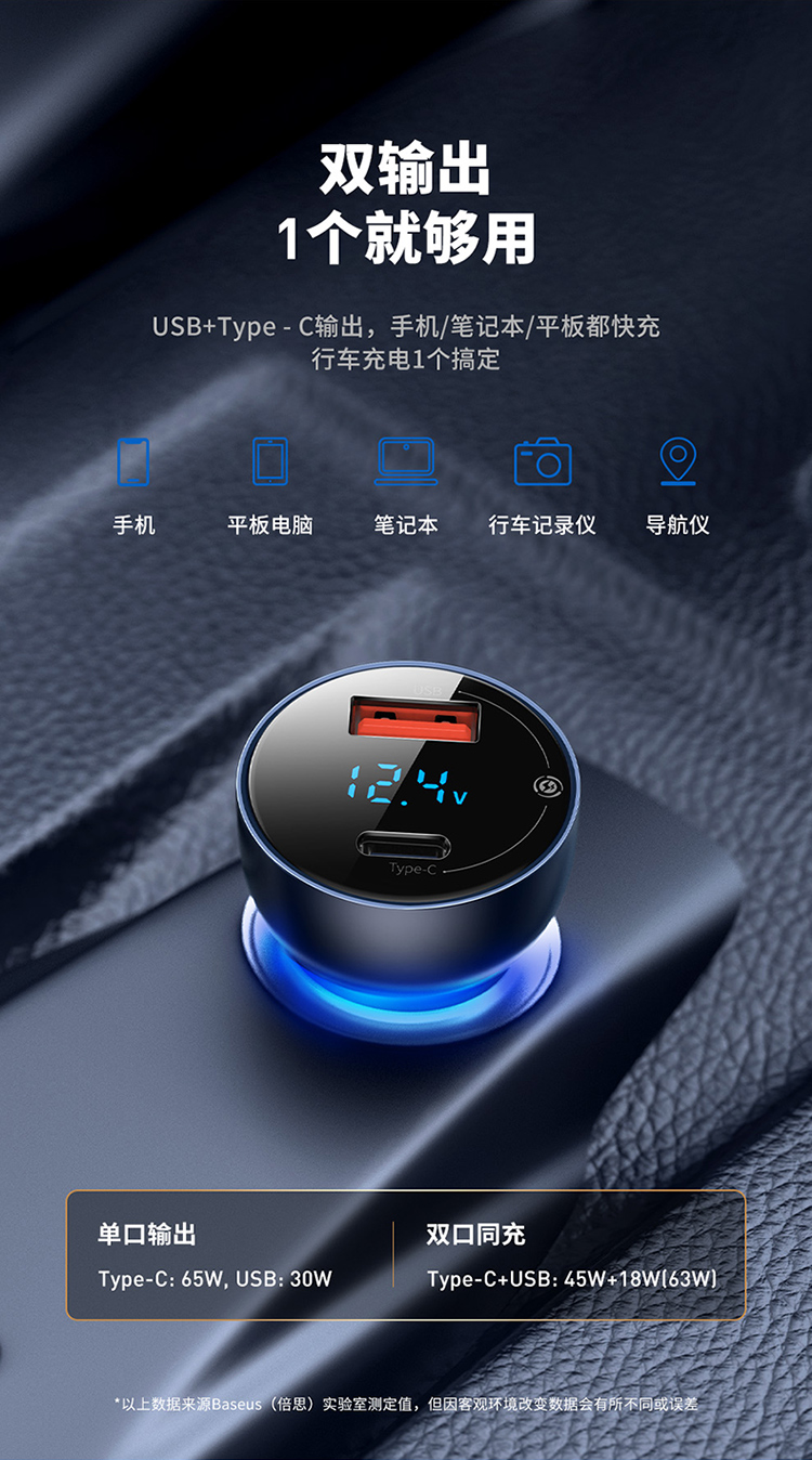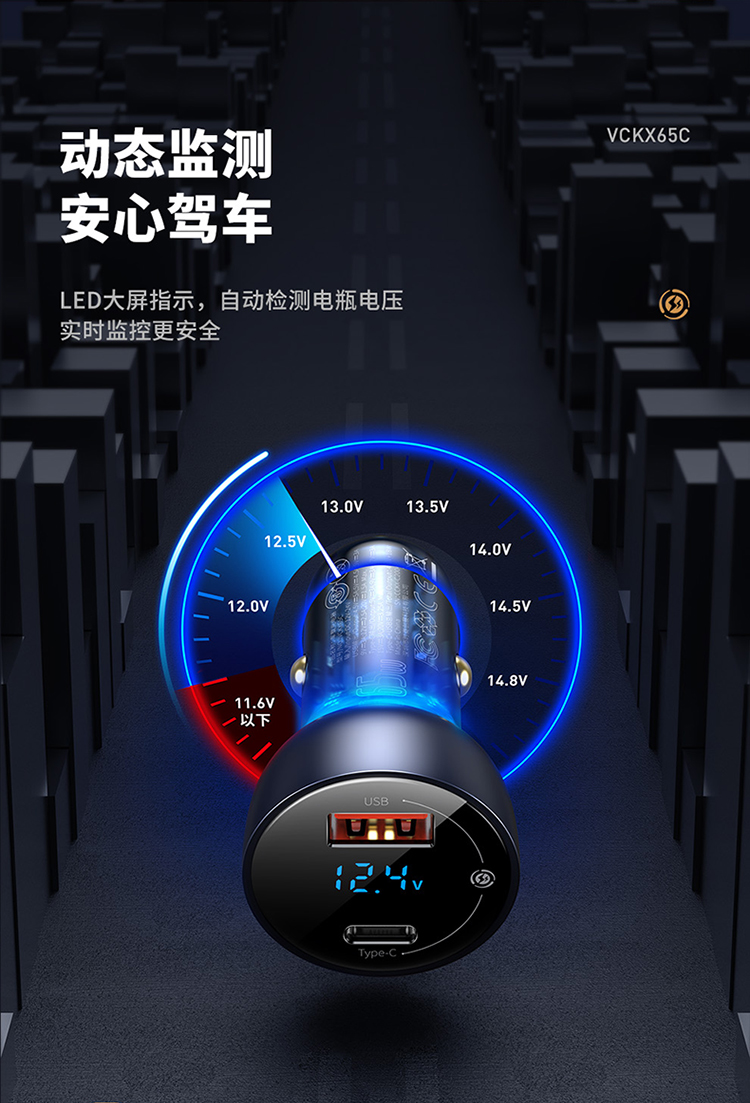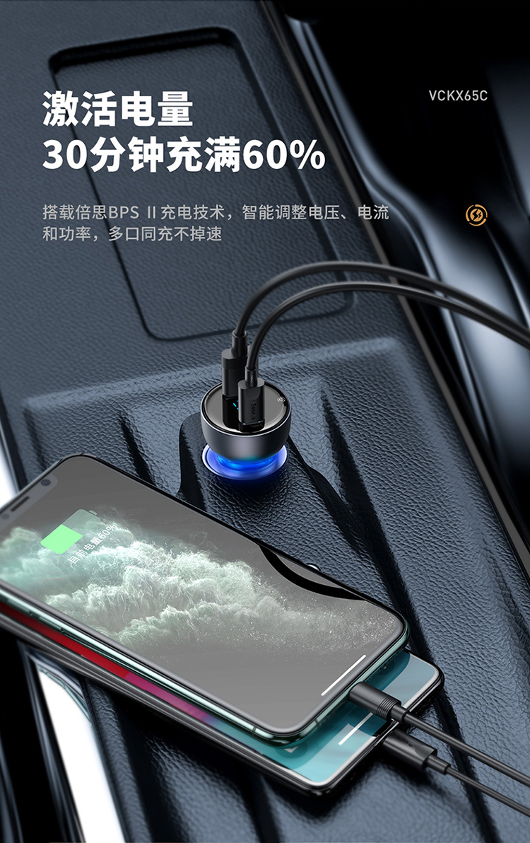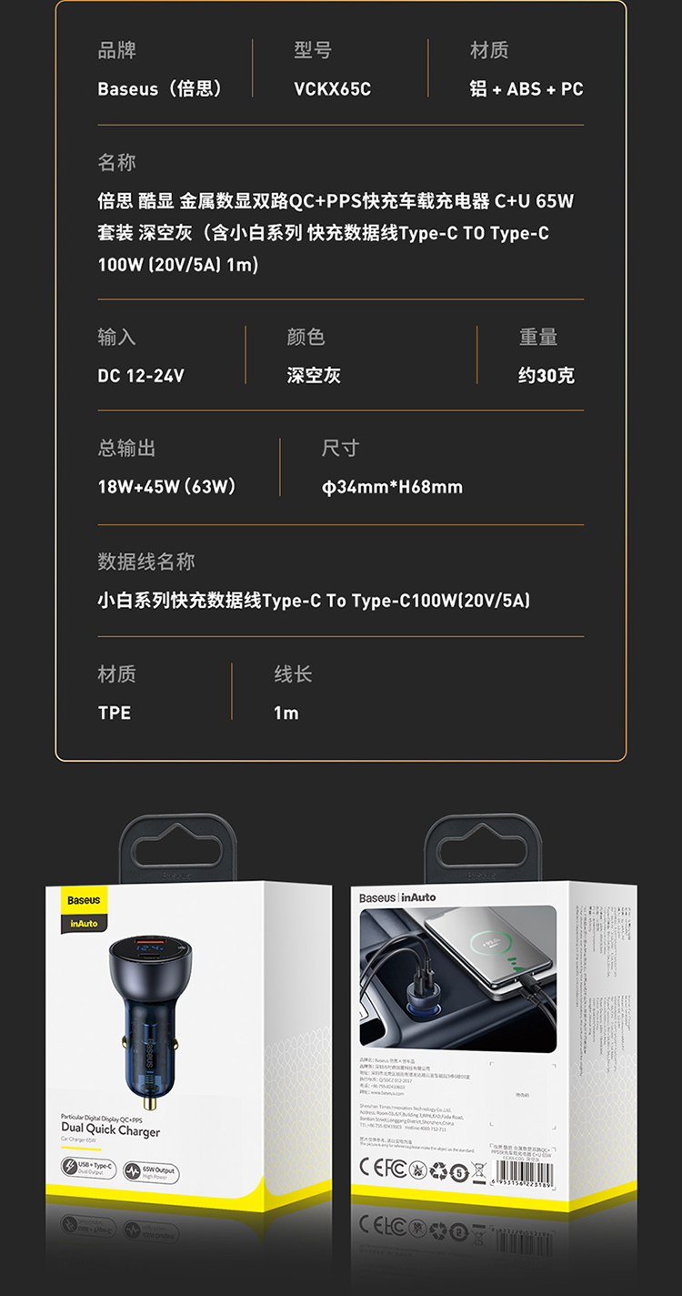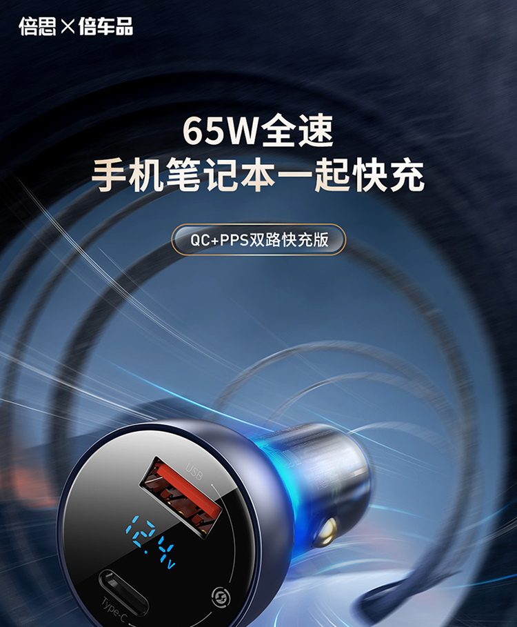 倍思 酷显 金属数显双路QC+PPS快充车载充电器 C+U 65W