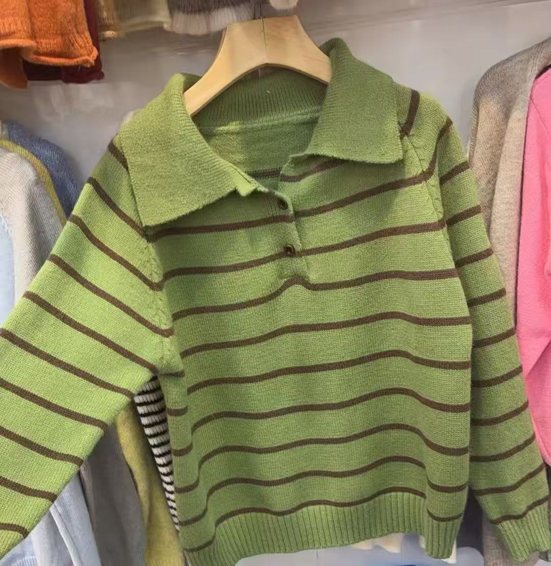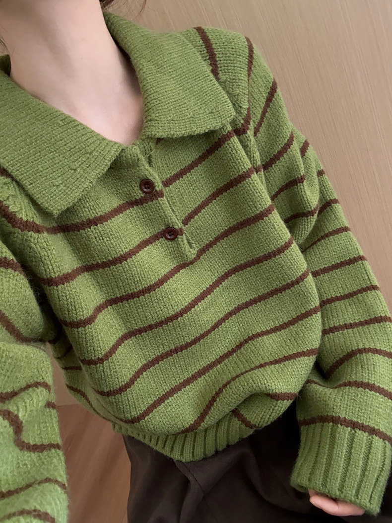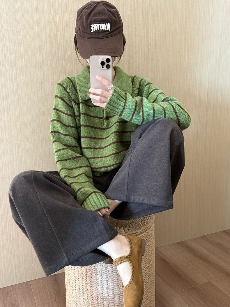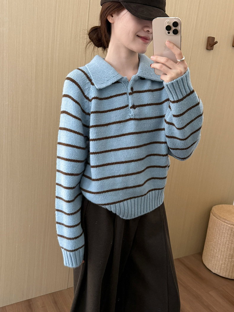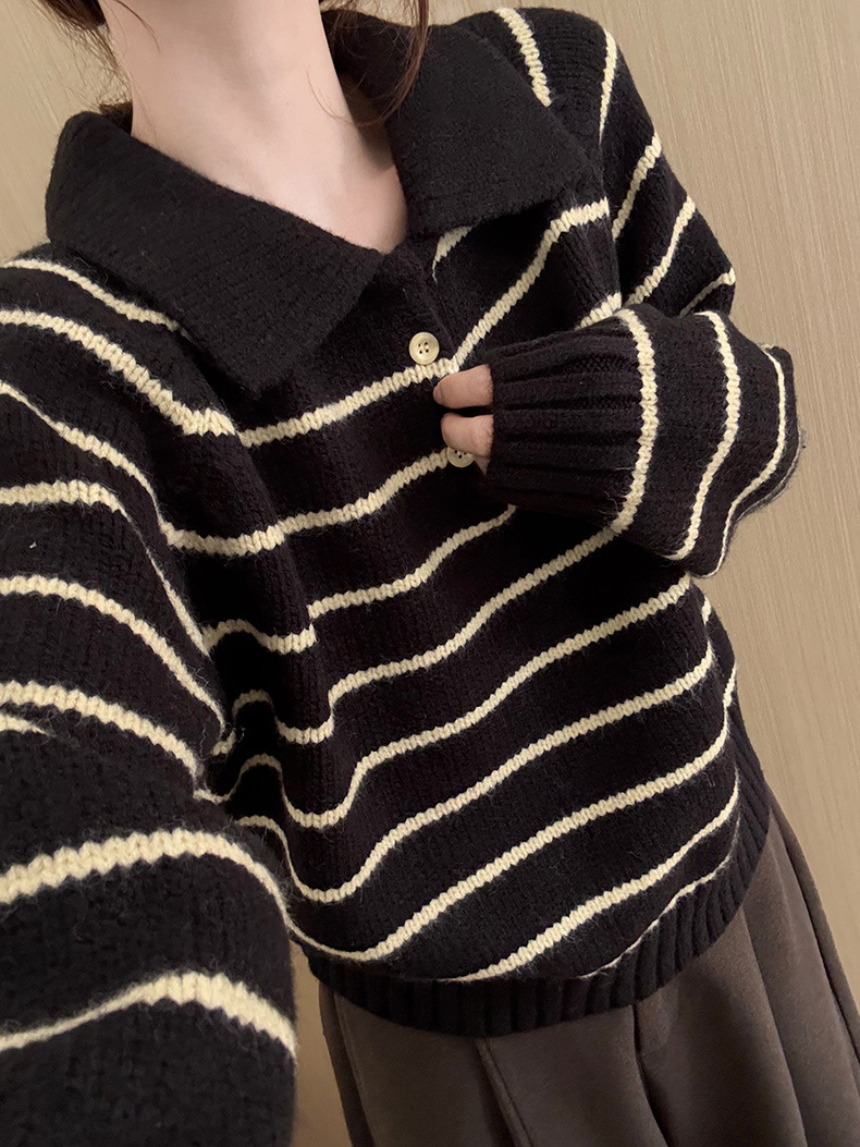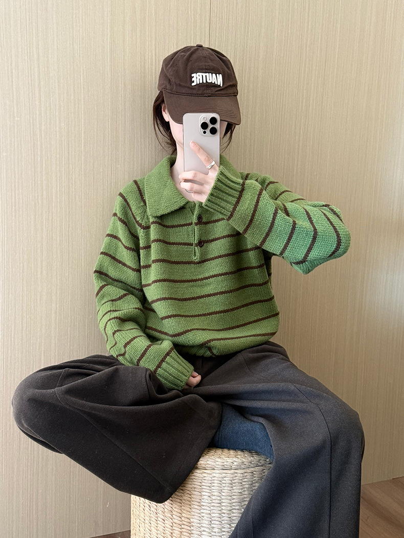 YS韩系撞色条纹polo领女毛衣2025秋冬宽松显瘦时尚针织衫外套上衣