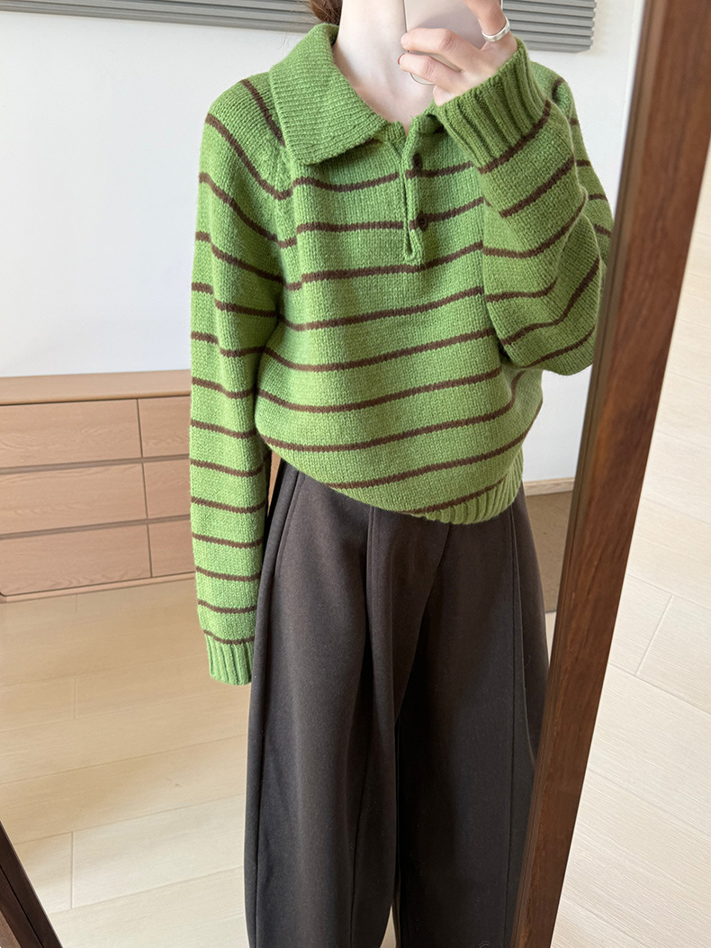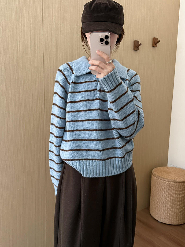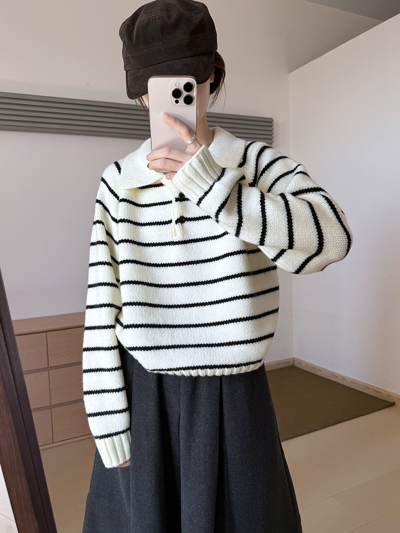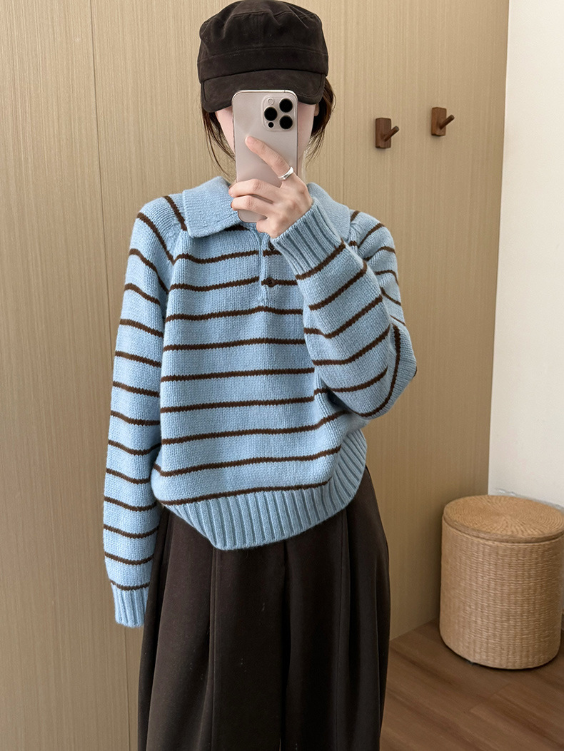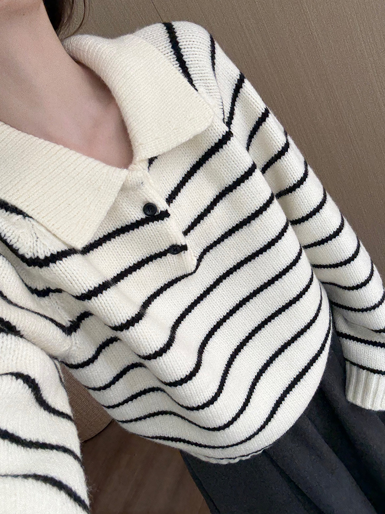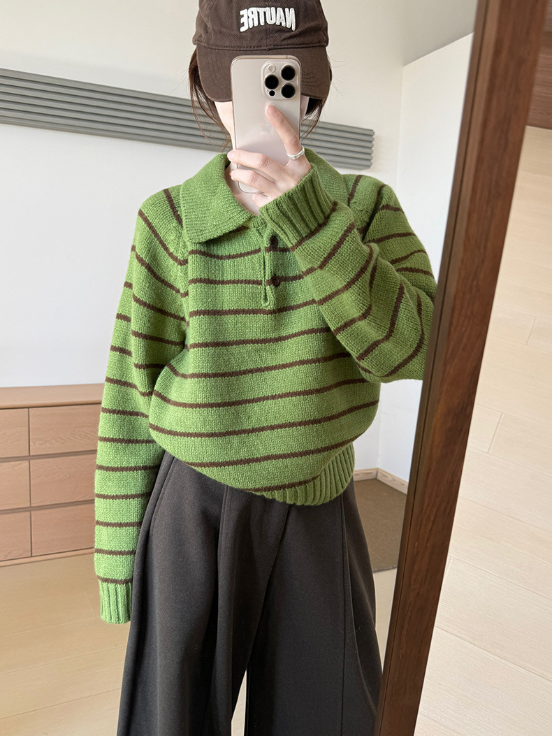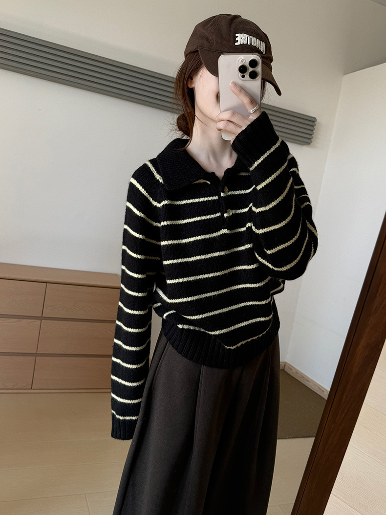 YS韩系撞色条纹polo领女毛衣2025秋冬宽松显瘦时尚针织衫外套上衣