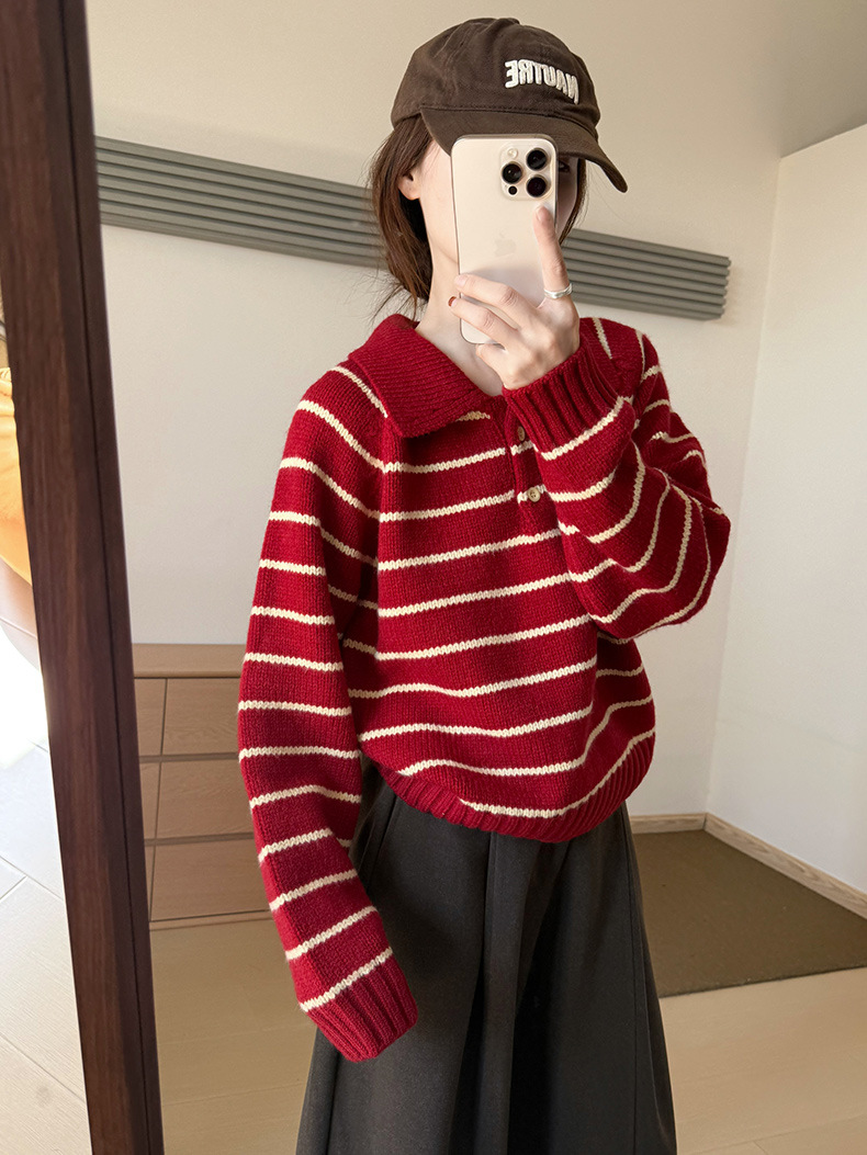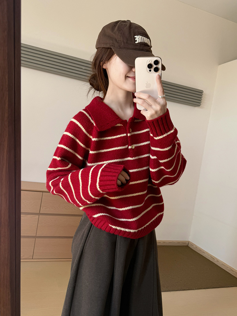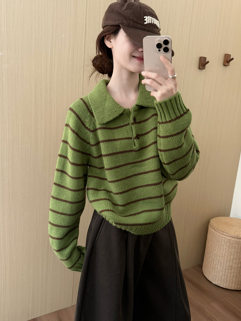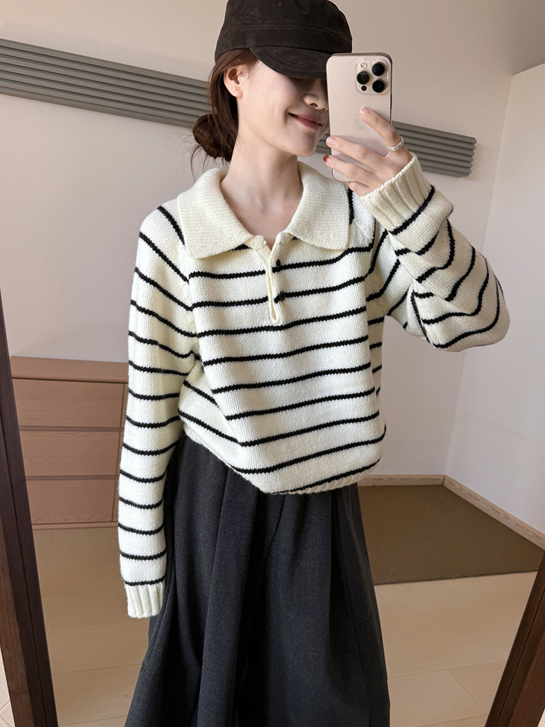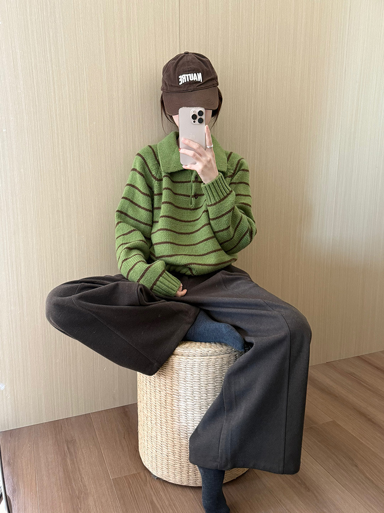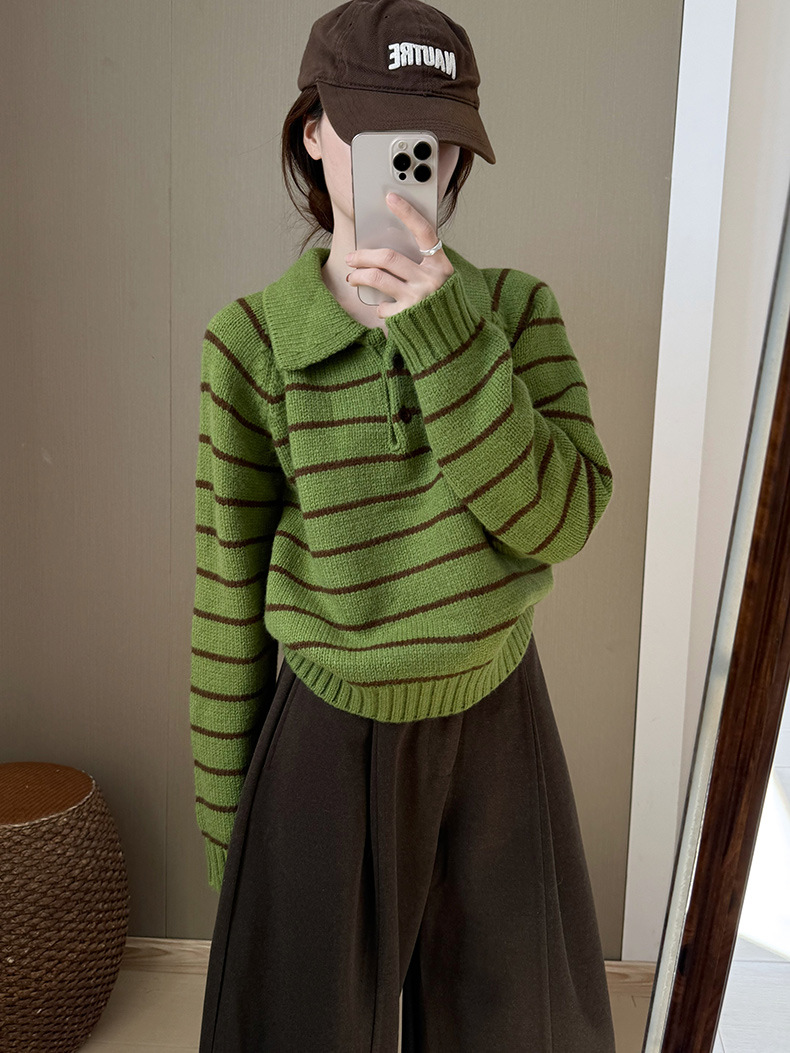 YS韩系撞色条纹polo领女毛衣2025秋冬宽松显瘦时尚针织衫外套上衣