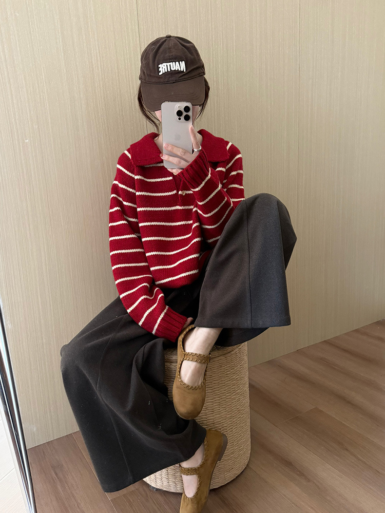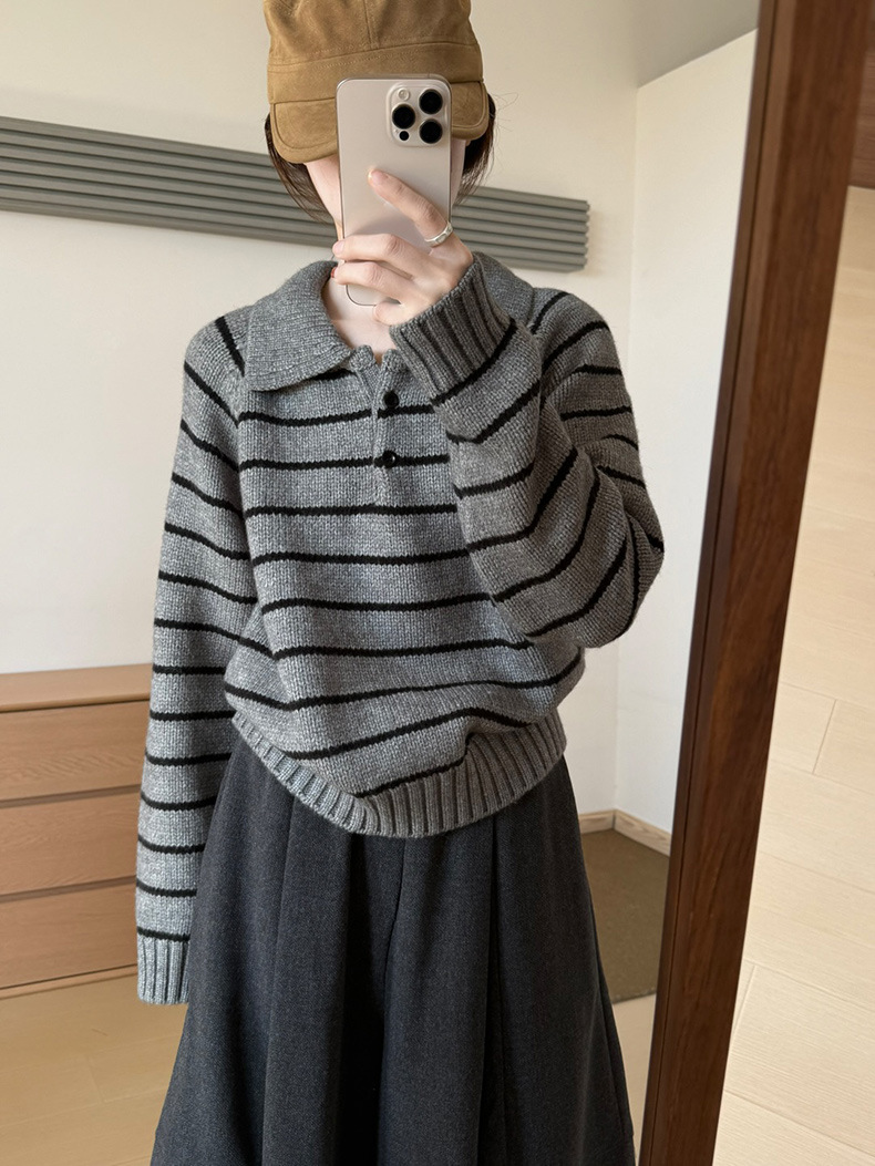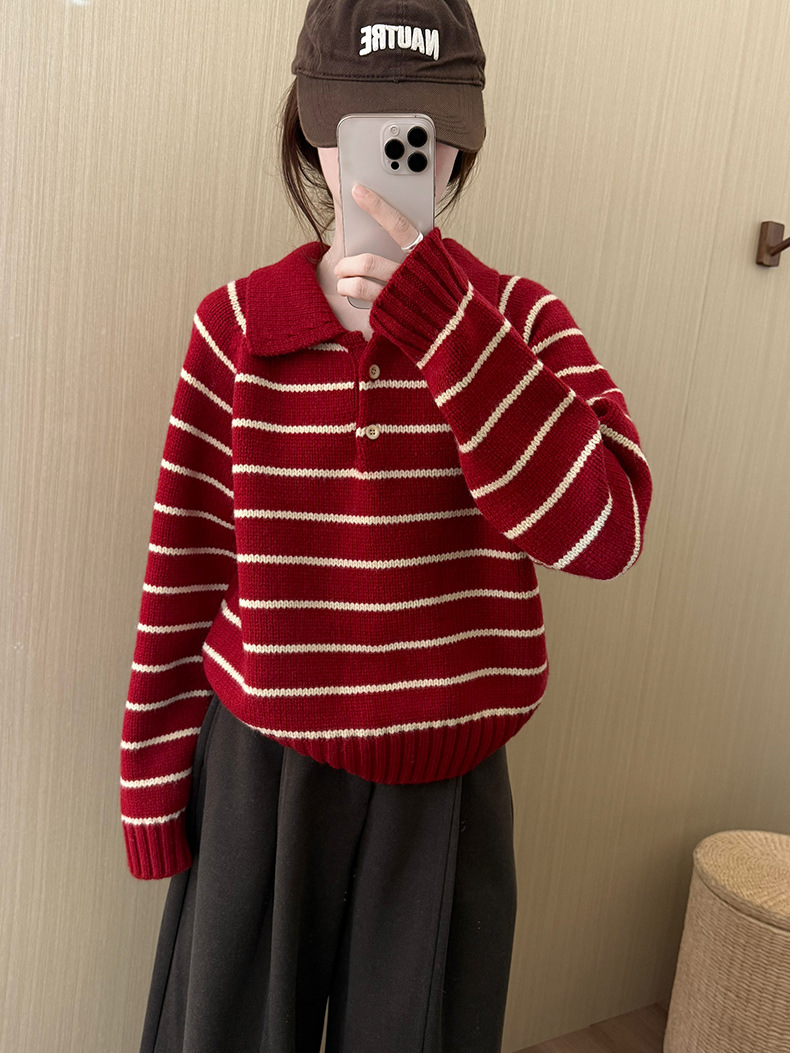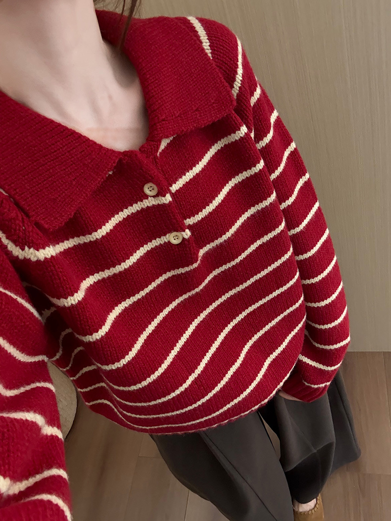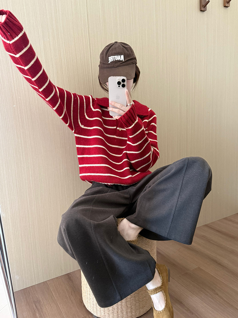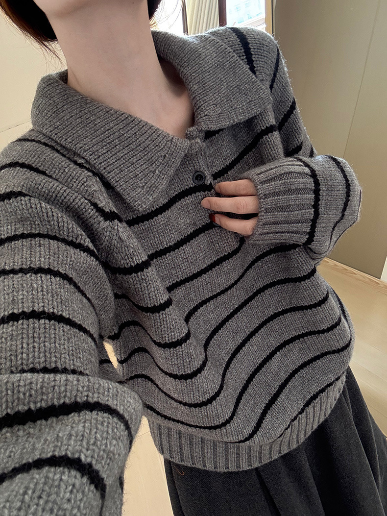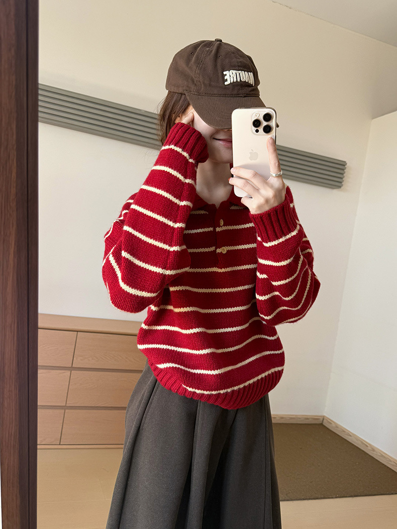 YS韩系撞色条纹polo领女毛衣2025秋冬宽松显瘦时尚针织衫外套上衣