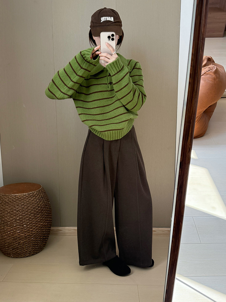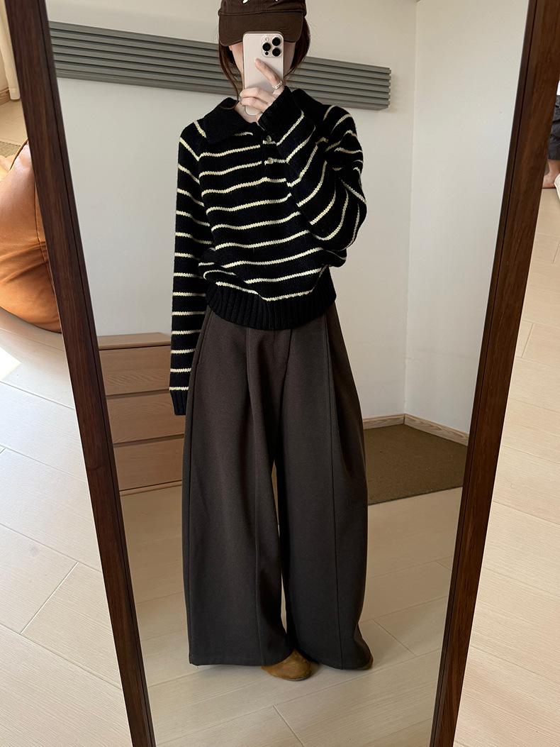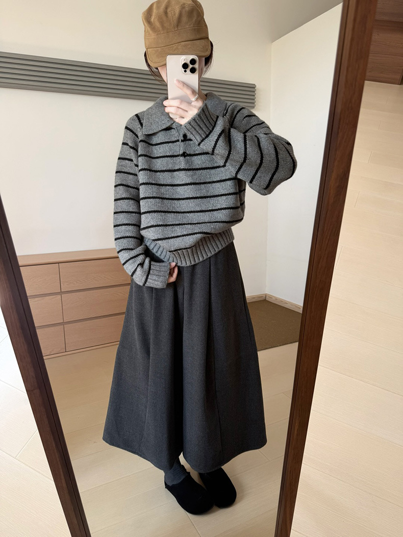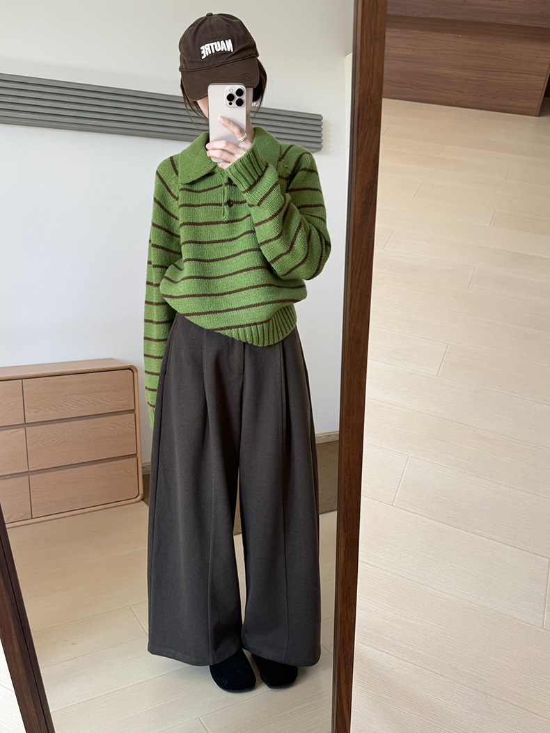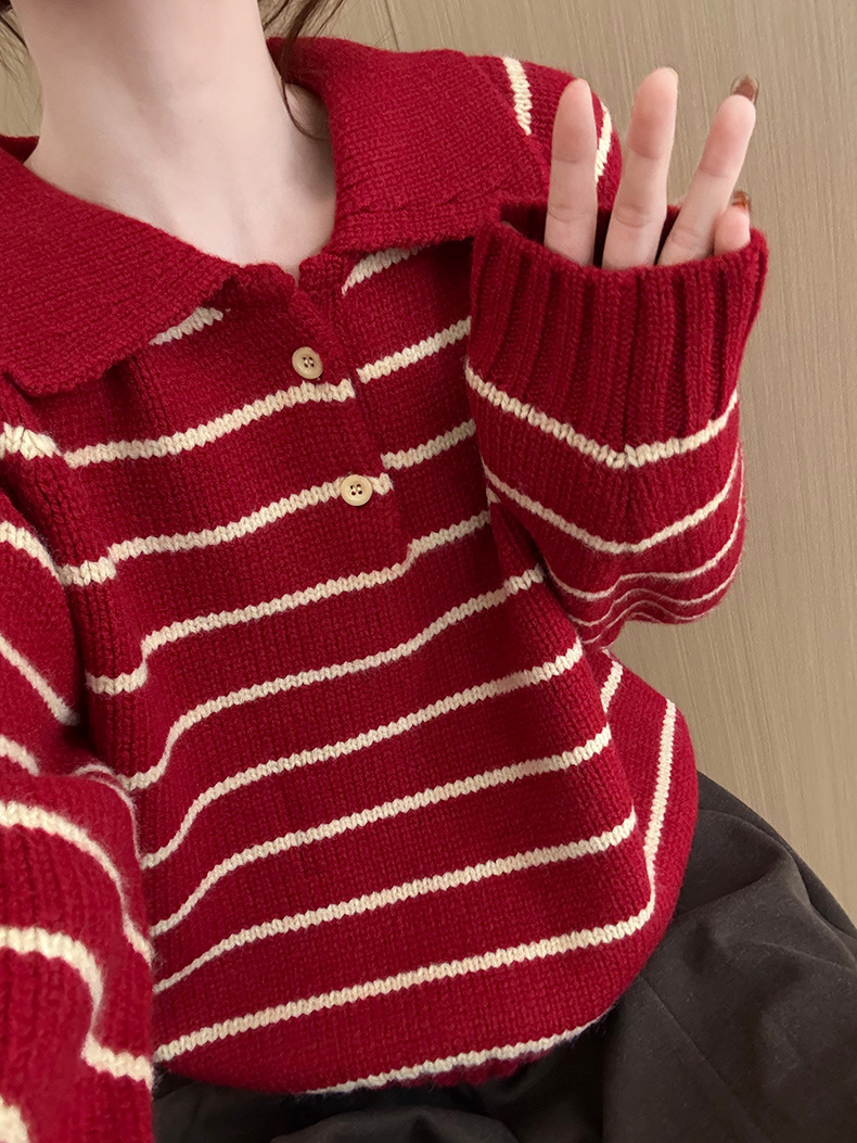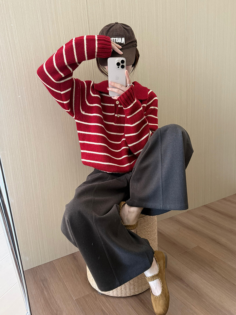 YS韩系撞色条纹polo领女毛衣2025秋冬宽松显瘦时尚针织衫外套上衣