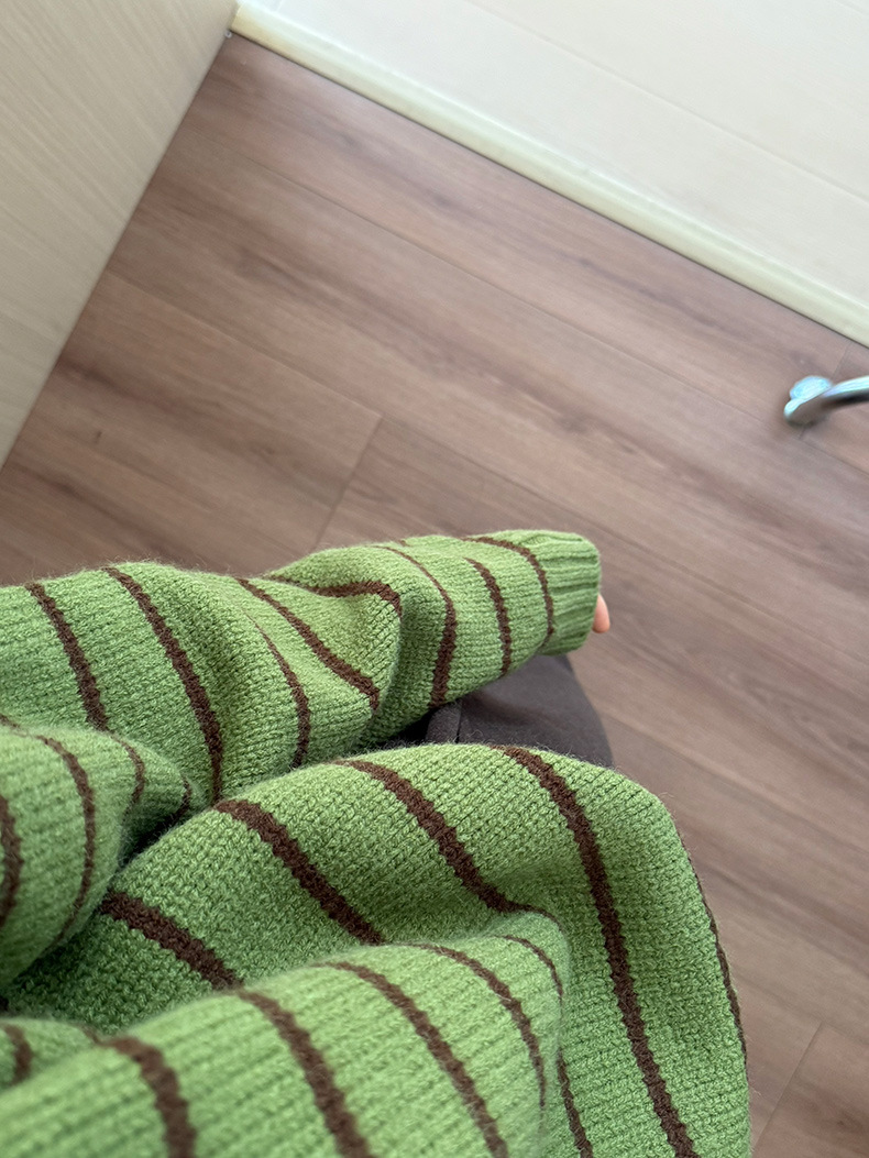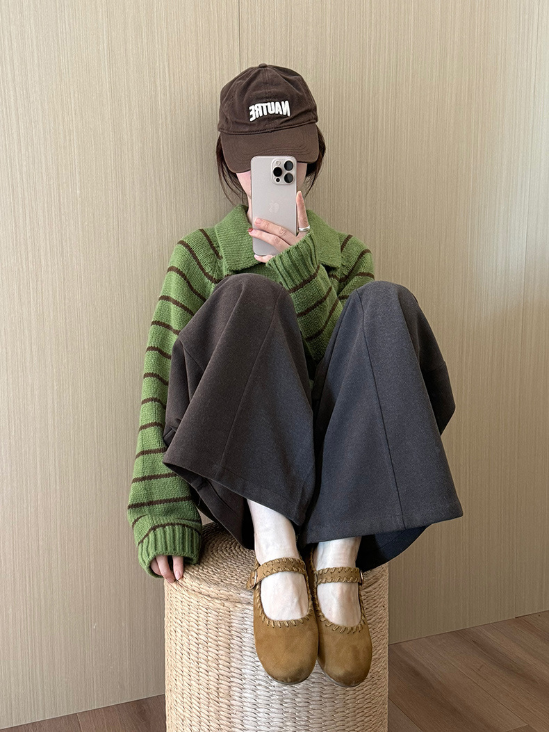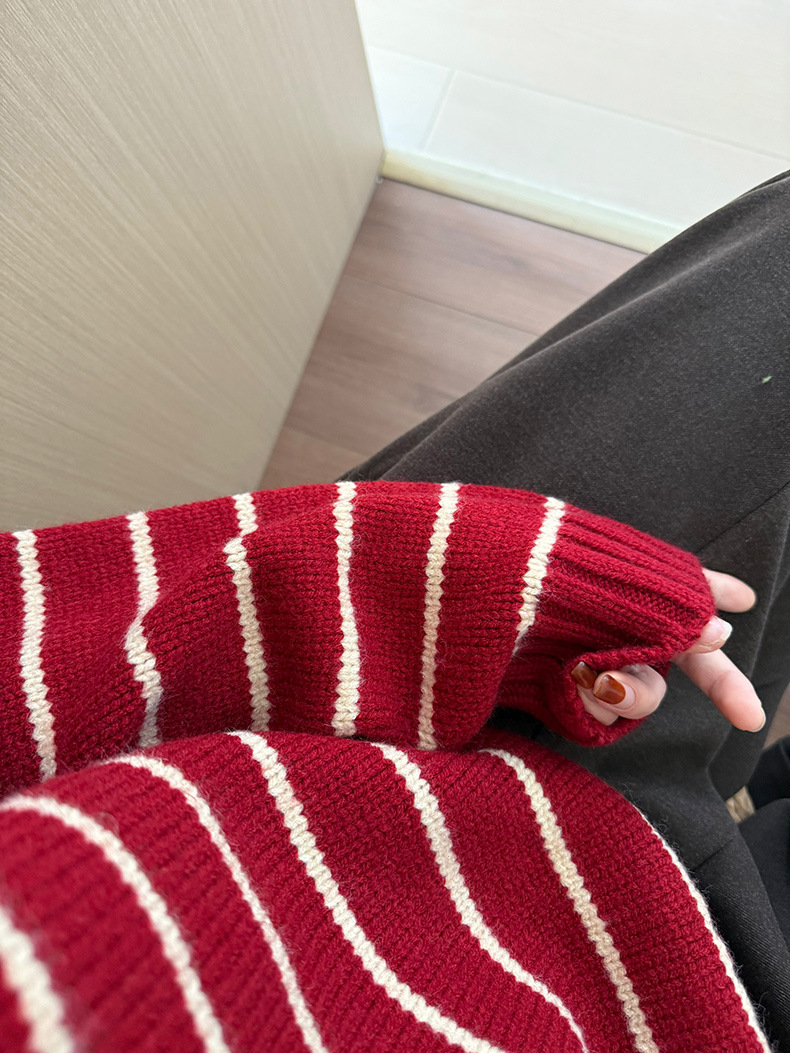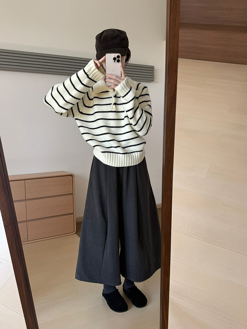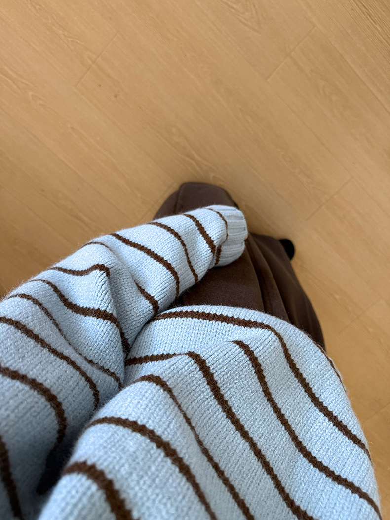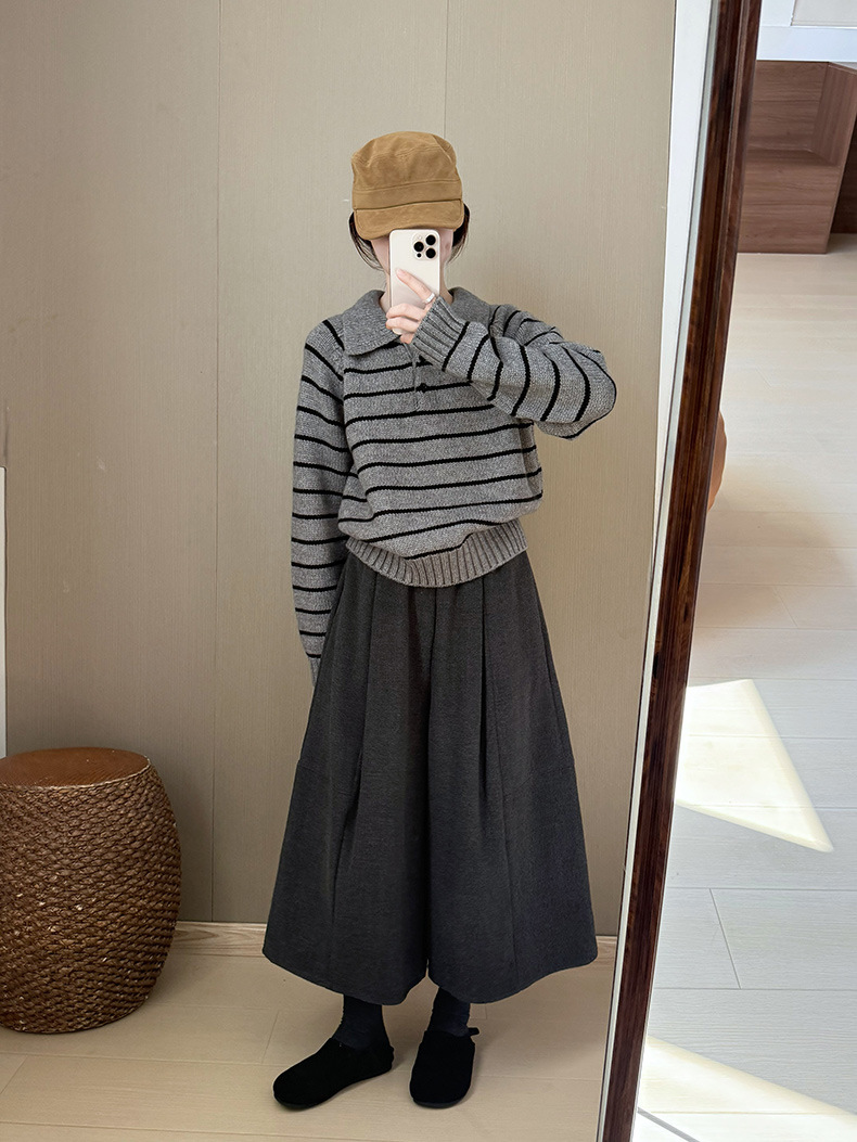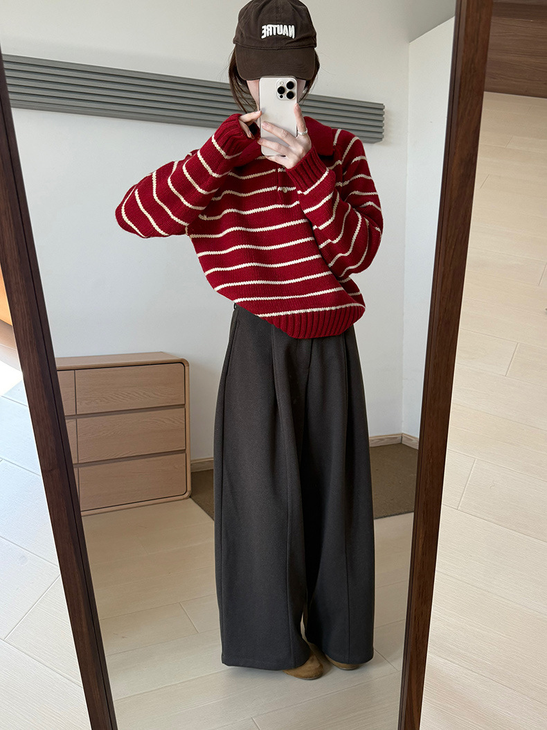 YS韩系撞色条纹polo领女毛衣2025秋冬宽松显瘦时尚针织衫外套上衣