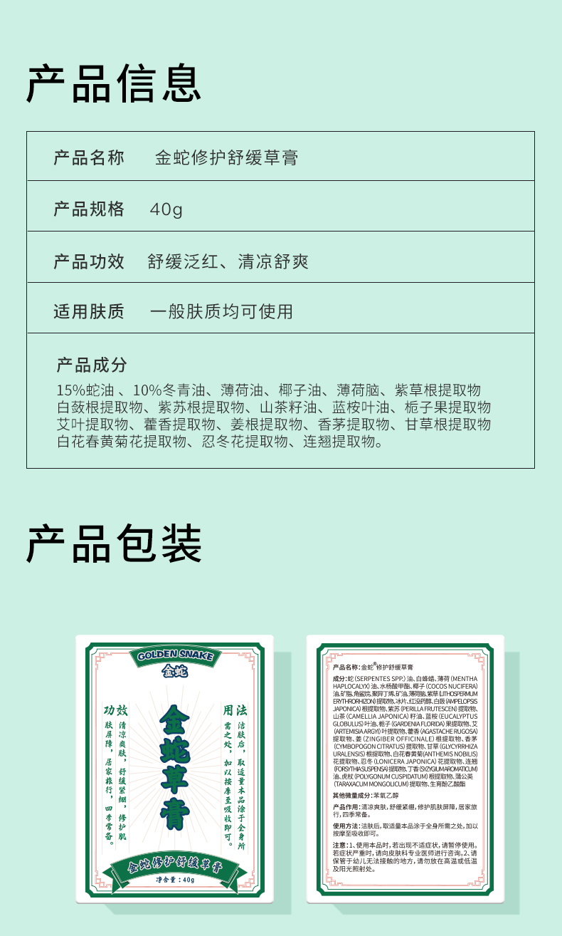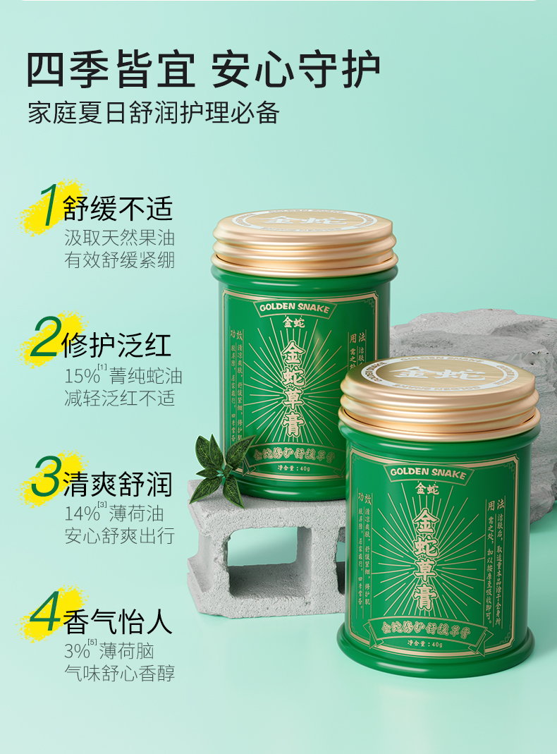 【品名】【百年老国货 驱蚊止痒】金蛇 修护舒缓草膏 清爽舒润 舒缓清凉 40g/支 【规格】40g/支 【产地】国内 【发货包装】独立包装 【发货地】广东 【发货快递】申通 【补邮费地区】新疆、西藏、内蒙古、宁夏、甘肃、青海+5元 【发货时效】48-72小时,周末节假日顺延 |