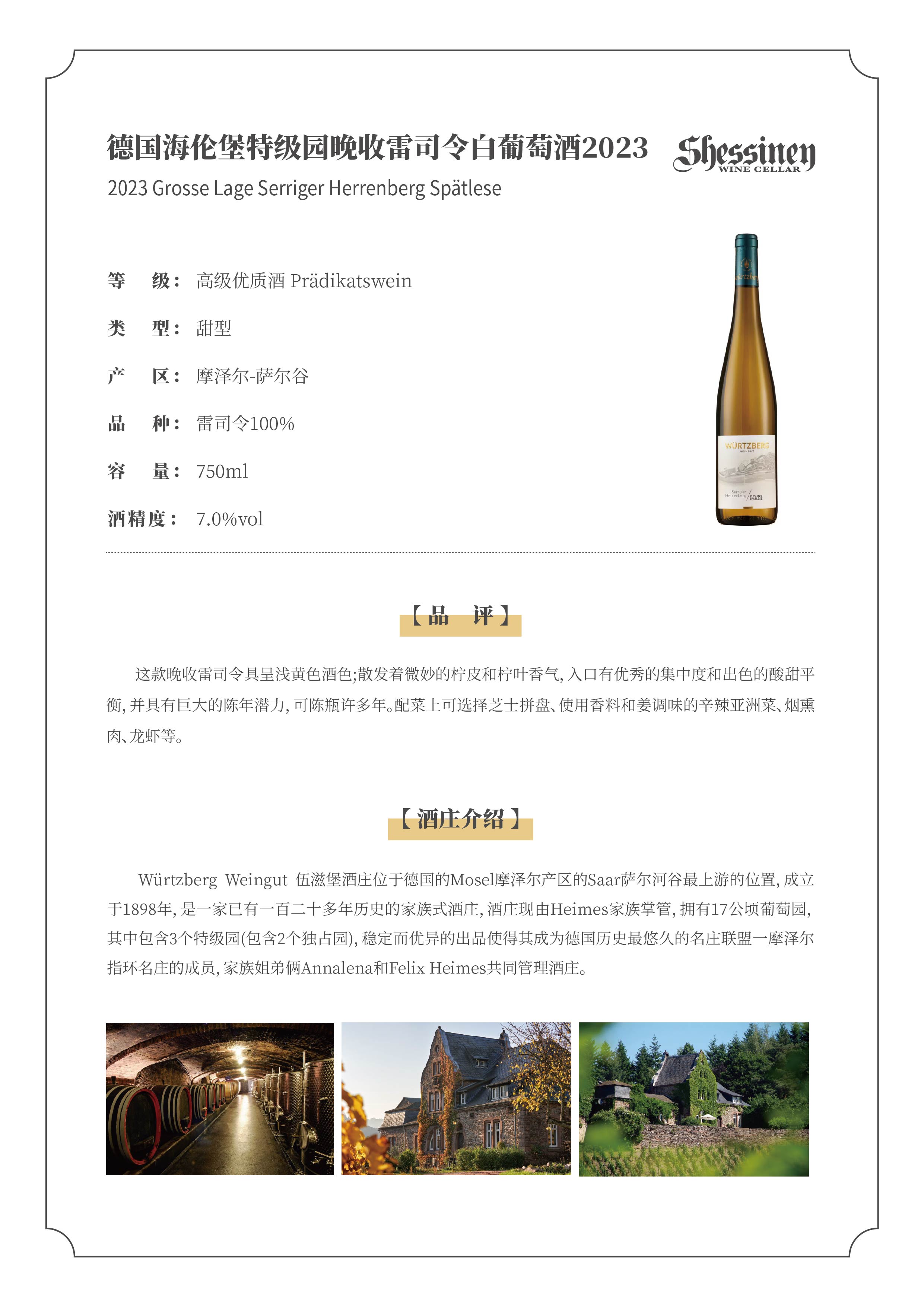 德国伍滋堡酒庄海伦堡特级园晚收雷司令白葡萄酒