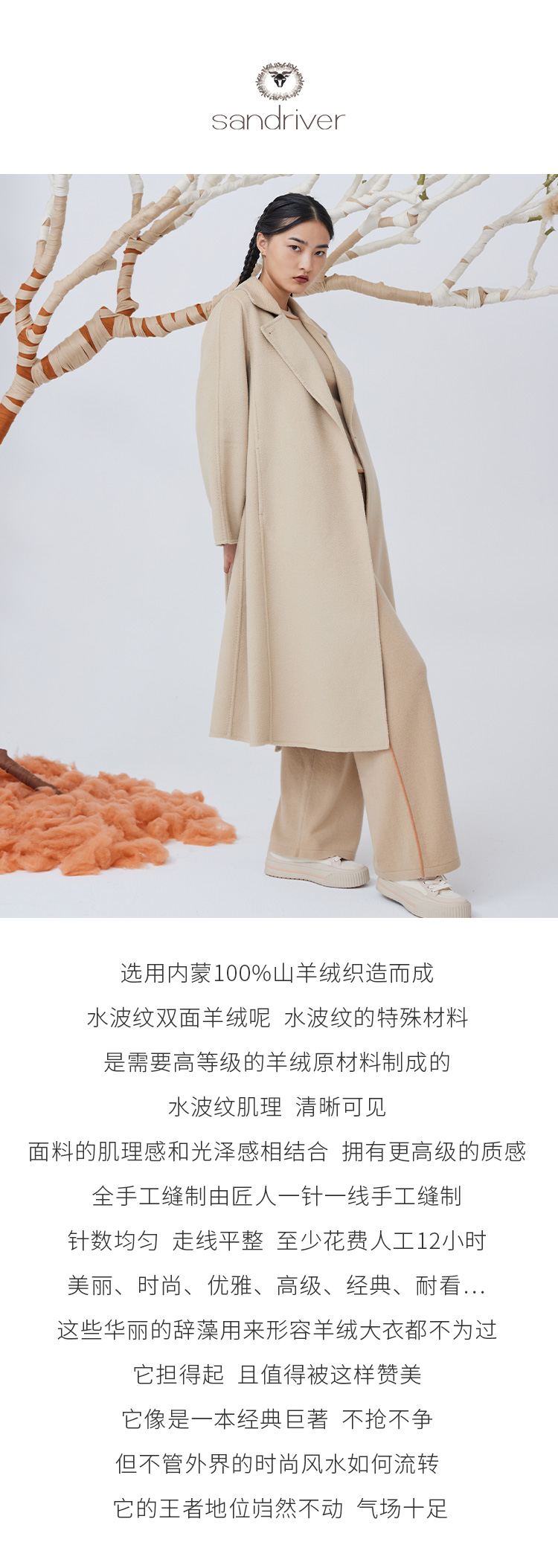 历年在巴黎时装周亮相,享誉世界的艺术羊绒品牌[Sandriver 沙涓]由羊绒布道者郭秀玲女士创立。阿拉善自有牧场纯种羔羊绒,日本国宝设计师小筱顺子,上海自有基地精工细作。承载羊绒情怀,坚持匠人品质。