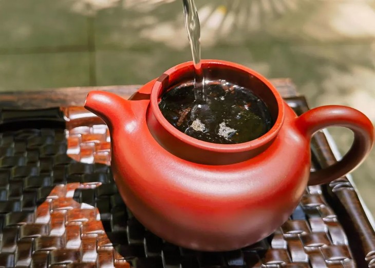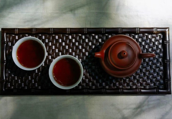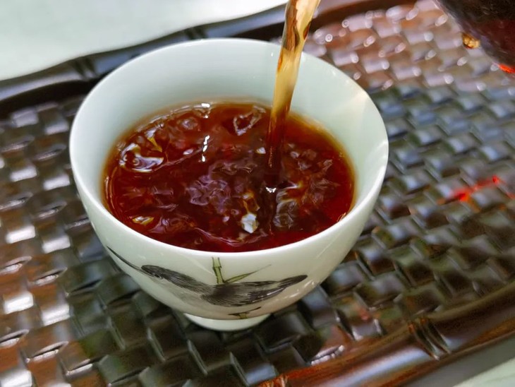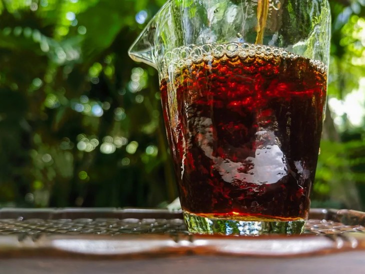 逆光观察汤色,质感似红酒,这是上乘熟普才有的颜色。