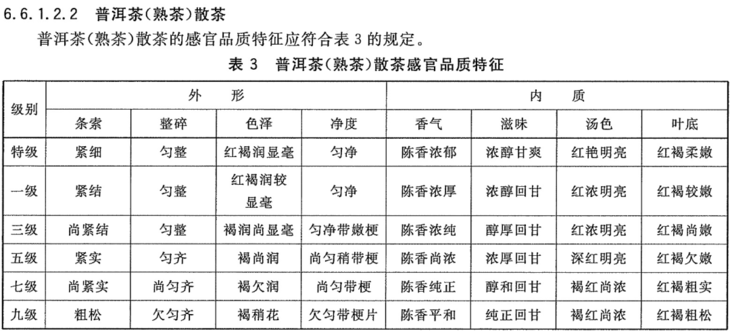 2003年制定的《云南省地方标准普洱茶》规定了普洱熟茶散茶的分级标准,2008年,国家质检总局颁布了最新也即是现行的《地理标志产品普洱茶国家标准》,进一步对熟茶的等级划分做出了规定。