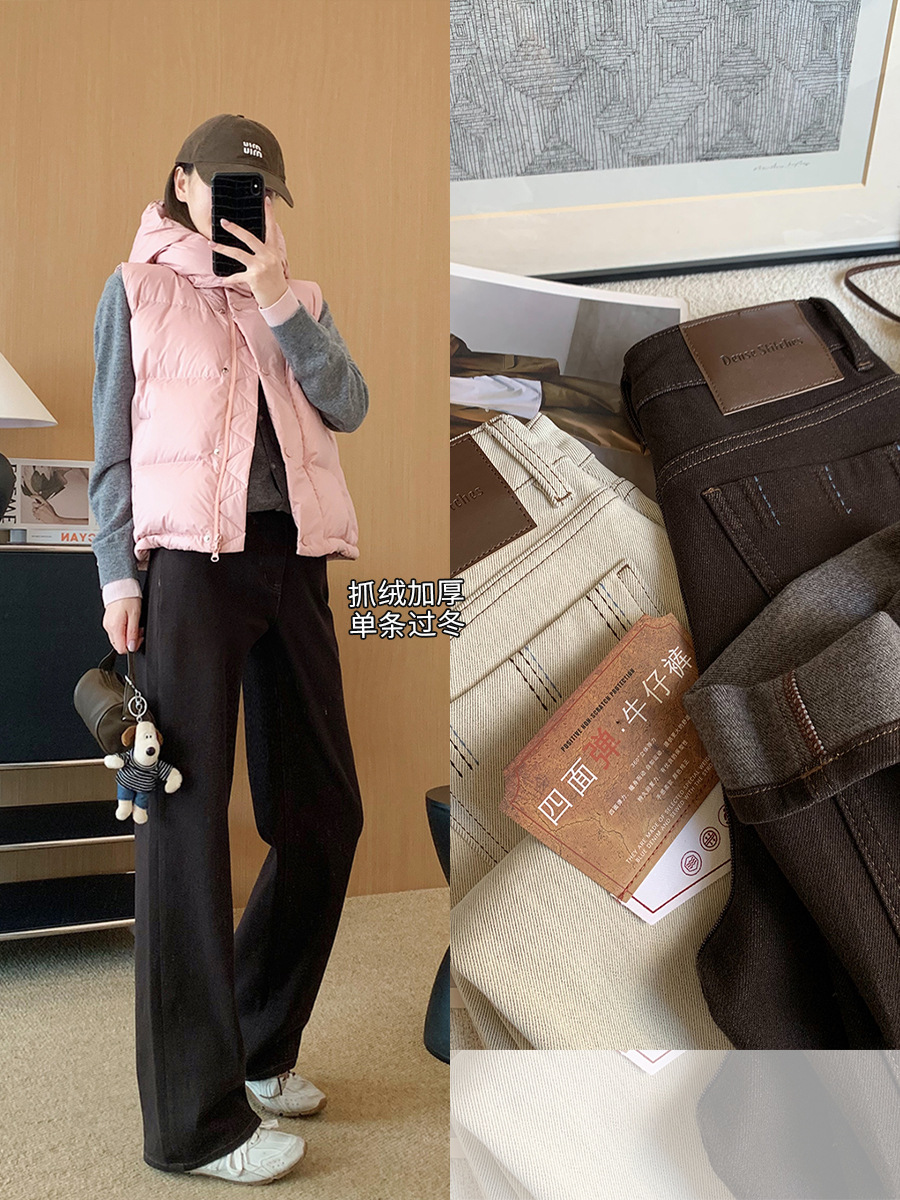 美拉德咖色和石灰白是四面弹植绒面料。底绒为暖咖绒横向竖向都有弹性。保暖显瘦不臃肿。