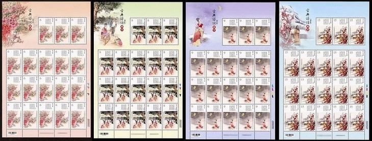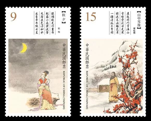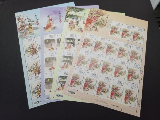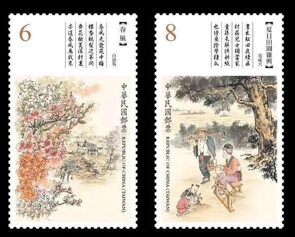 为推广古典文学,继2018年7月6日发行「古典诗词邮票」后,续以季节─春、夏、秋、冬为主题,选取〈春风〉白居易、〈夏日田园杂兴〉范成大、〈秋夕〉杜牧及〈山中雪后〉郑板桥4首七言绝句诗规划邮票1套4枚,诗句如下: