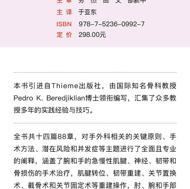 本书引进自Thieme出版社,由国际知名骨科专家Pedro K. Beredjiklian博士领衔编写,汇集了众多专家多年的实践经验与技巧。全书共十四篇88章,对手外科相关的关键原则、手术方法、潜在风险和并发症等主题进行了全面且专业的阐释,涵盖了腕和手的急慢性肌腱、神经、韧带和骨损伤的手术治疗,肌腱转位、韧带重建、关节置换术、截骨术和关节固定术等重建操作,肘、腕和手部的慢性肌腱病和神经嵌压的处理,关节炎、皮肤缺损、Dupuytren病和手部化脓性感染的手术技术,腕管综合征的内镜及关节镜技术等内容。本书视角独特、逻辑清晰、图片丰富,可帮助读者详细了解及掌握相关操作细节,可作为相关专业实习医师及住院医师的重要参考书,亦可供经验丰富的手外科医师在临床实践中查阅借鉴。