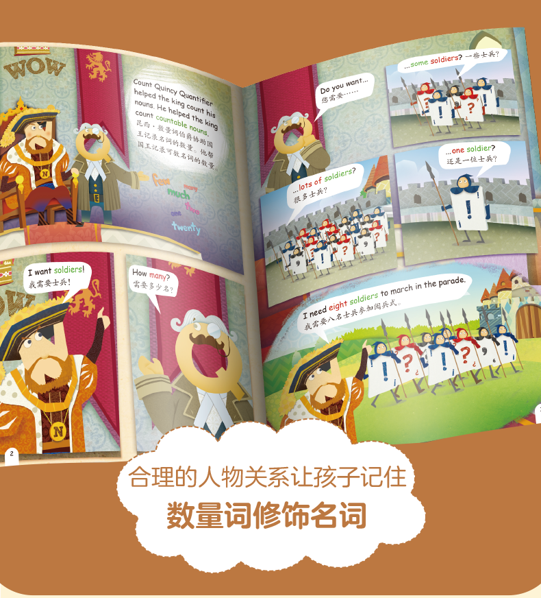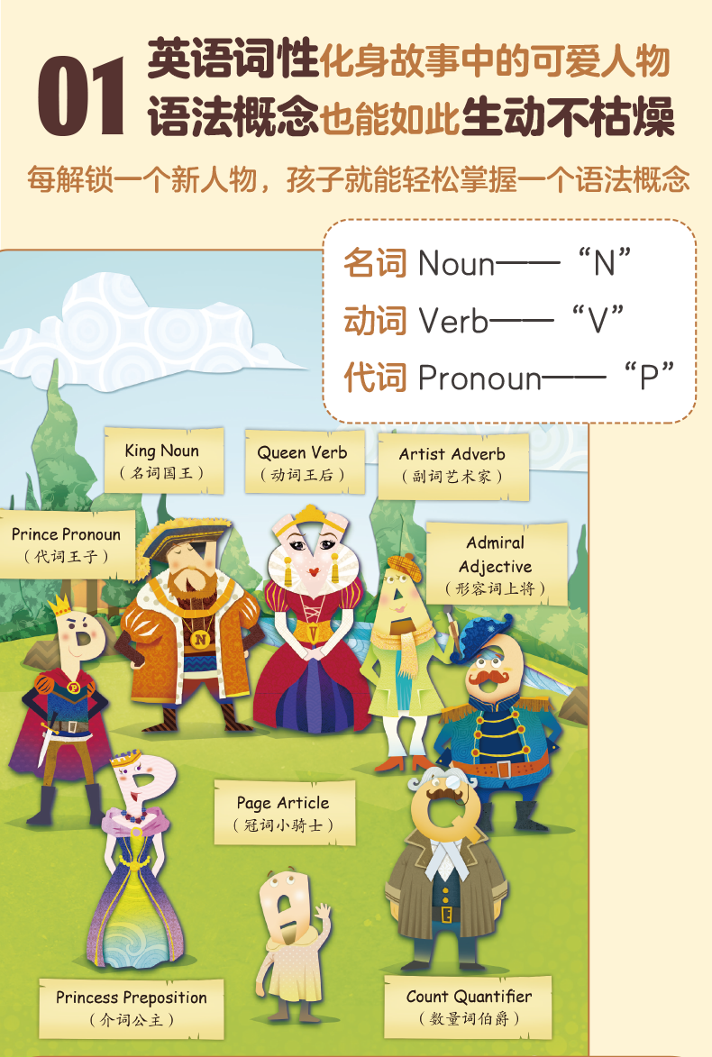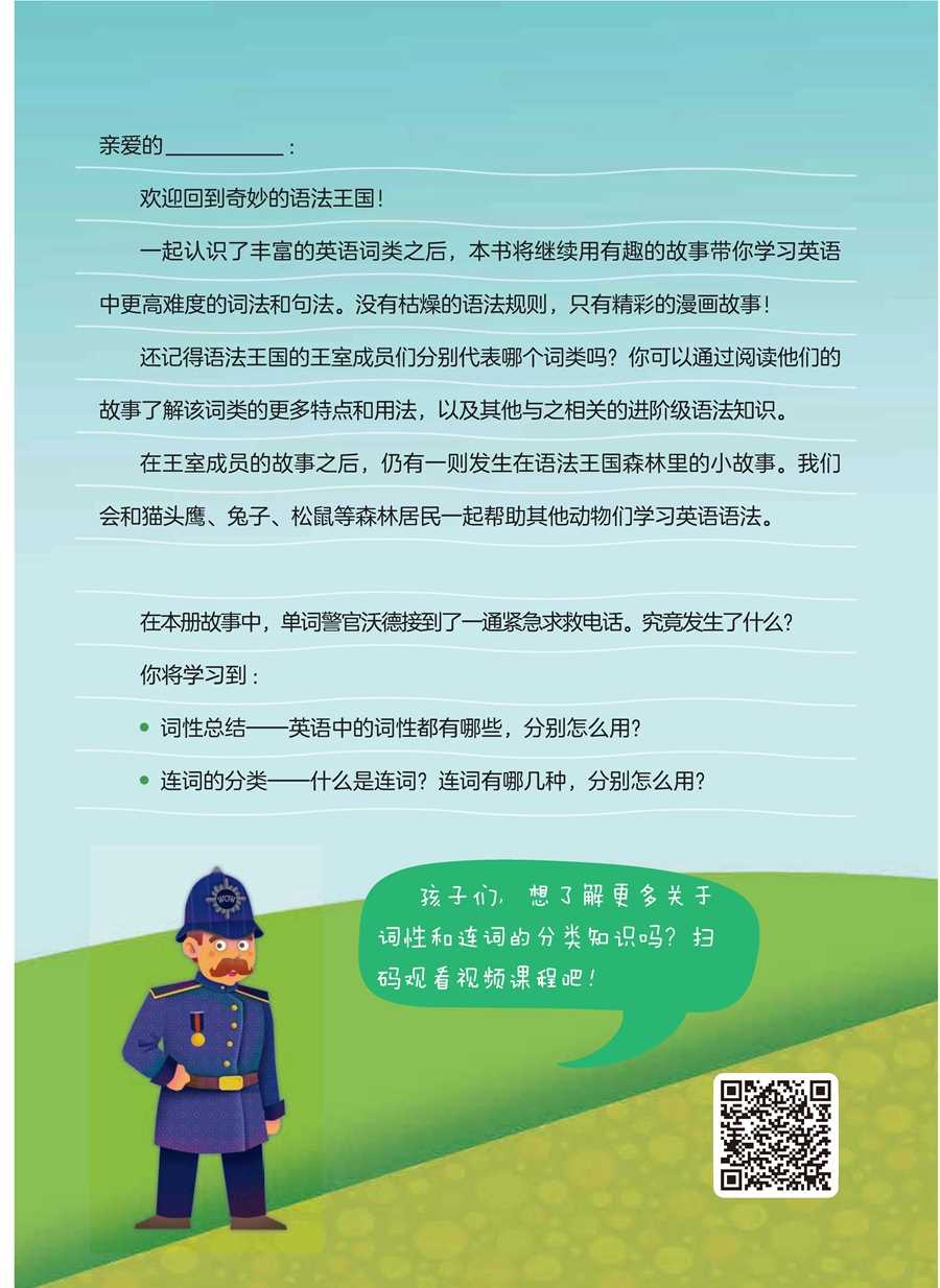 亲爱的___________:欢迎回到奇妙的语法王国! 一起认识了丰富的英语词类之后,本书将继续用有趣的故事带你学习英语中更高难度的词法和句法。没有枯燥的语法规则,只有精彩的漫画故事!还记得语法王国的王室成员们分别代表哪个词类吗?你可以通过阅读他们的故事了解该词类的更多特点和用法,以及其他与之相关的进阶级语法知识。在王室成员的故事之后,仍有一则发生在语法王国森林里的小故事。我们会和猫头鹰、兔子、松鼠等森林居民一起帮助其他动物们学习英语语法。