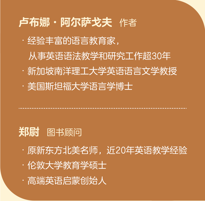 卢布娜阿尔萨戈夫,博士,一名经验丰富的语言教育家,新加坡南洋理工大学英语语言文学教授。她在改善学校语法教学和教师教育方面的工作尤其著名。她曾任新加坡国家教育学院英语语言文学系主任,并出版了多部供教师和学员使用的语法著作,深受读者欢迎。她拥有美国斯坦福大学语言学博士学位,从事英语语法教学和研究工作超30年。