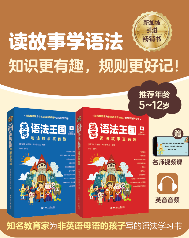 《英语语法王国:句法故事真有趣》是一套基于故事的小学语法读物。在奇妙语法王国,每位王室成员都代表着一个词类名词、动词、代词、副词等。这套书将通过他们的冒险故事和丰富的互动练习帮助孩子学习语法,同时丰富词汇、奠定英语阅读和写作基础。句法篇是词法篇故事的续写,共10本。它延用了语法王国中代表各种词性的人物,通过趣味故事和全彩漫画带领孩子了解更复杂的语法现象、学习进阶级语法知识。每本书都配有名师视频讲解课程,能帮助孩子更好地理解故事中涵盖的语法规则,协助孩子复习和巩固已学的知识点。