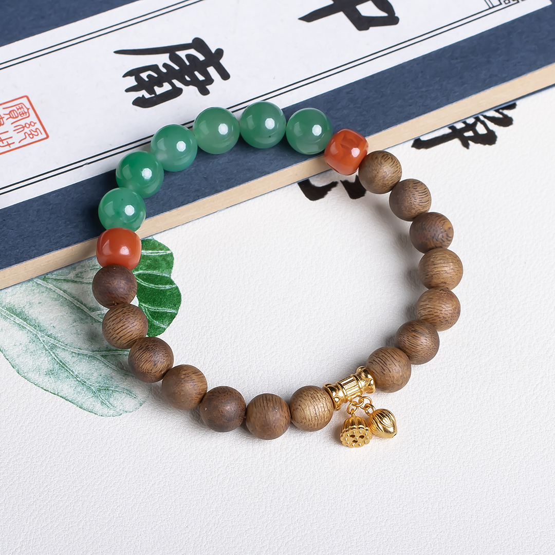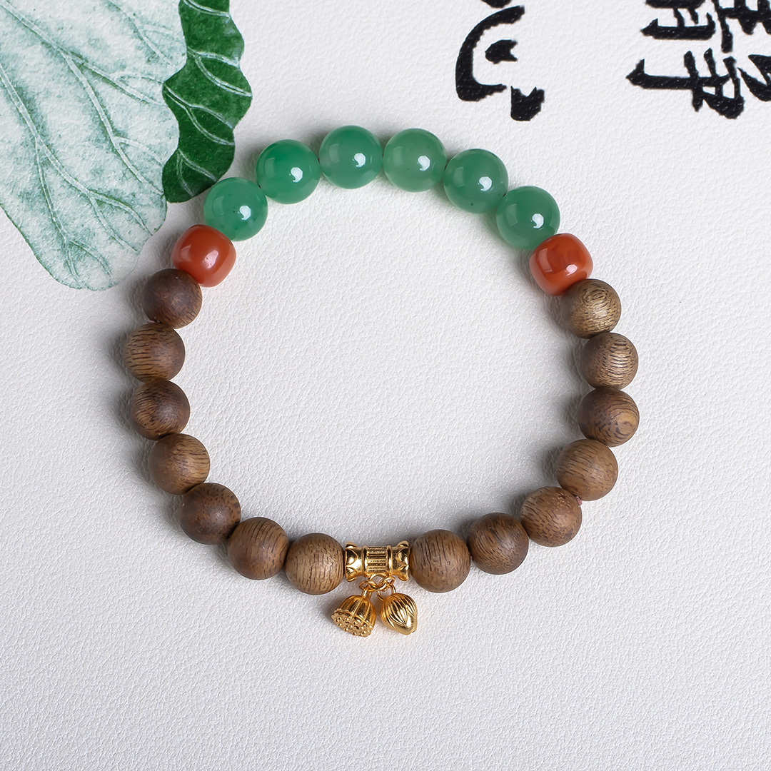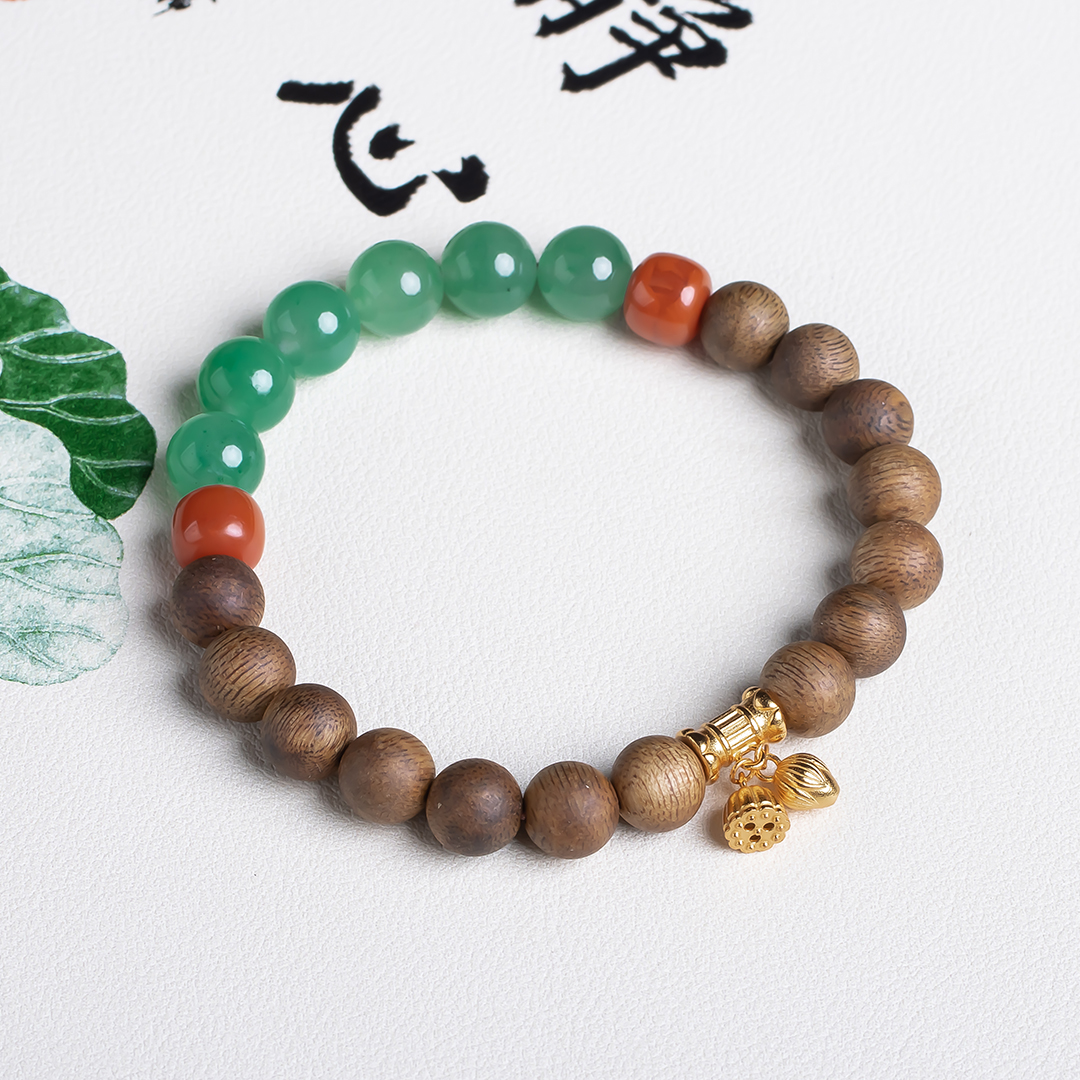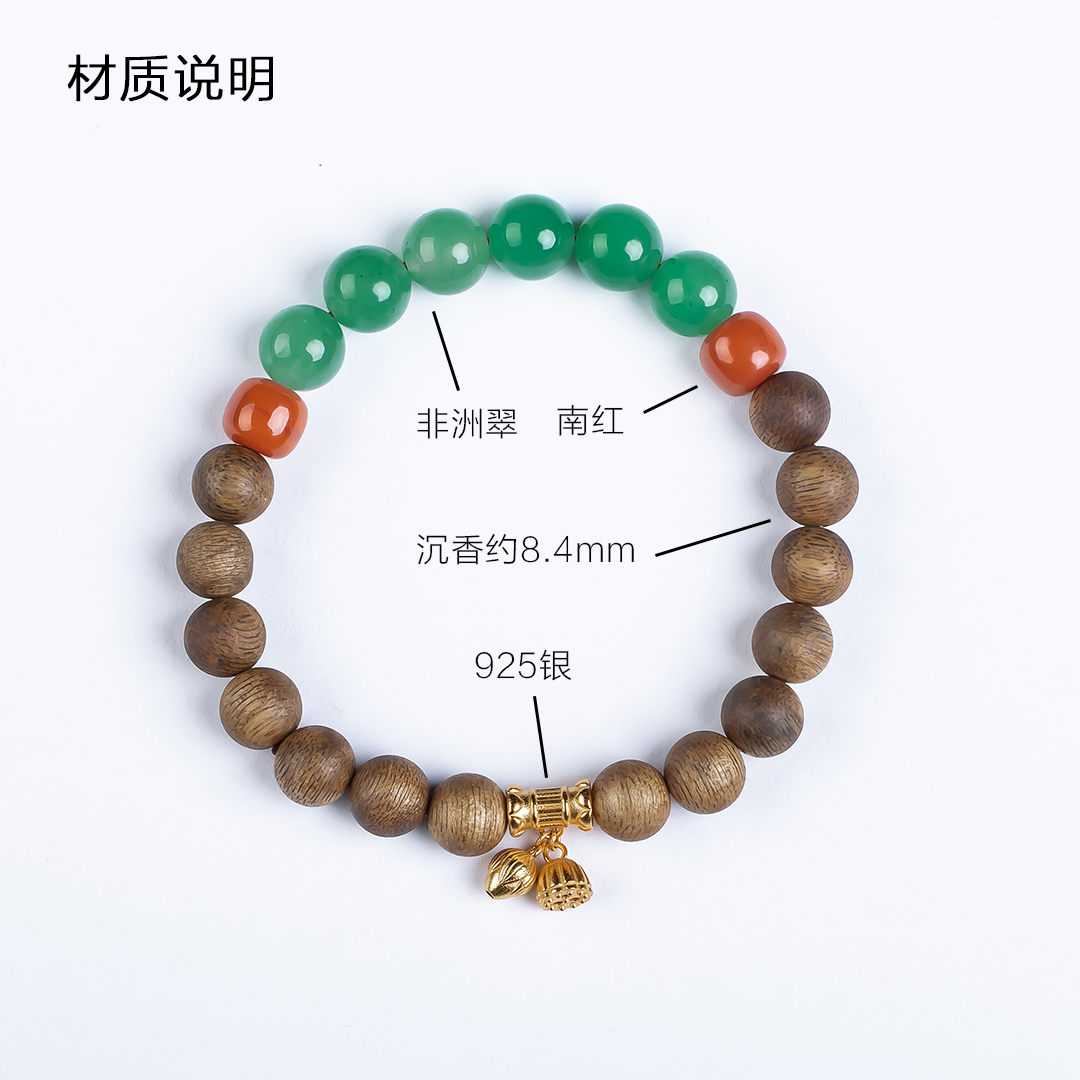xy055沉香+南红非洲翠手串,天然沉香约8.4mm,原色原味,香味自然清甜,南红非洲翠小半圈,红翠相映,一枚925银莲蓬子小提溜,款式简约大方,寓意,事业丰收。