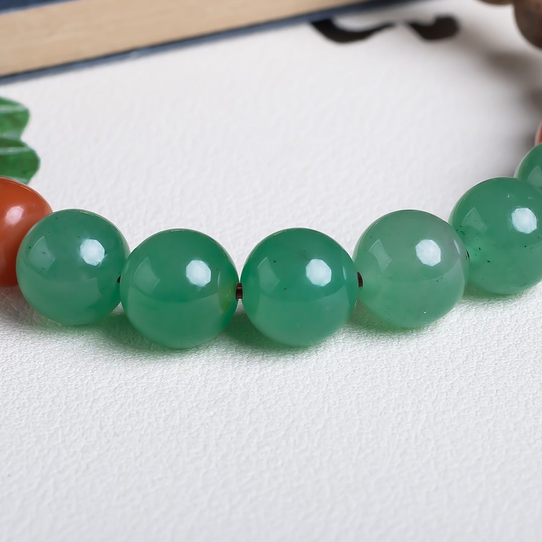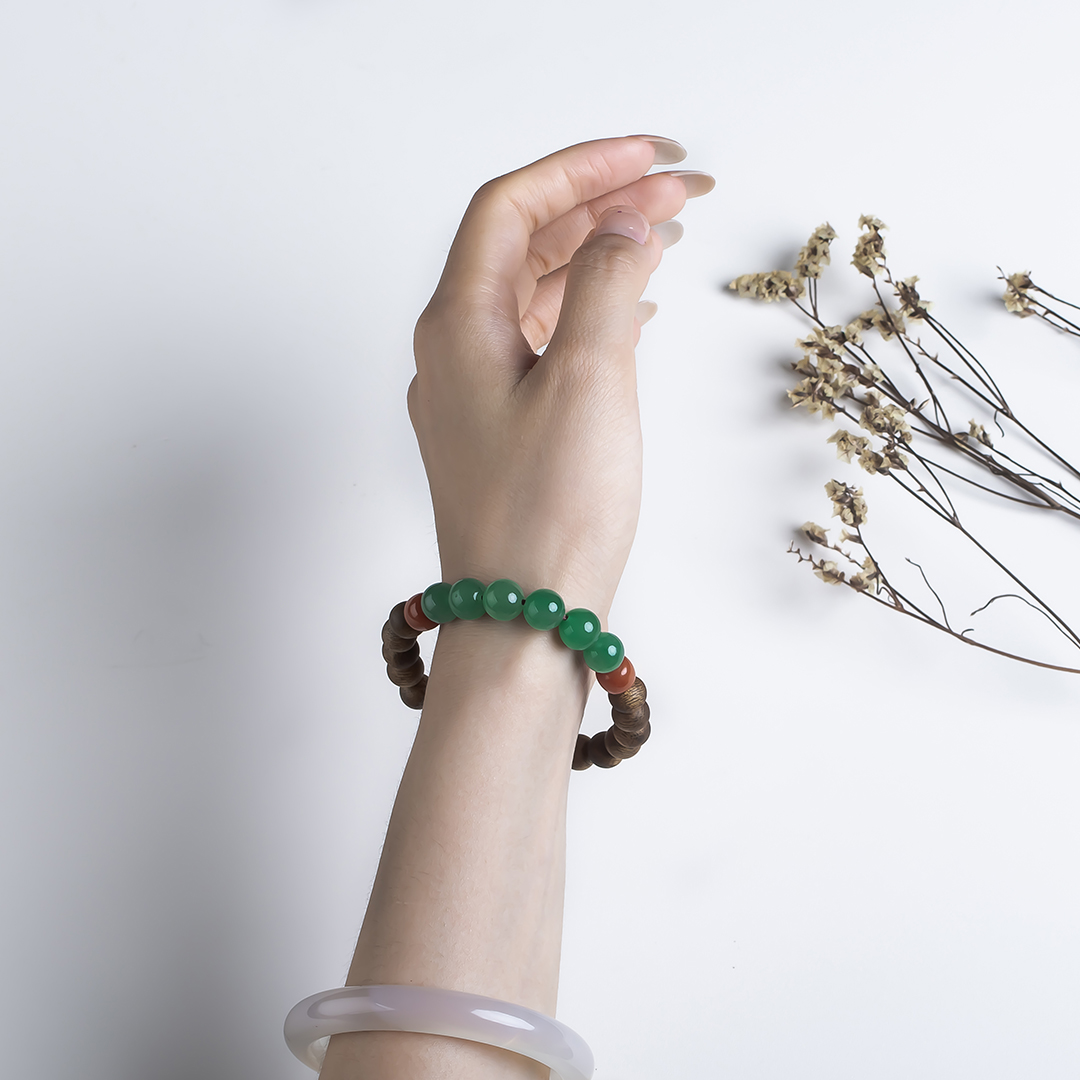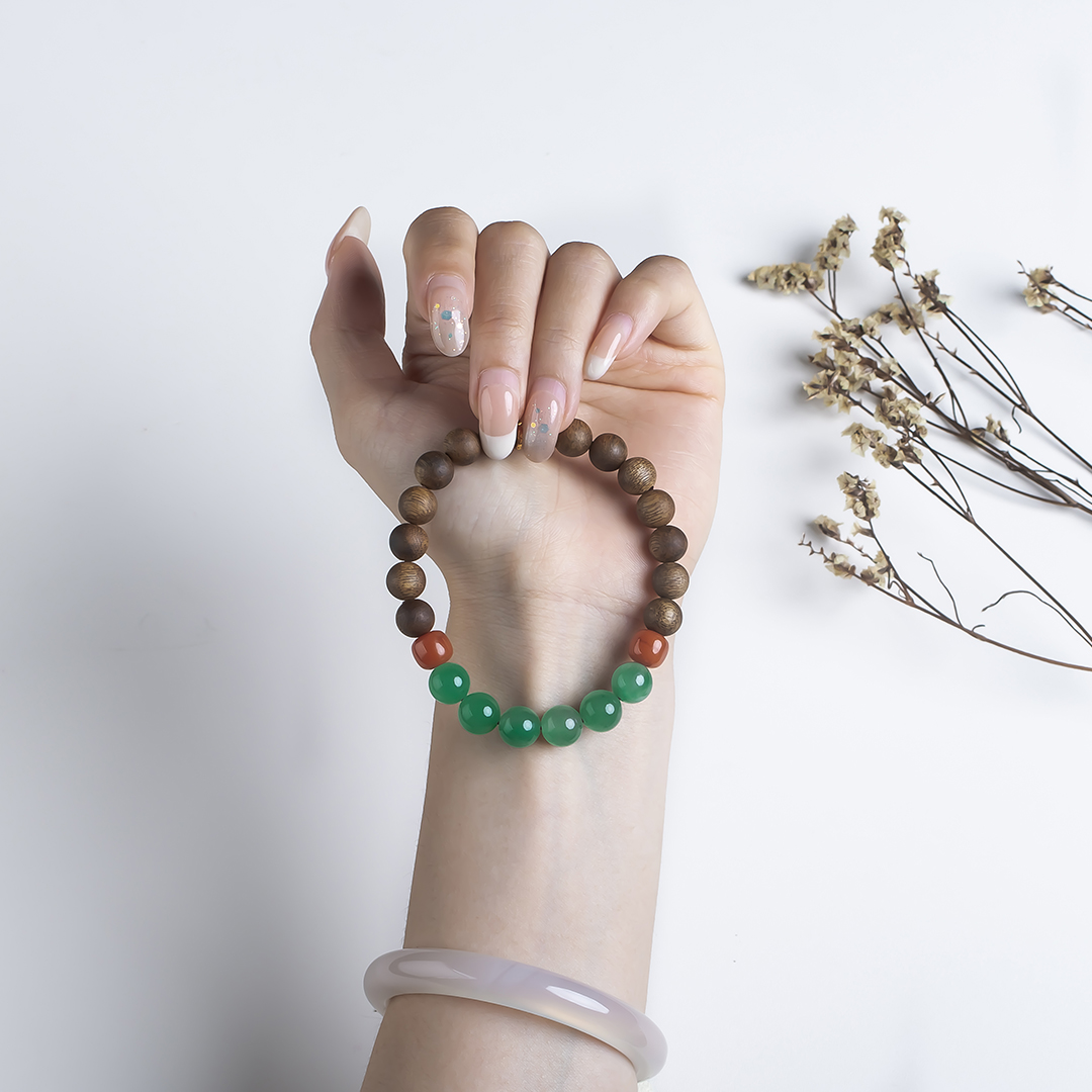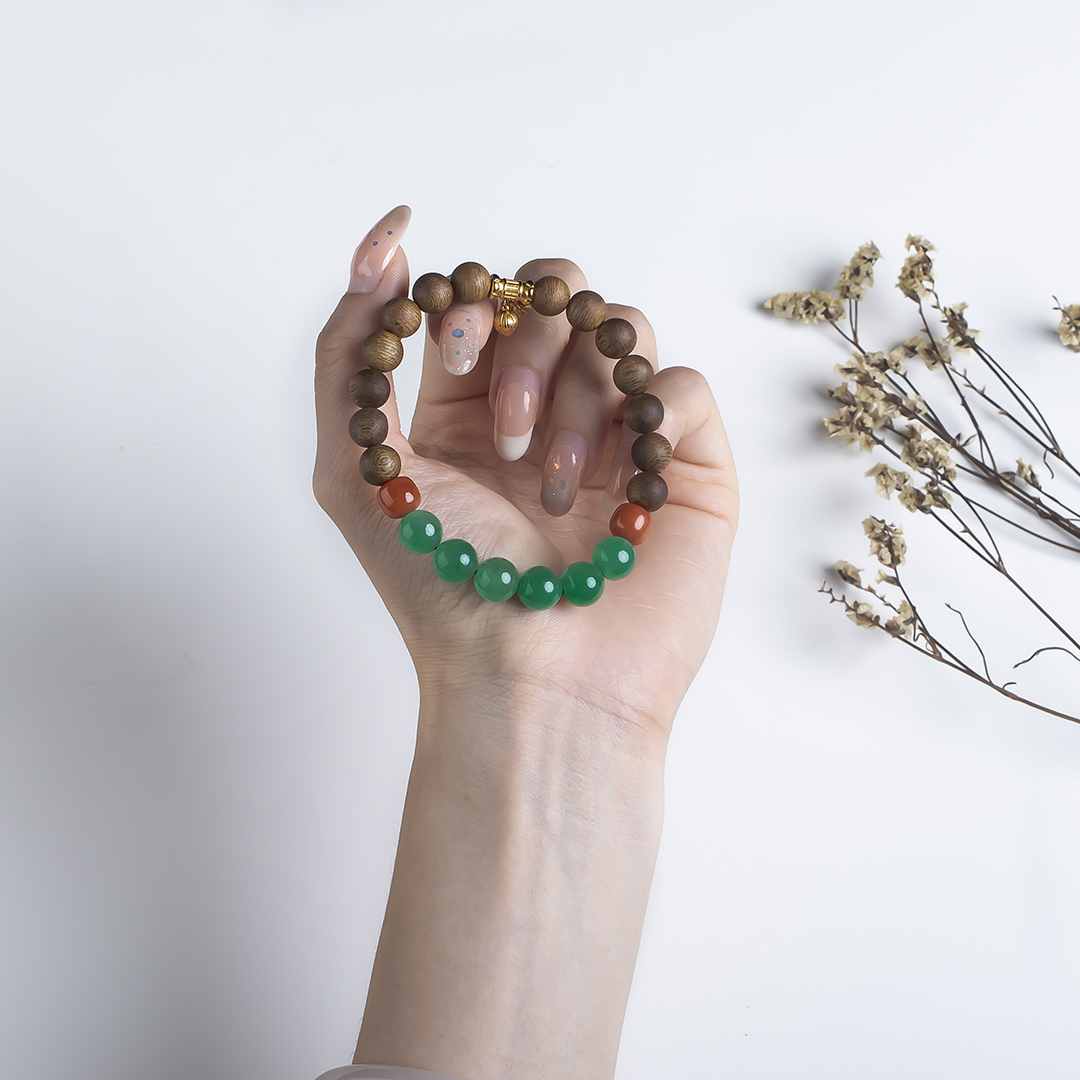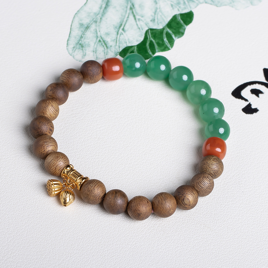 xy055沉香+南红非洲翠手串,天然沉香约8.4mm,原色原味,香味自然清甜,南红非洲翠小半圈,红翠相映,一枚925银莲蓬子小提溜,款式简约大方,寓意,事业丰收。