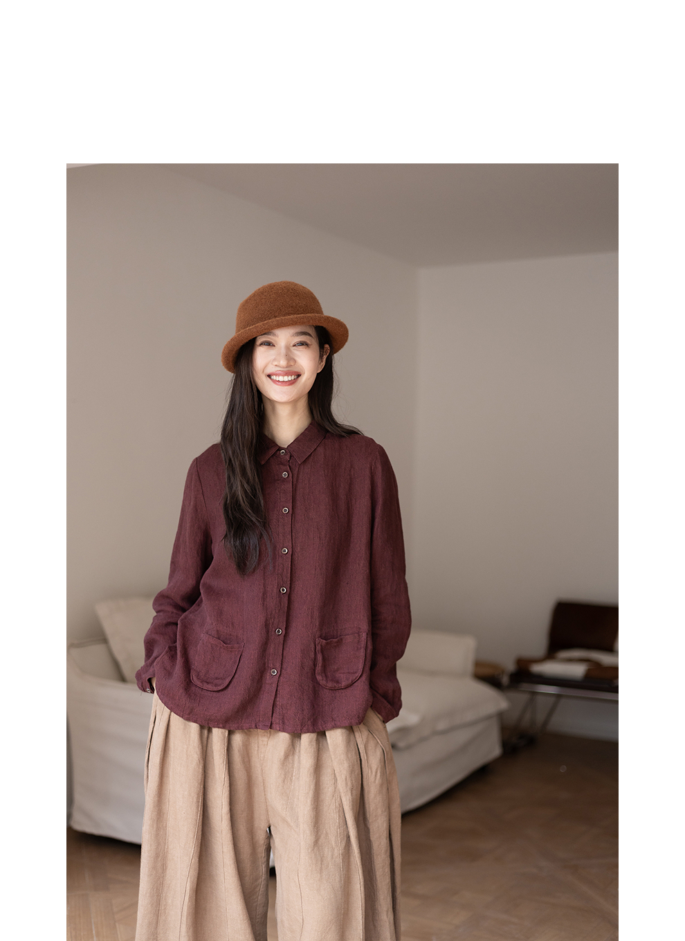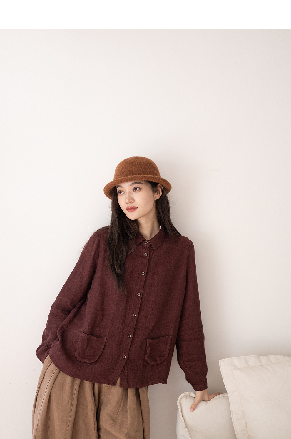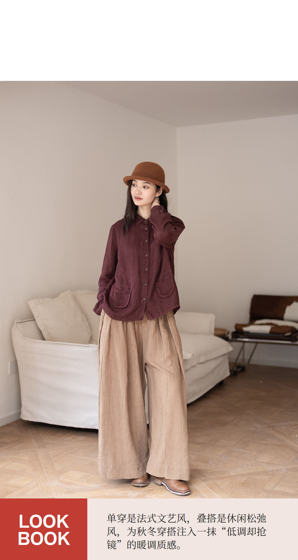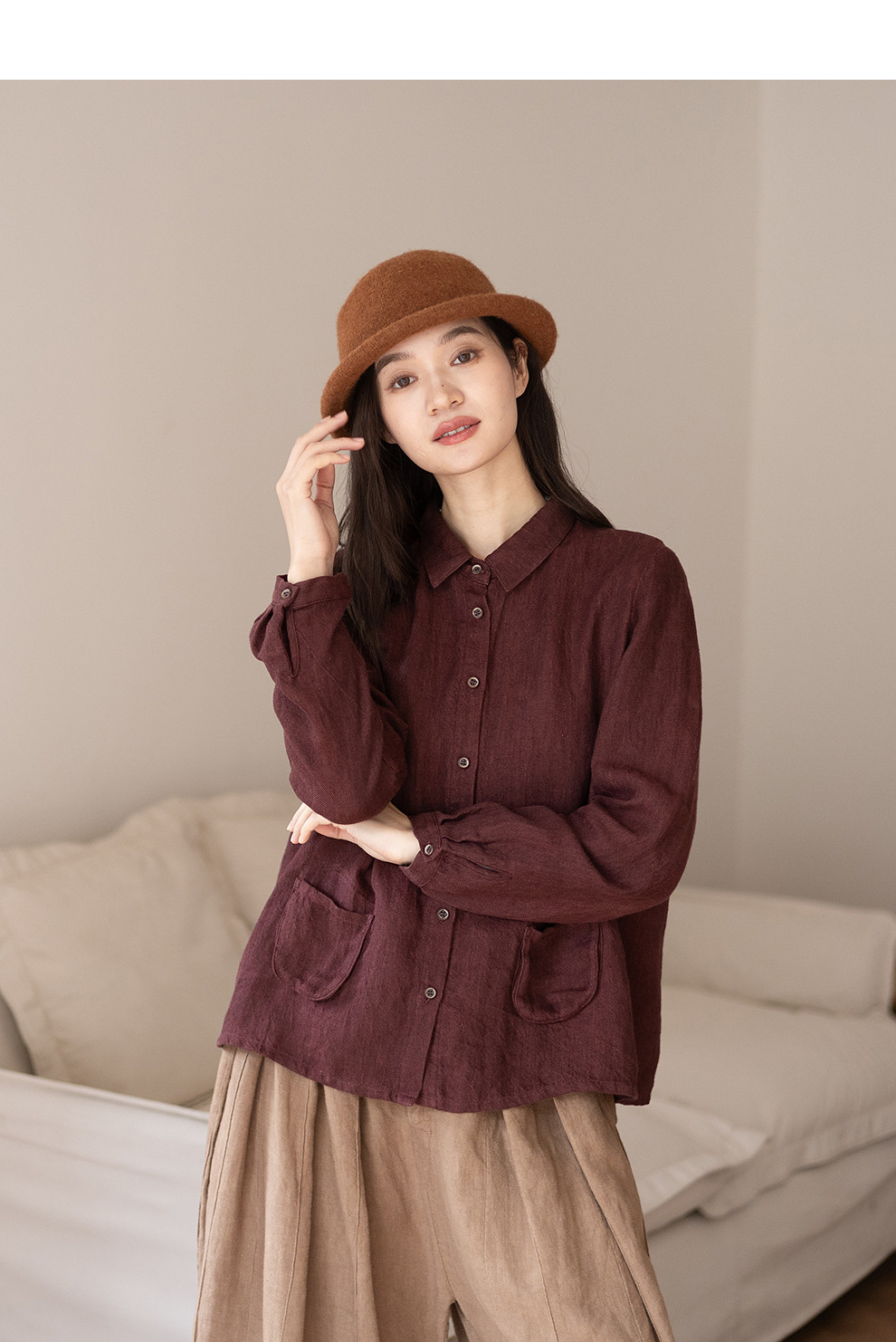 绽放799朵/色织亚麻法式文艺翻领长袖小口袋衬衫秋冬新款叠搭小衫