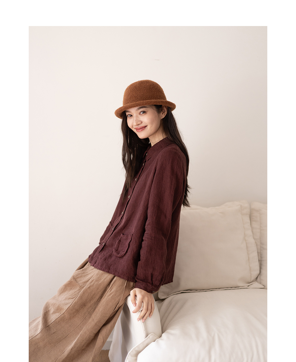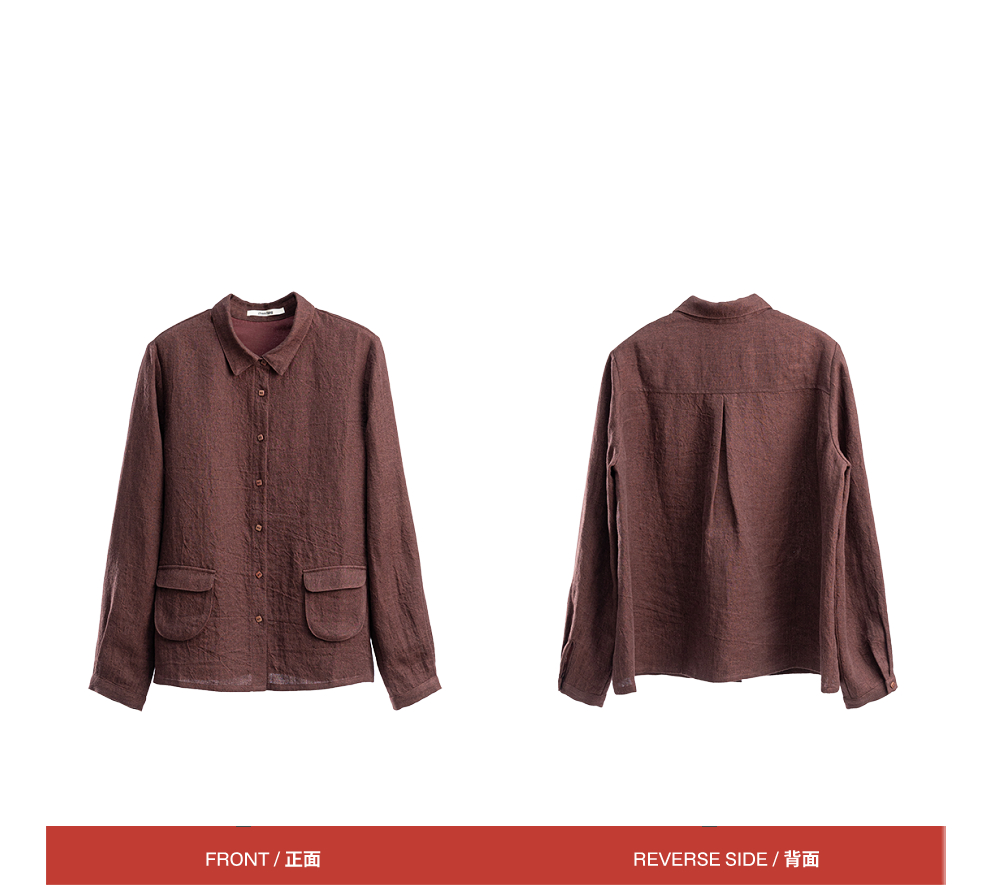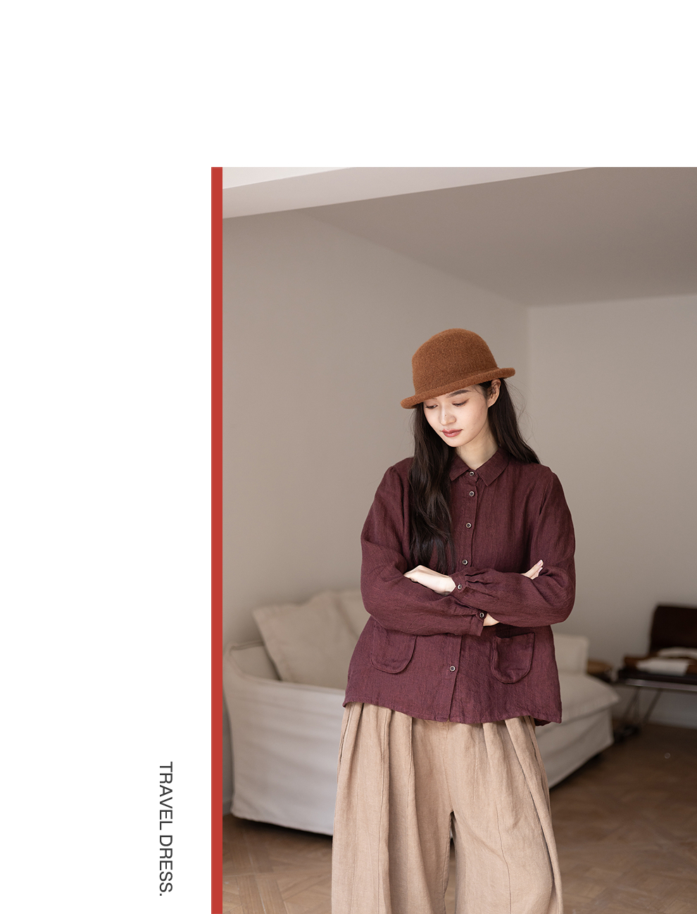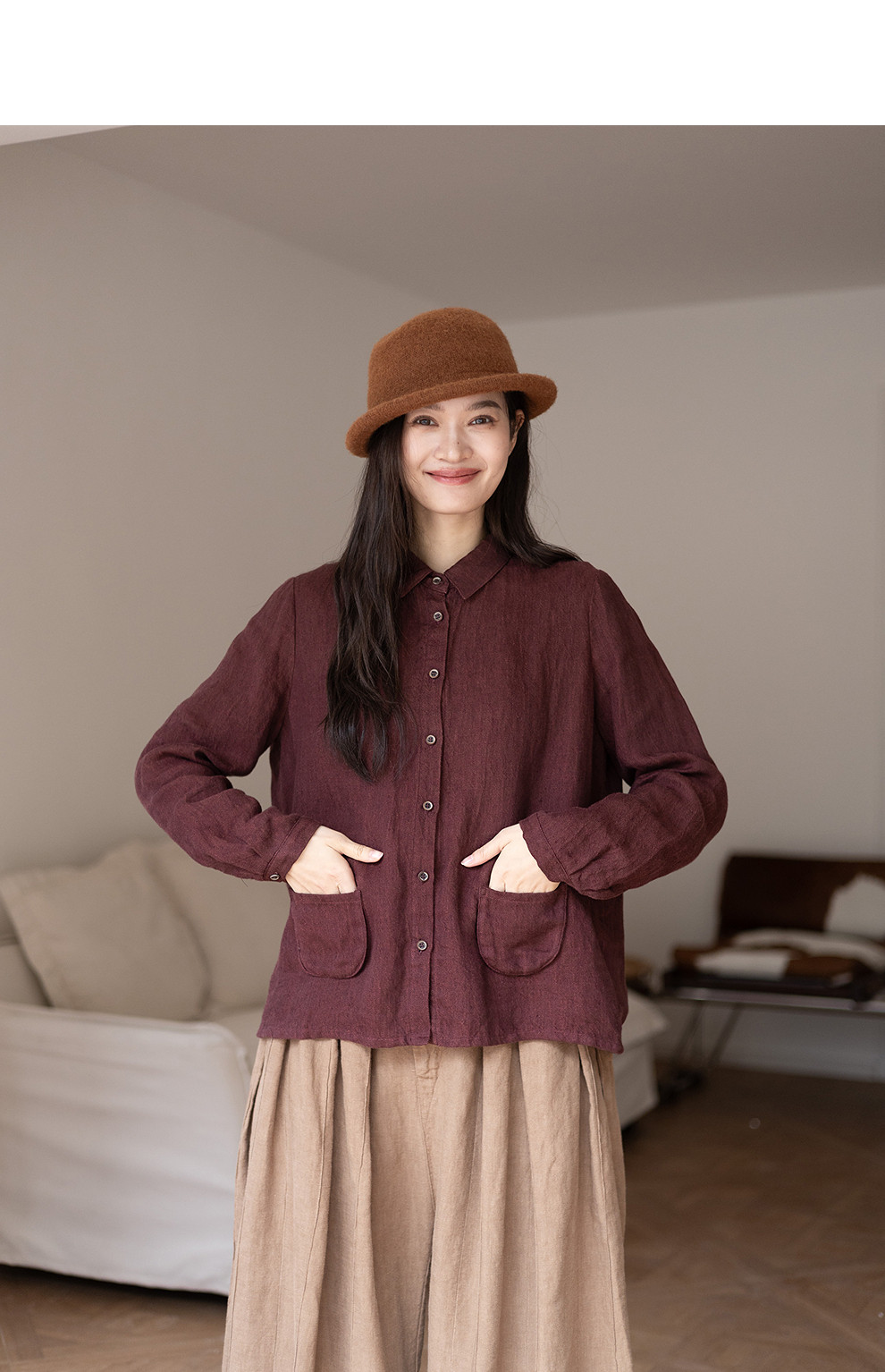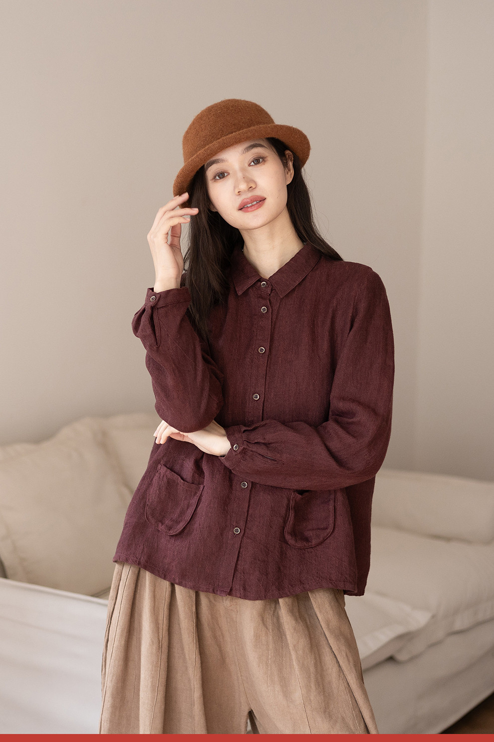 绽放799朵/色织亚麻法式文艺翻领长袖小口袋衬衫秋冬新款叠搭小衫
