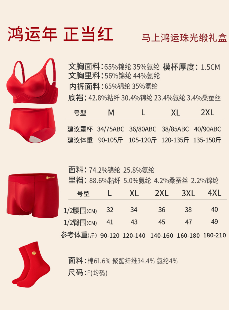 【品名】MEINS/梅因斯 “马上鸿运”珠光缎情侣内衣/内裤红品礼盒 男女款 【规格】 女士礼盒(文胸套装+红袜子1双+红包2个) 男士礼盒(2条男士内裤+红袜子2双+红包2个) 【尺码】 女士:M-2XL 男士:L-4XL 【产地】国内 【发货包装】独立包装 【发货地】浙江、广东随机发 【发货快递】中通、申通随机发 【补邮费地区】新疆、西藏+10元 【发货时效】48-72小时,周末节假日顺延 |