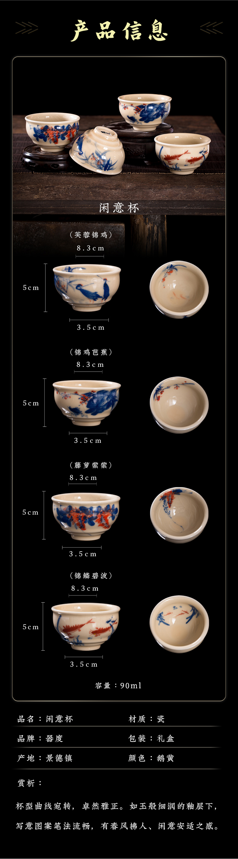 问鼎器度汝窑鹅黄青花闲意杯(芭蕉锦鸡)闲意杯(芙蓉锦鸡)(缺货)闲意杯(锦鳞碧波)(缺货)闲意杯(藤萝萦萦)(缺货)