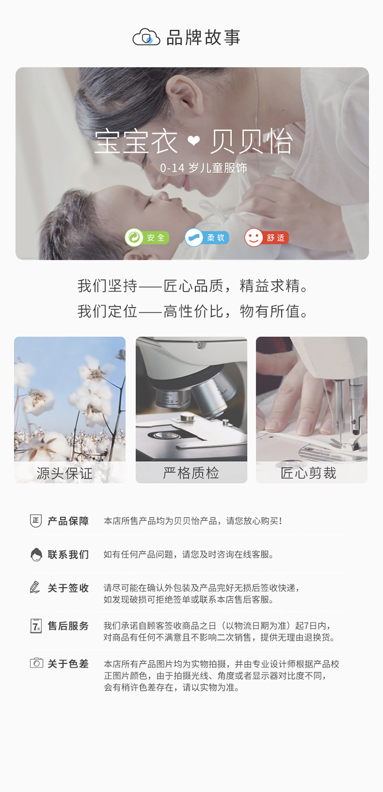 - 贝贝怡专注0-6岁婴幼儿服饰,坚持安全、柔软、舒适的产品理念,为千万中国家庭提供超高品质、安全可靠的婴幼儿服饰产品,妈妈放心,宝宝开心!