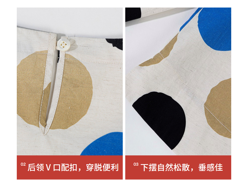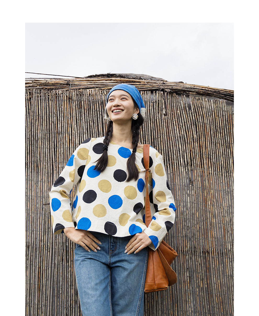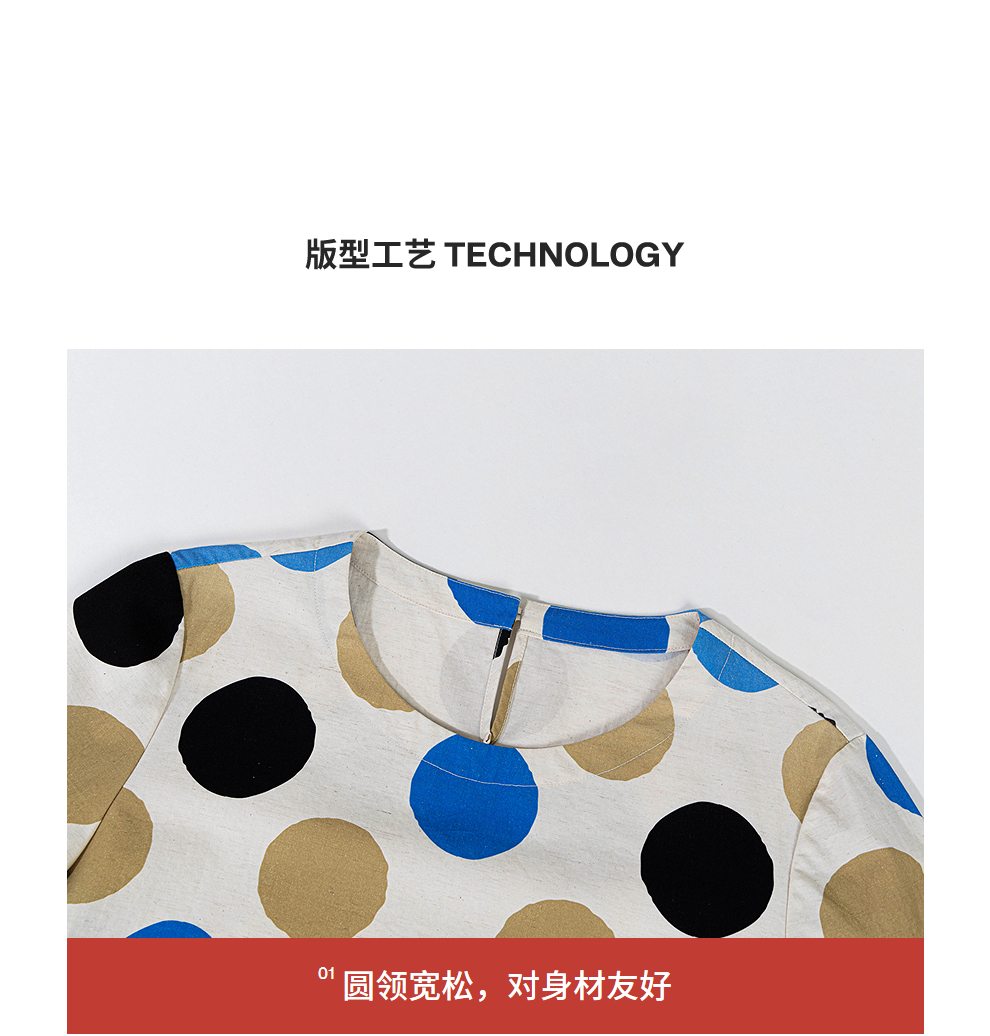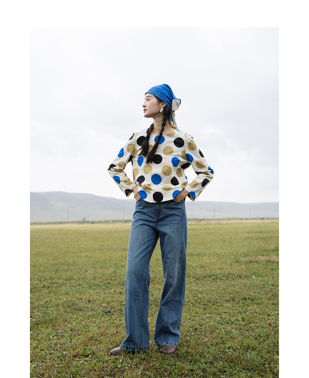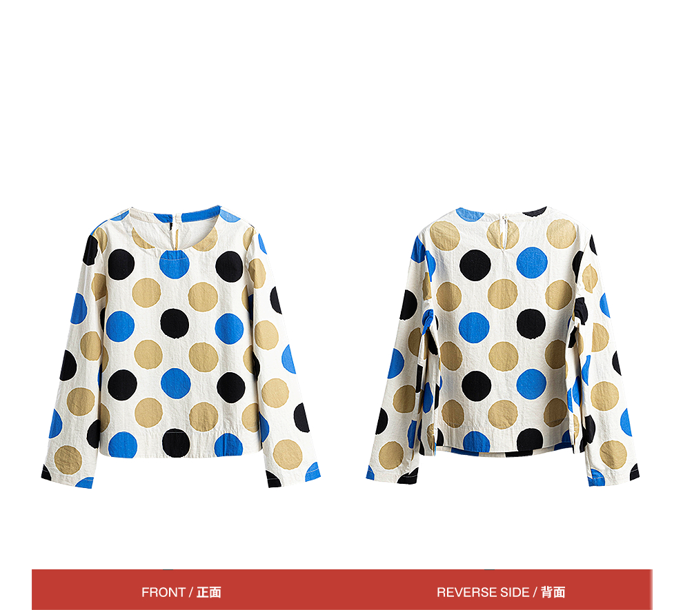 绽放635朵/进口麻灰色织棉底布波点印花垂感圆领宽松套头长袖T恤