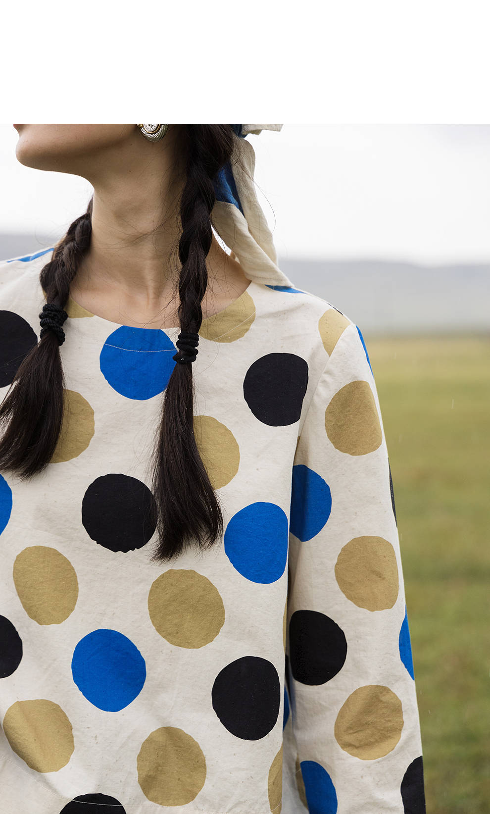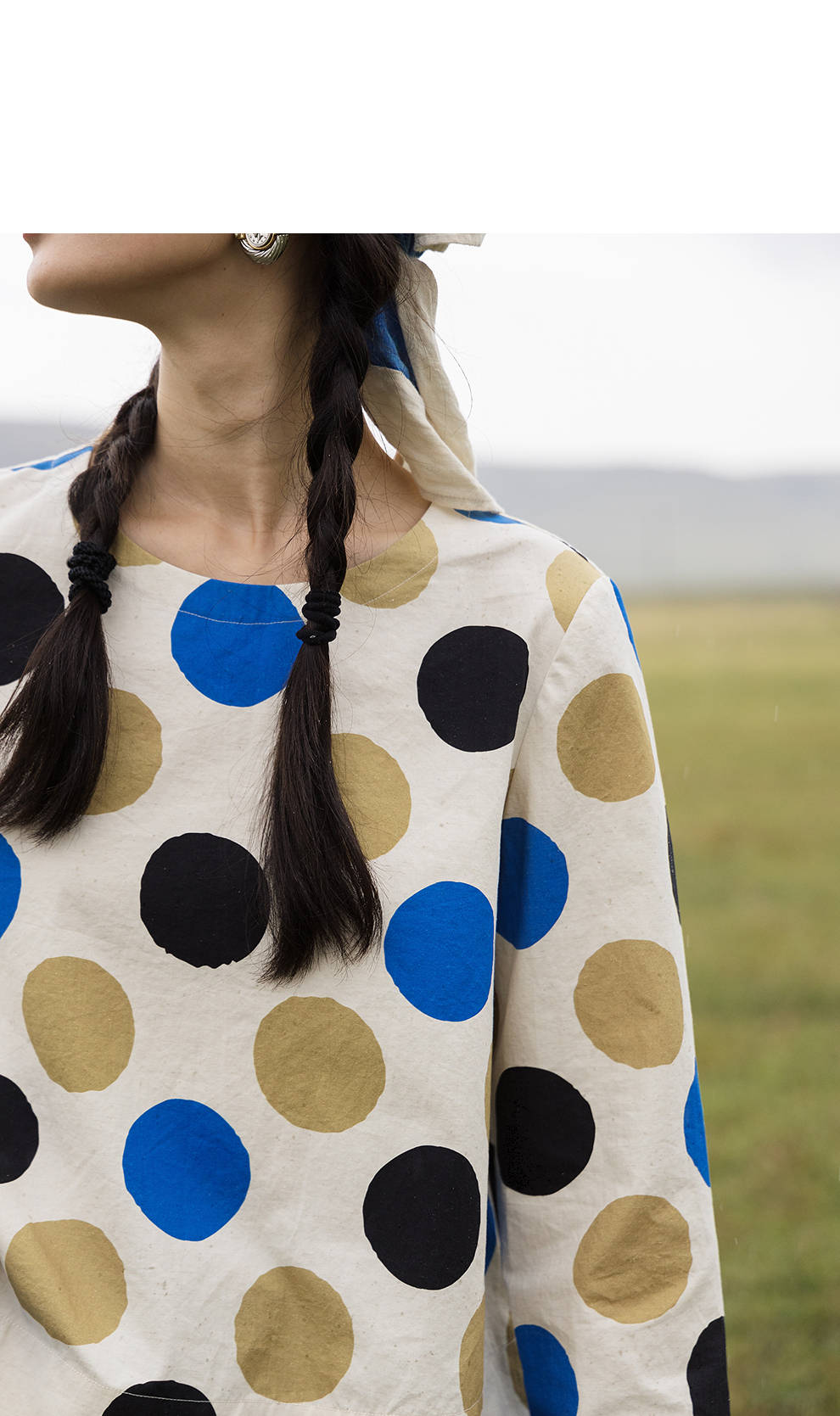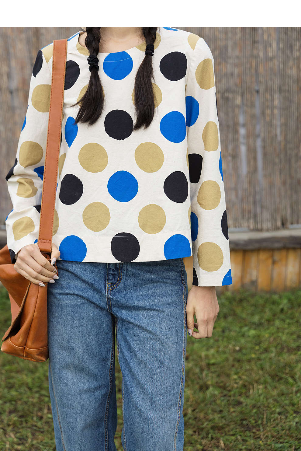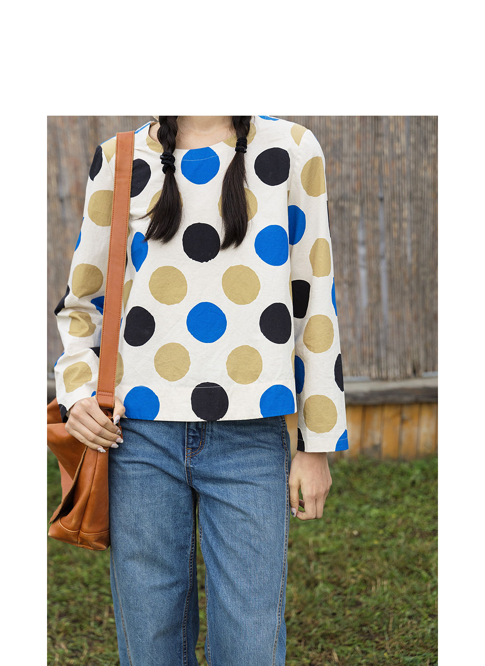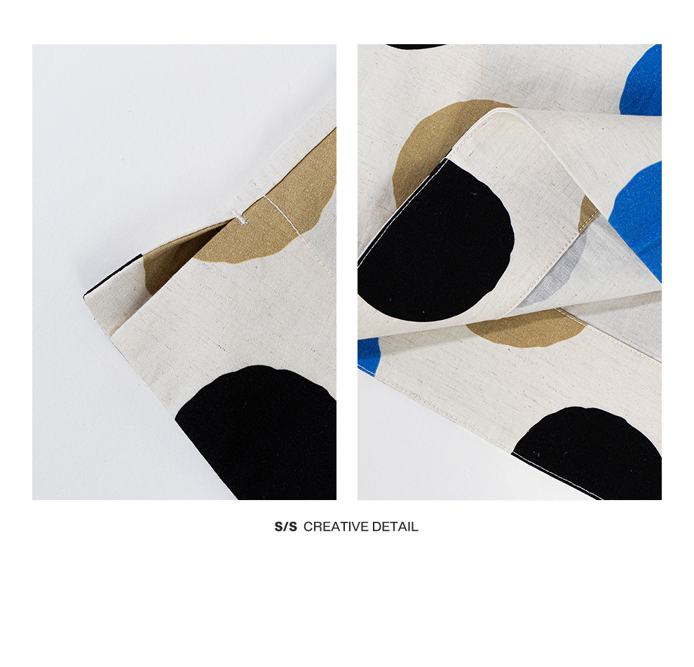 绽放635朵/进口麻灰色织棉底布波点印花垂感圆领宽松套头长袖T恤