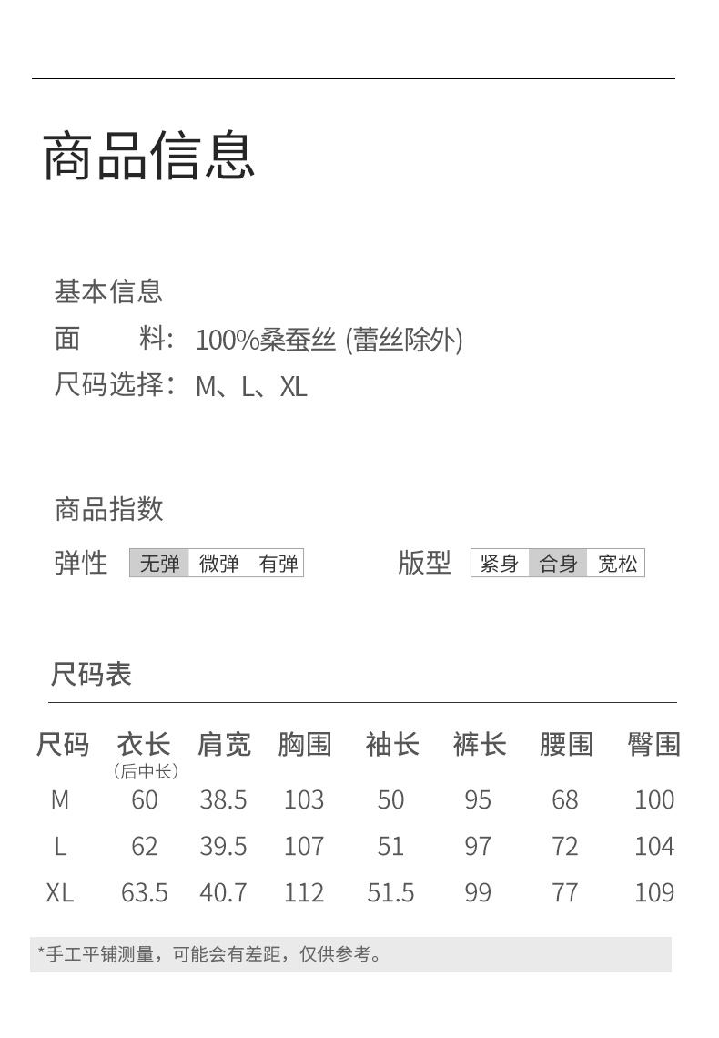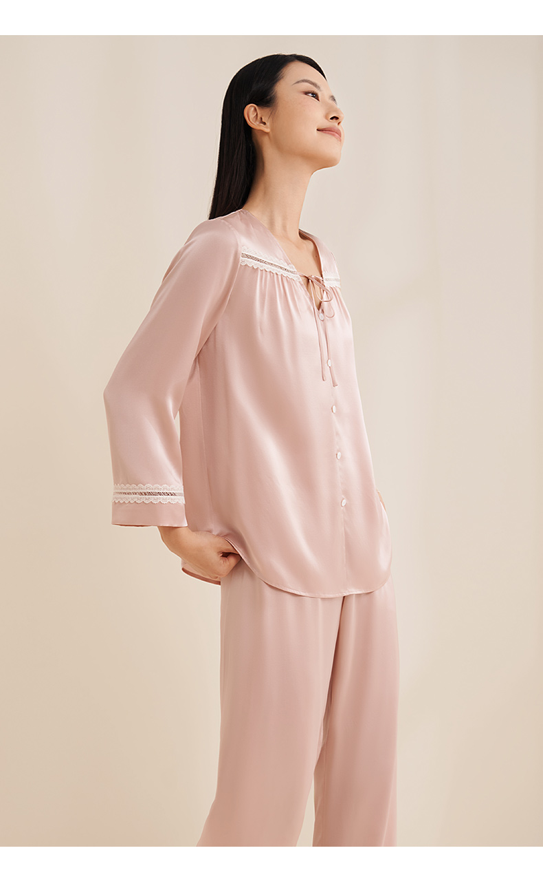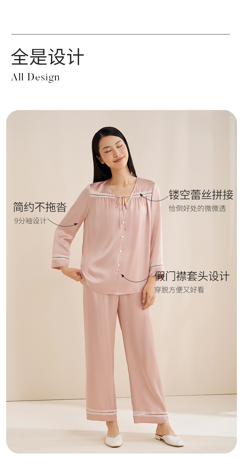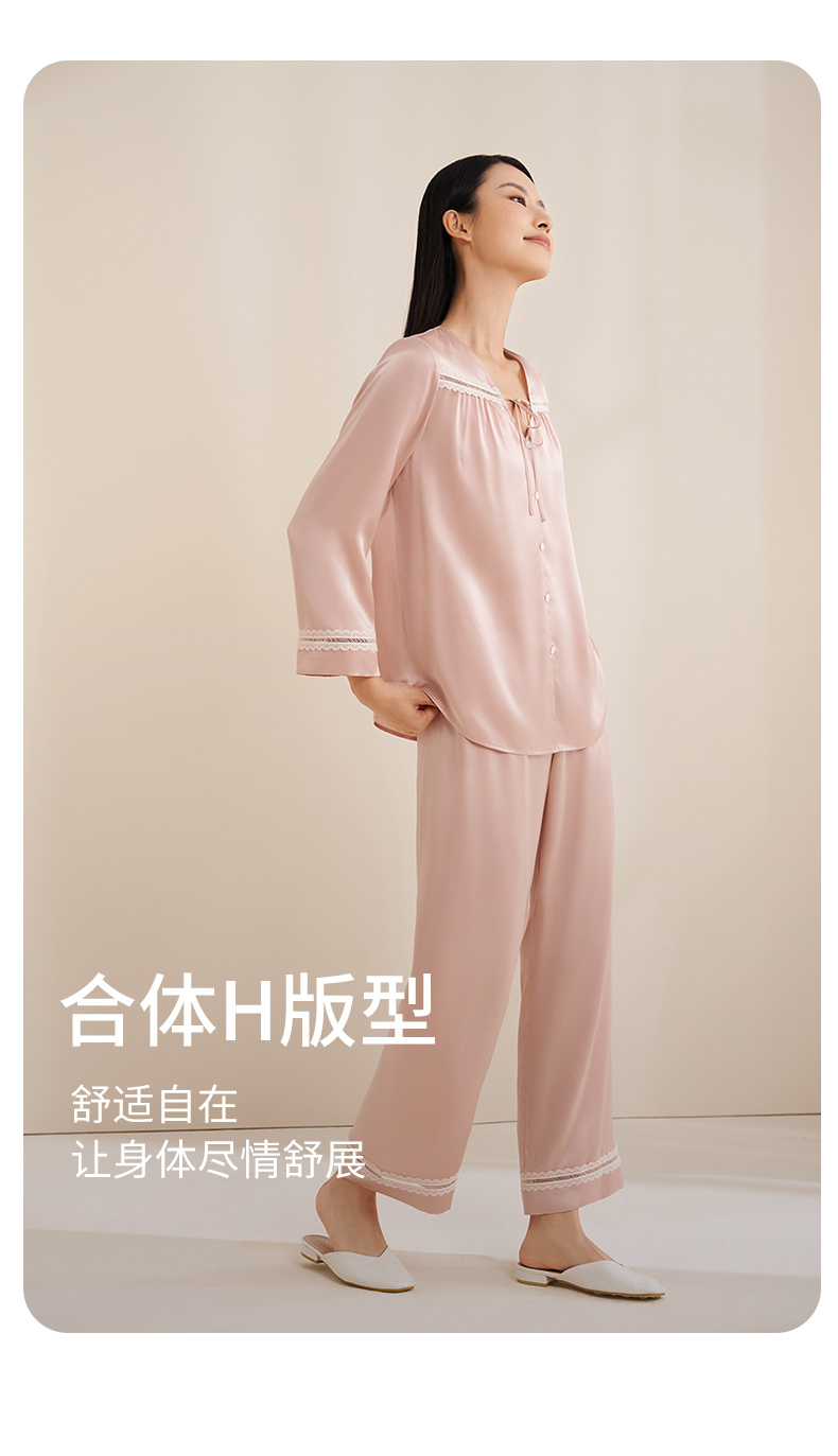 金三塔真丝睡衣女100%桑蚕丝蕾丝拼接宽松舒适长袖家居服衣裤套 YSFEA208