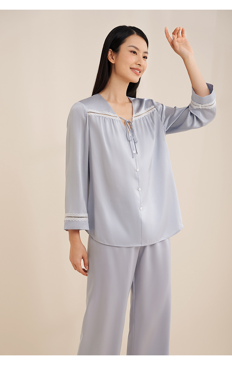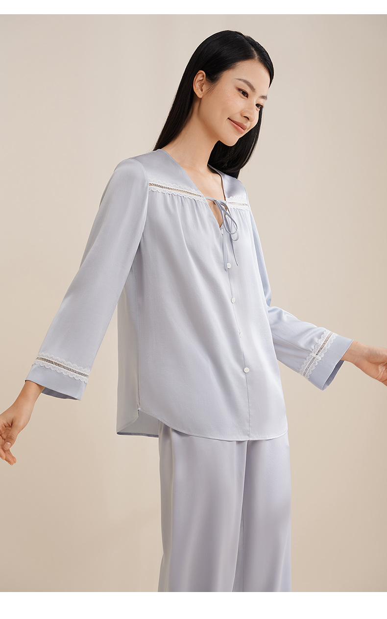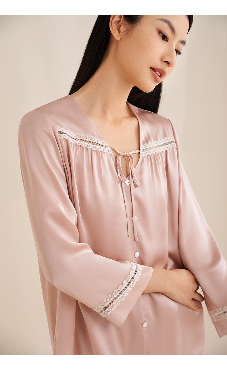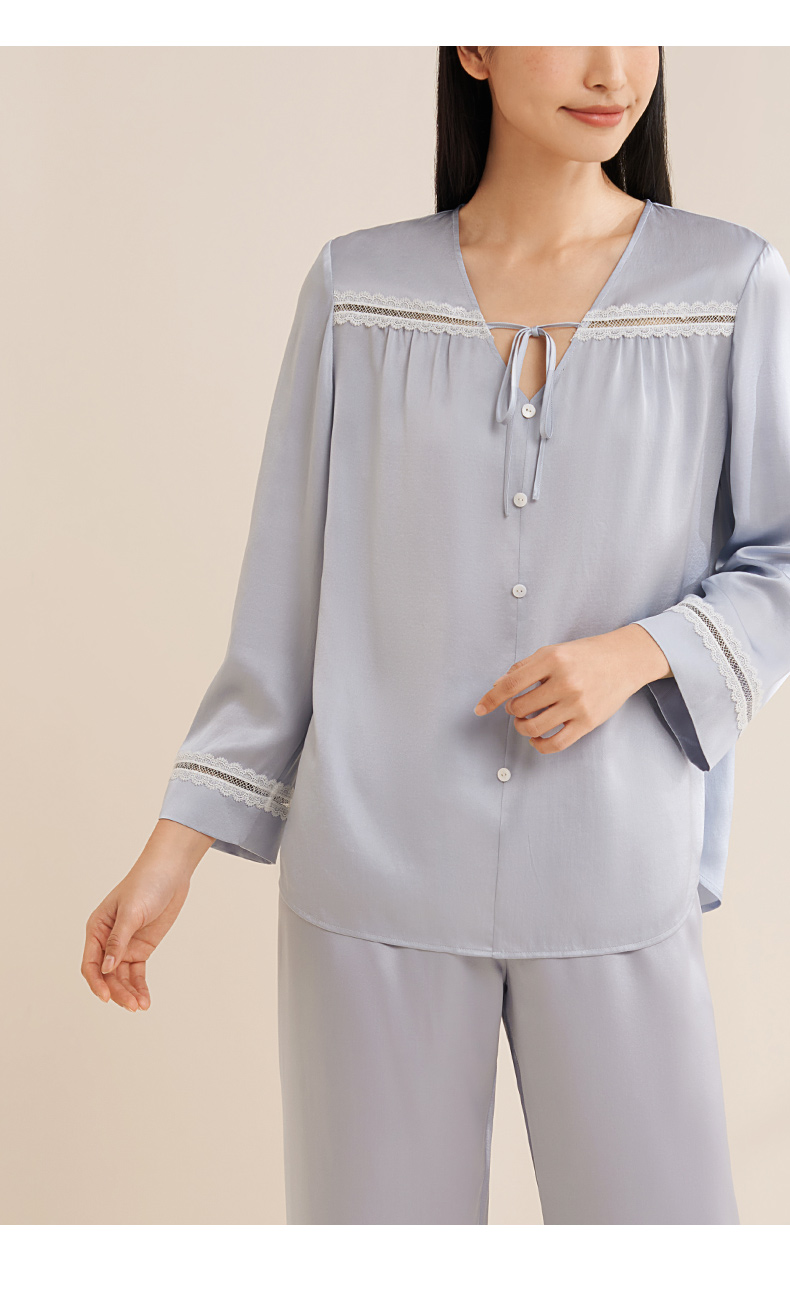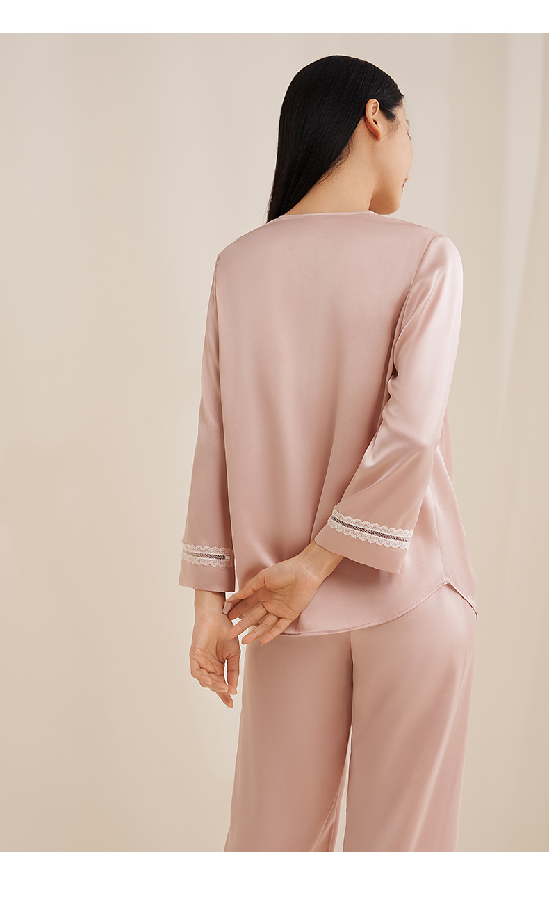 金三塔真丝睡衣女100%桑蚕丝蕾丝拼接宽松舒适长袖家居服衣裤套 YSFEA208