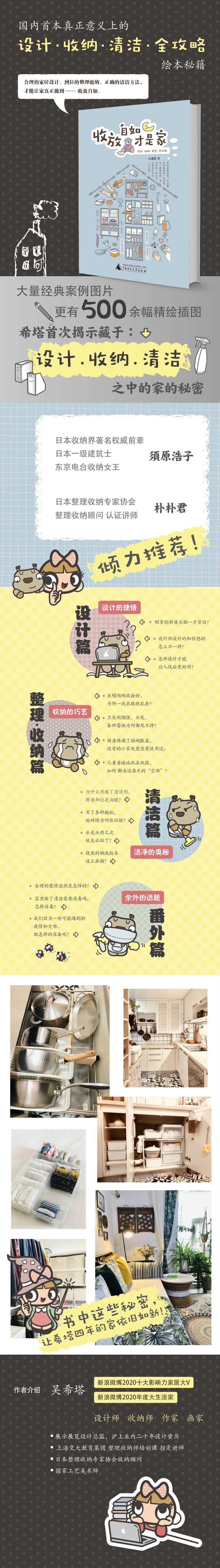 本书共讲了三大篇章,设计篇、整理收纳篇和清洁篇,同时把断舍离、家务日、月、季、年的家务规划、亲子收纳的方法以及装修流程图穿插其中。