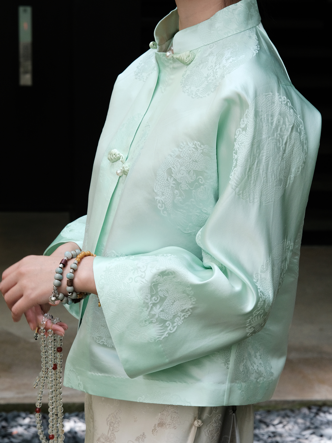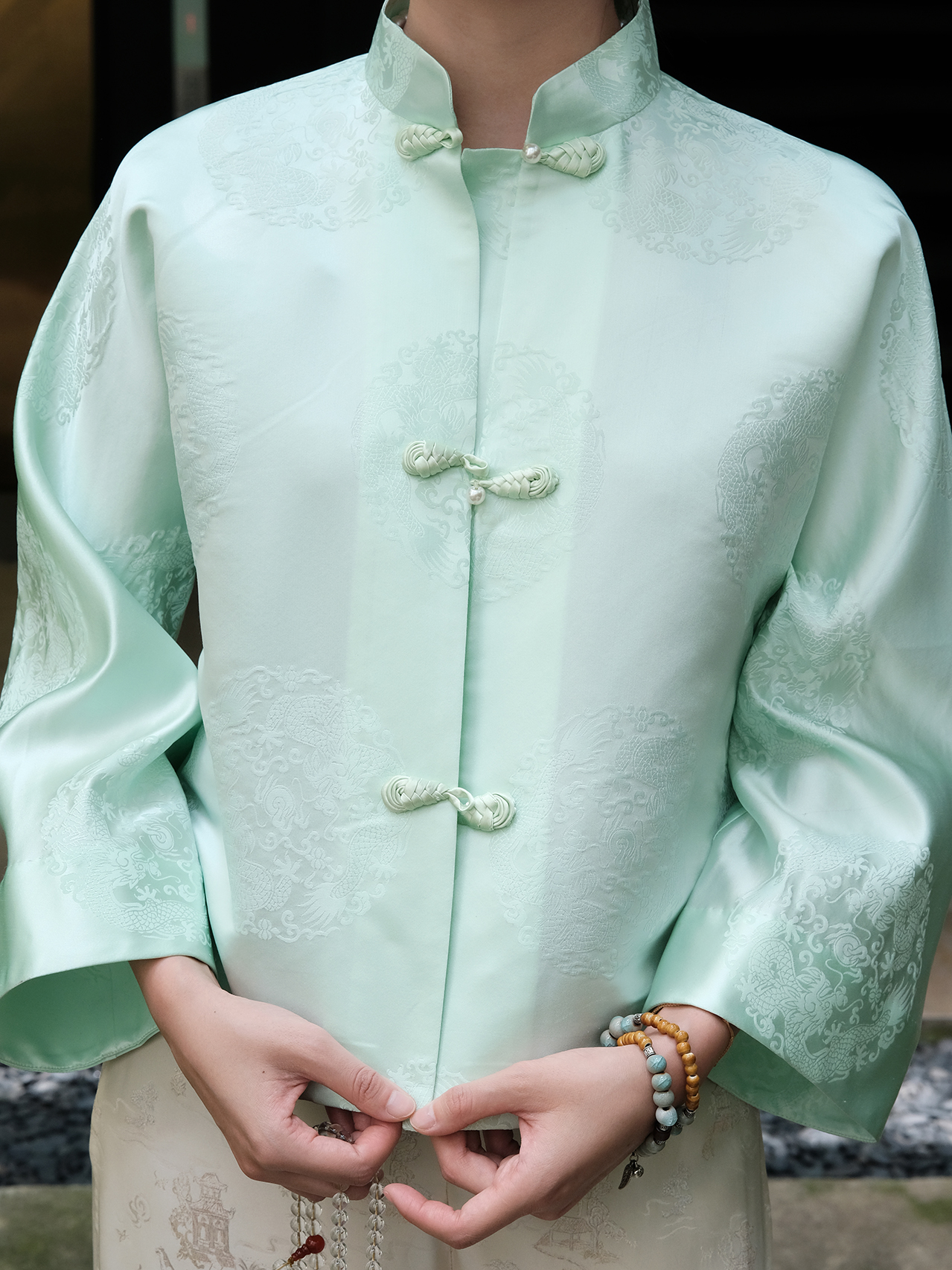 盛唐牡丹|山嵐綠花蕾缎双龙团纹外套