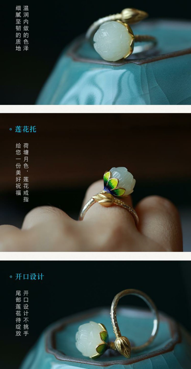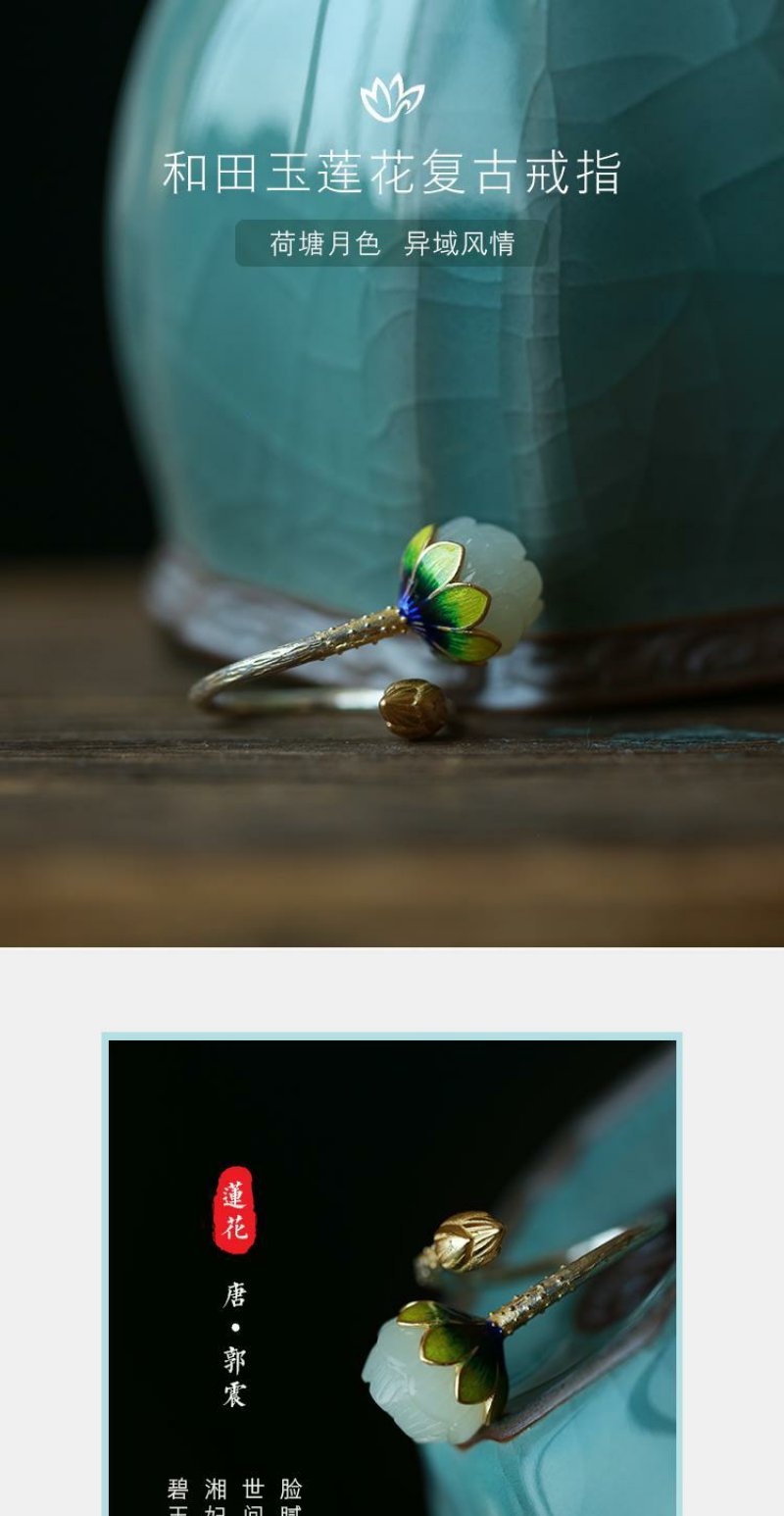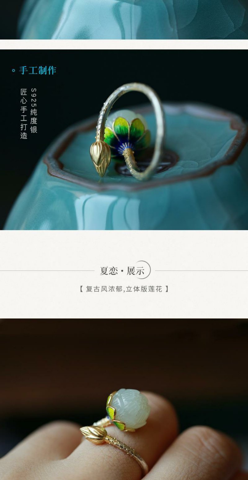 【夏恋。】银烧蓝饰品镶嵌莲花复古女款戒指指环