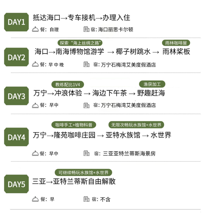 热带雨林河道桨板探秘(含桨板体验+椰子树跳水+原始雨林咖啡体验);1节冲浪课程;亚特兰蒂斯水上嘉年华(水世界+水族馆);野趣赶海(出海渔船+赶海工具+领队);兴隆咖啡庄园(咖啡制作+体验制作娘惹糕);特别赠送海边下午茶+渔获加工+摄影师跟拍)