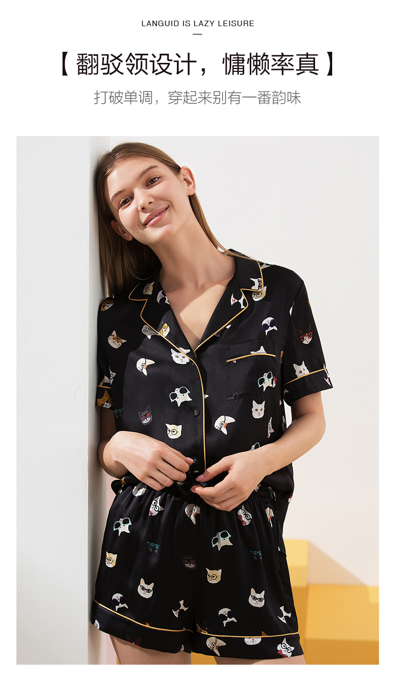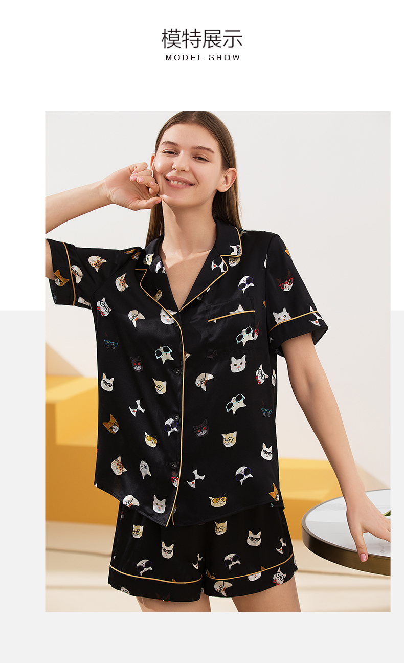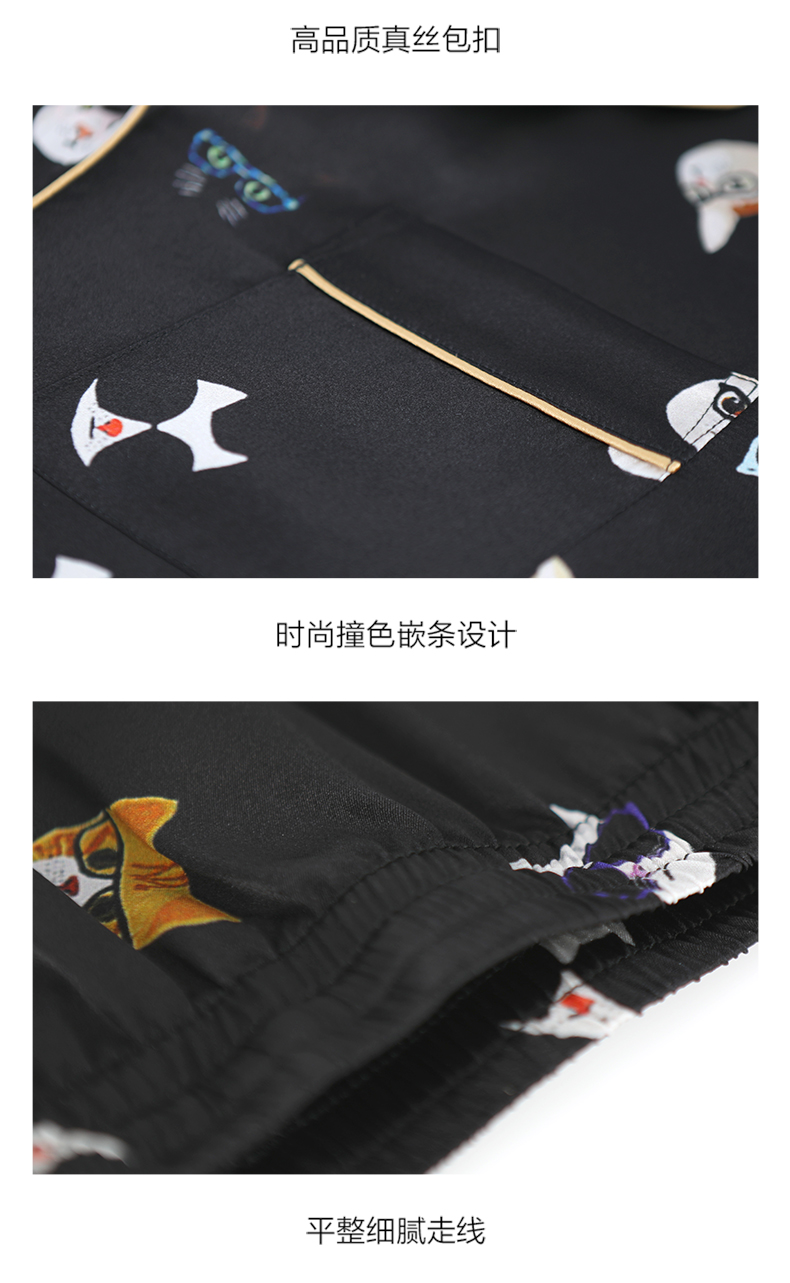 金三塔真丝睡衣衣裤套100%桑蚕丝印花趣味猫咪可外穿家居服套装 YSFAA406