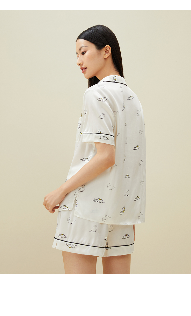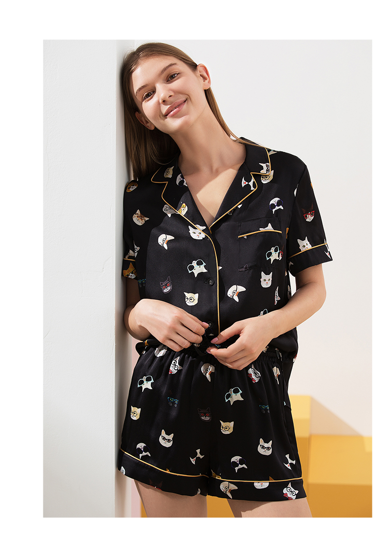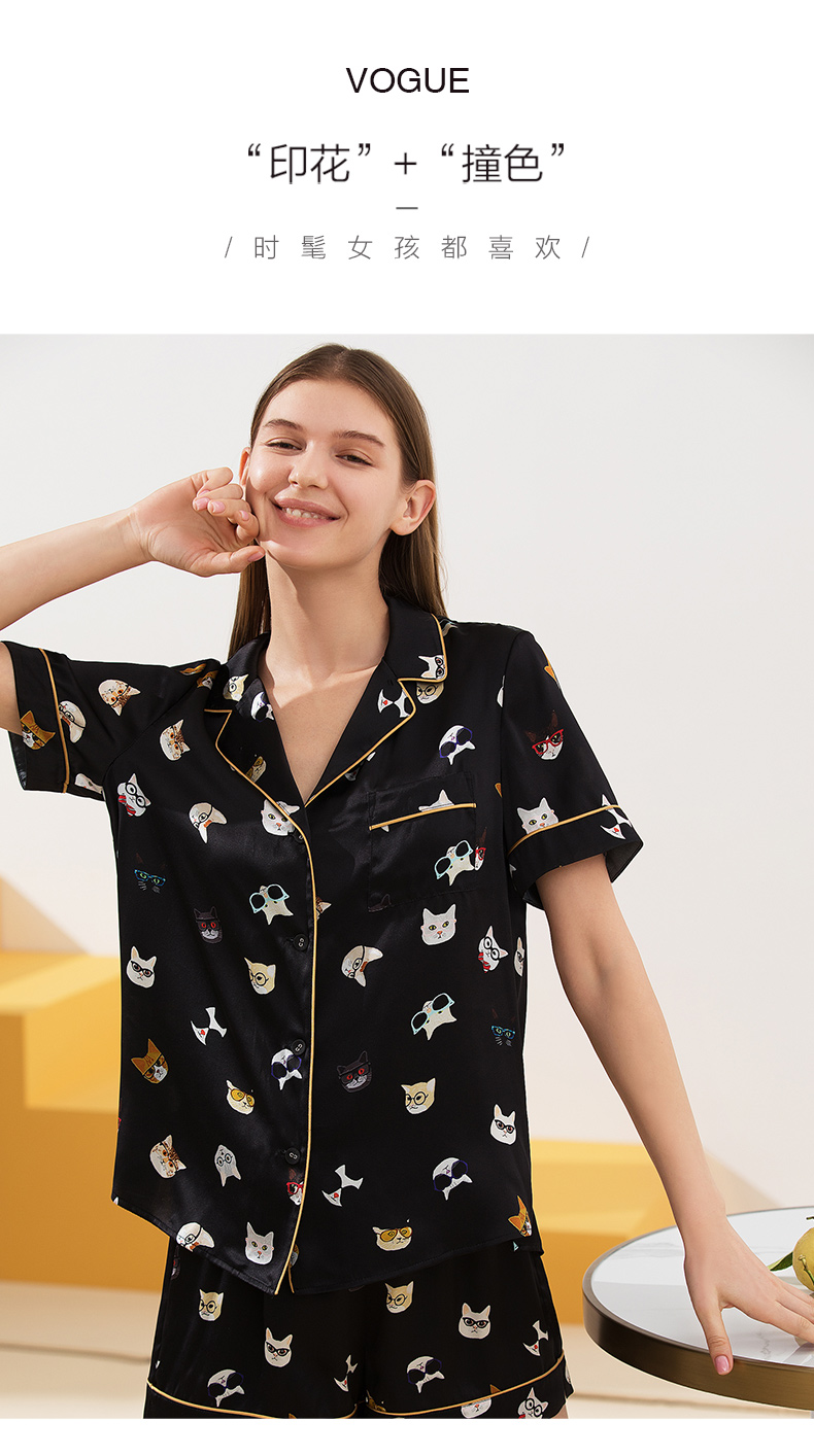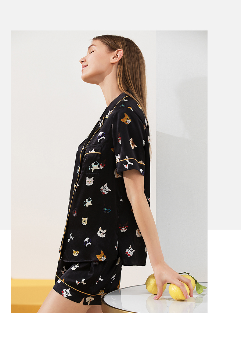 金三塔真丝睡衣衣裤套100%桑蚕丝印花趣味猫咪可外穿家居服套装 YSFAA406