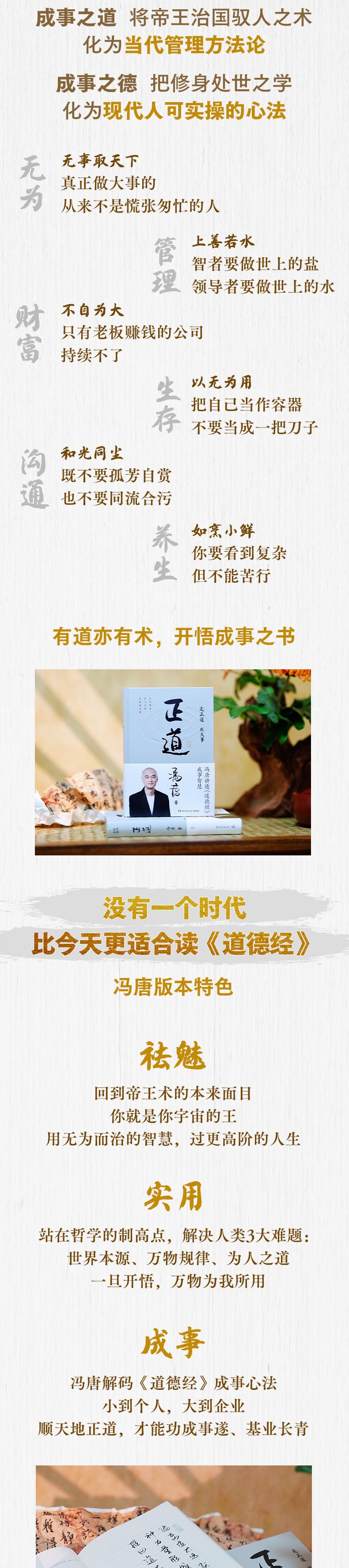 老子所著《道德经》以道和德为纲,涉及修身、治国、用兵、处世,被誉为万经之王。 战略管理专家冯唐,研读中国古籍数十年,以成事学角度讲透《道德经》在现代生活的应用: 成事之道,将帝王治国驭人之术,化为当代管理方法论; 成事之德,把修身处世之学,化为现代人可实操的心法; 全书十余万字,冯唐白话翻译《道德经》,通俗易懂,以自身20年战略管理实践为案例,深度解读老子哲学,融会贯通中西管理智慧。 祛魅、实用、成事,有道亦有术,管理者提升领导力、普通人过好一生的必读之书。