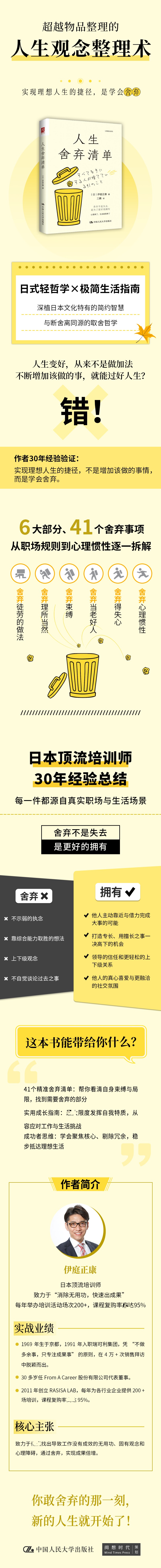 书中列出了41个需舍弃的事项,帮助我们看清自身存在的束缚与局限,找到需要舍弃的部分,从而优选限度地发挥自我特质,更从容地应对生活与工作中的各种挑战,活出自己想要的模样。