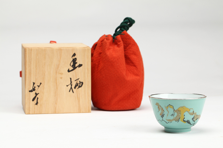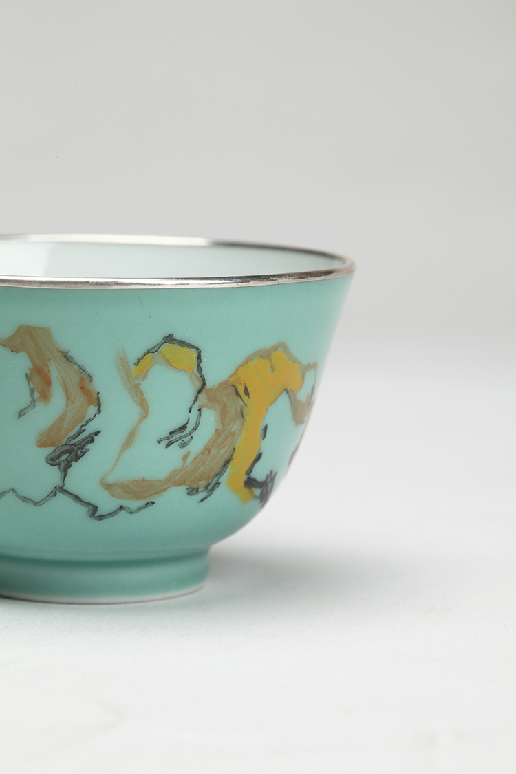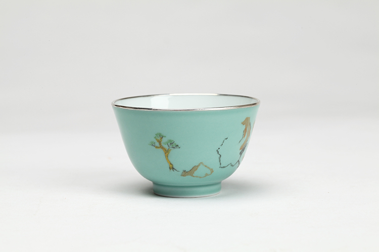 《幽栖》松石釉釉彩绘主人杯,松石色近乎蓝色,是低调的颜色,用在瓷器上,加上艺术家的彩绘加持,十分惊艳,陈如冬的作品儒雅文气,树木、赏石,他的作品总是有一种魔力,让人不自觉的身临其境,心静下来,漫步其中。画面寥寥数笔,江南文人气息沉浸其中。