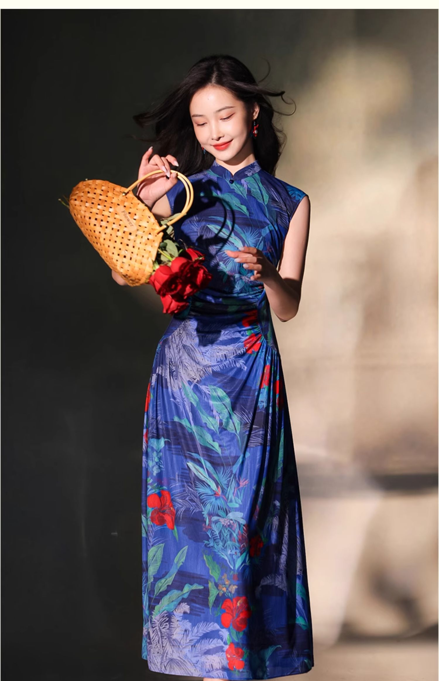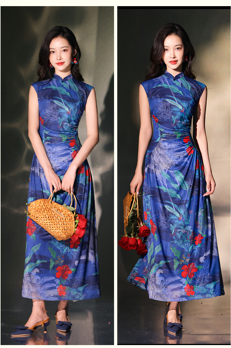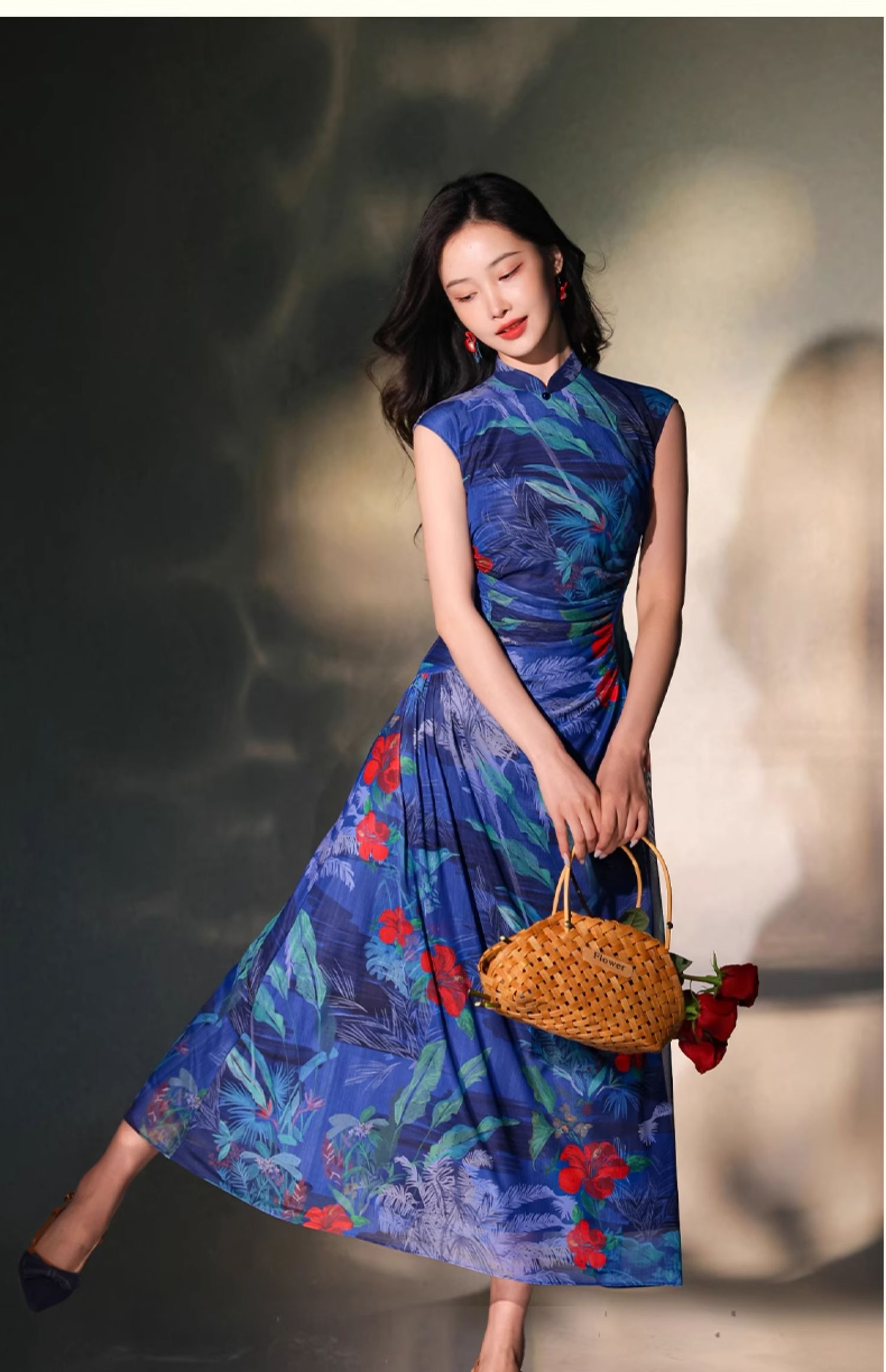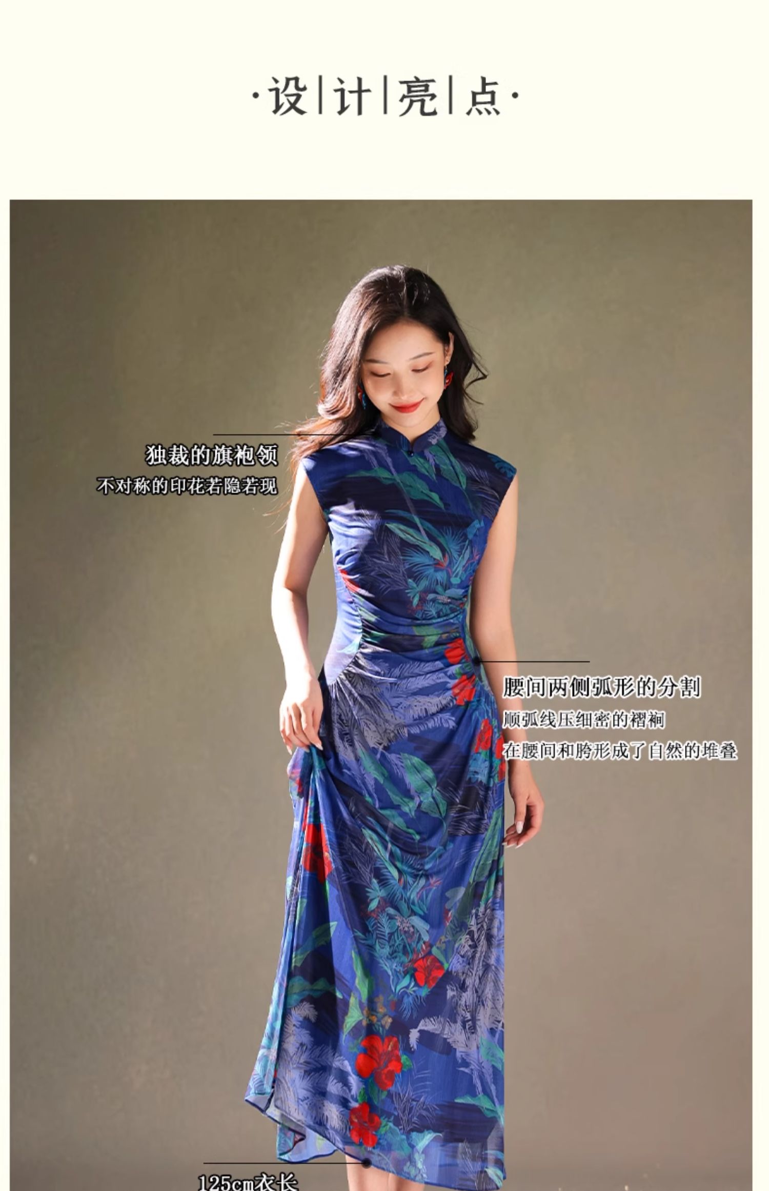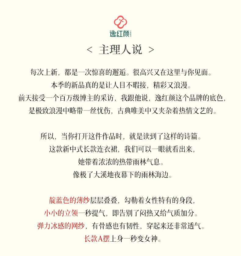 逸红颜浣黎2025夏新款冰感弹力网热辣集美度假风新中式大摆连衣裙