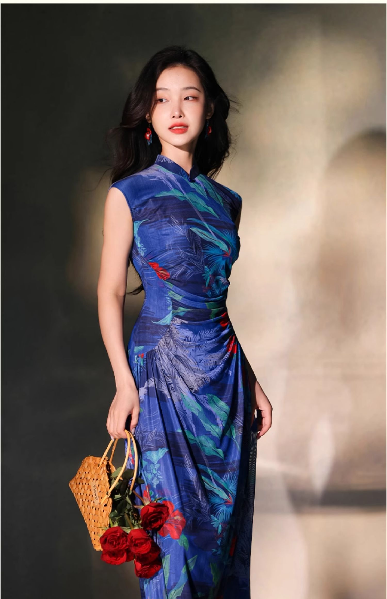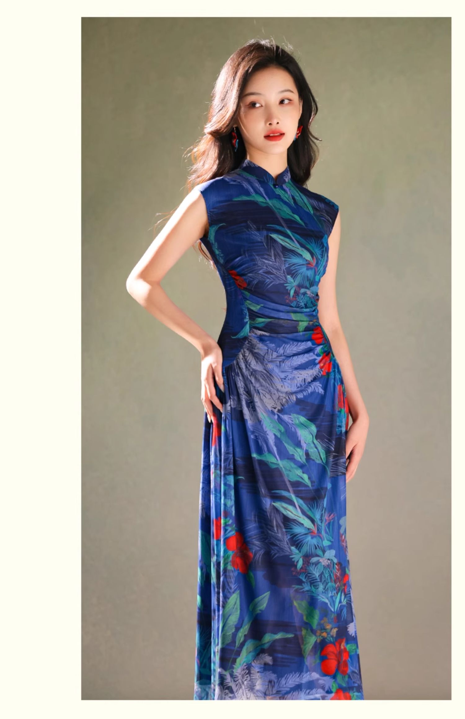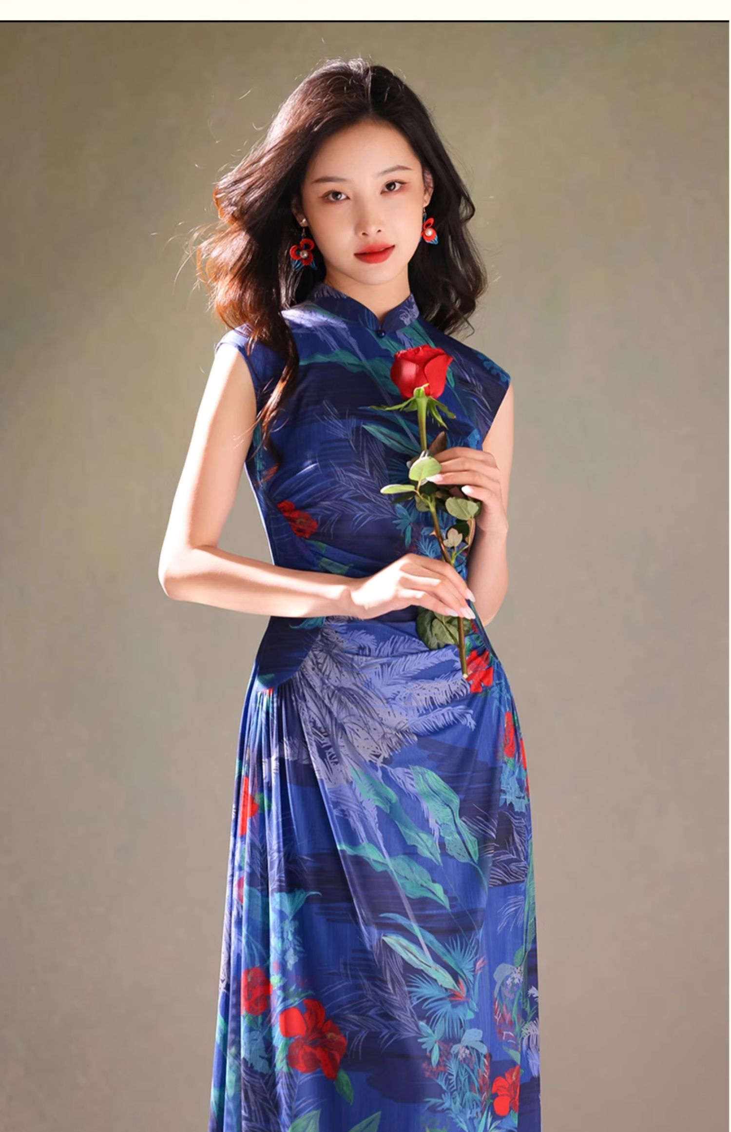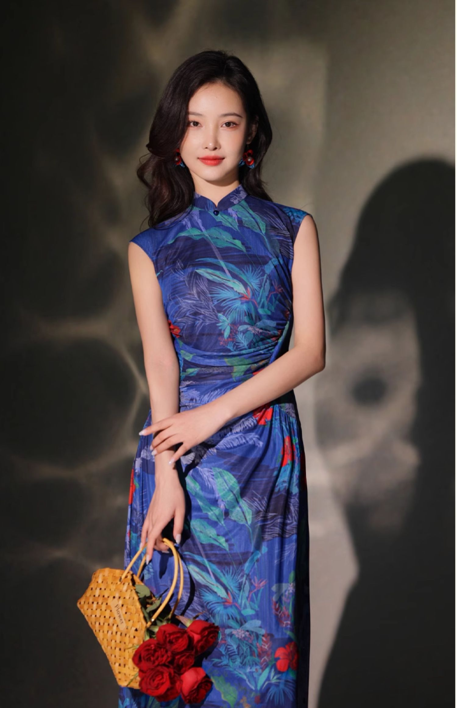 逸红颜浣黎2025夏新款冰感弹力网热辣集美度假风新中式大摆连衣裙