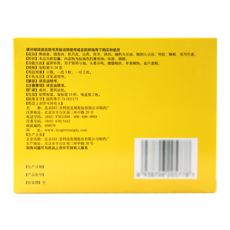 同仁堂六味地黄软胶囊20粒/盒 肾亏 滋阴补肾
