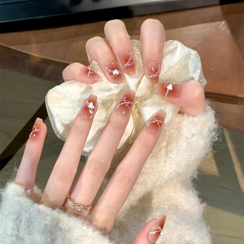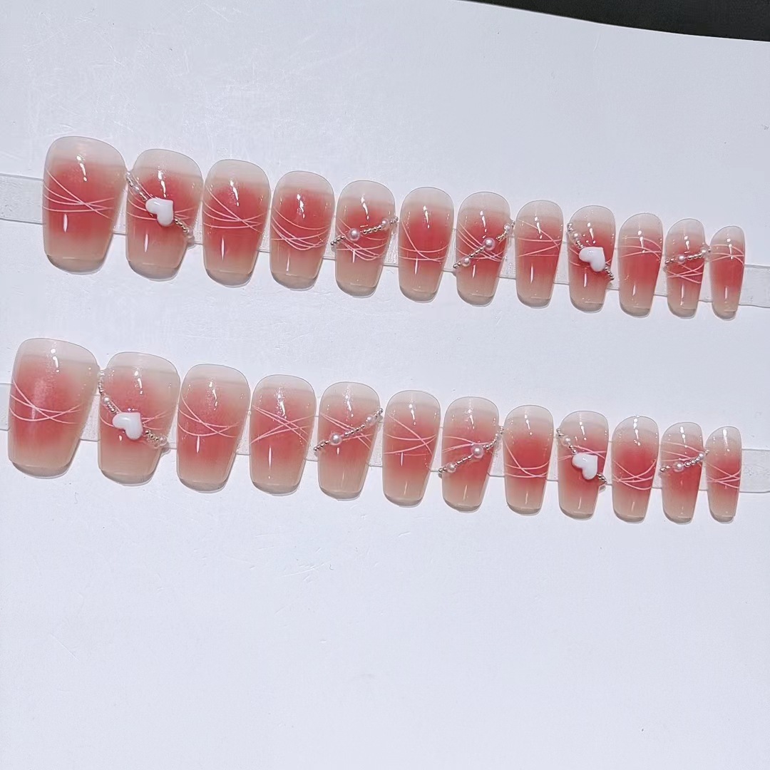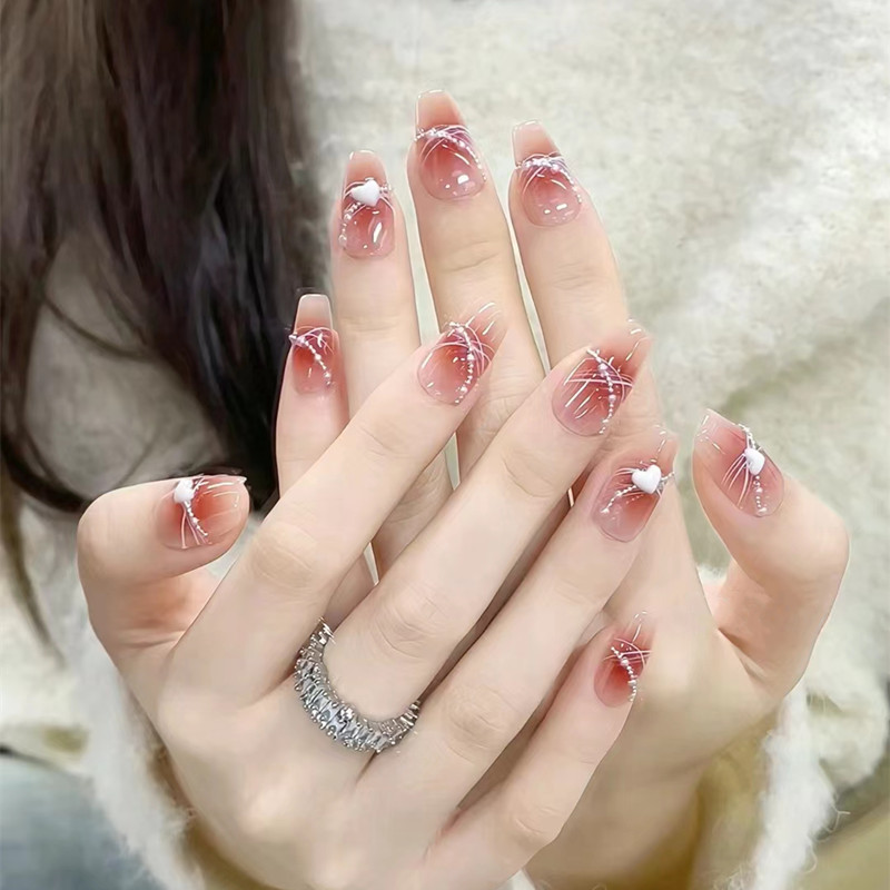 【腮红桃心!甲线显妙趣】穿戴甲B781腮红桃心中长梯腮红甲线条珍珠小白心。ry