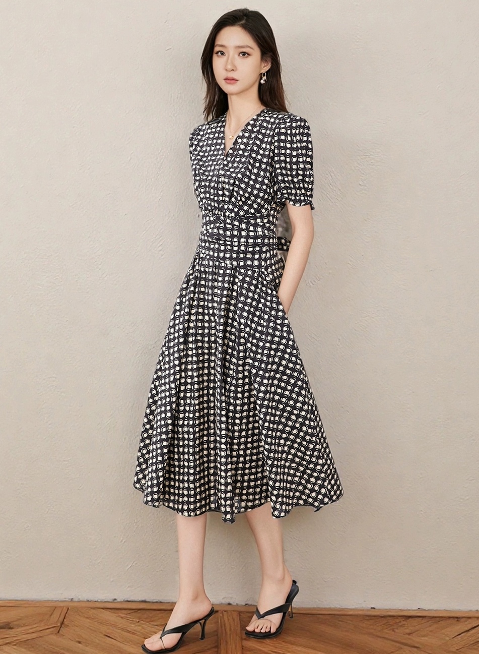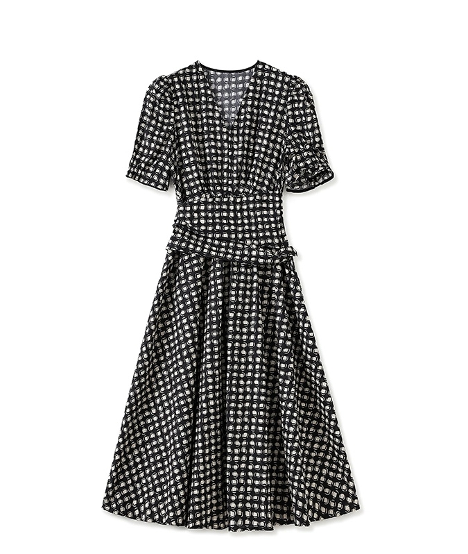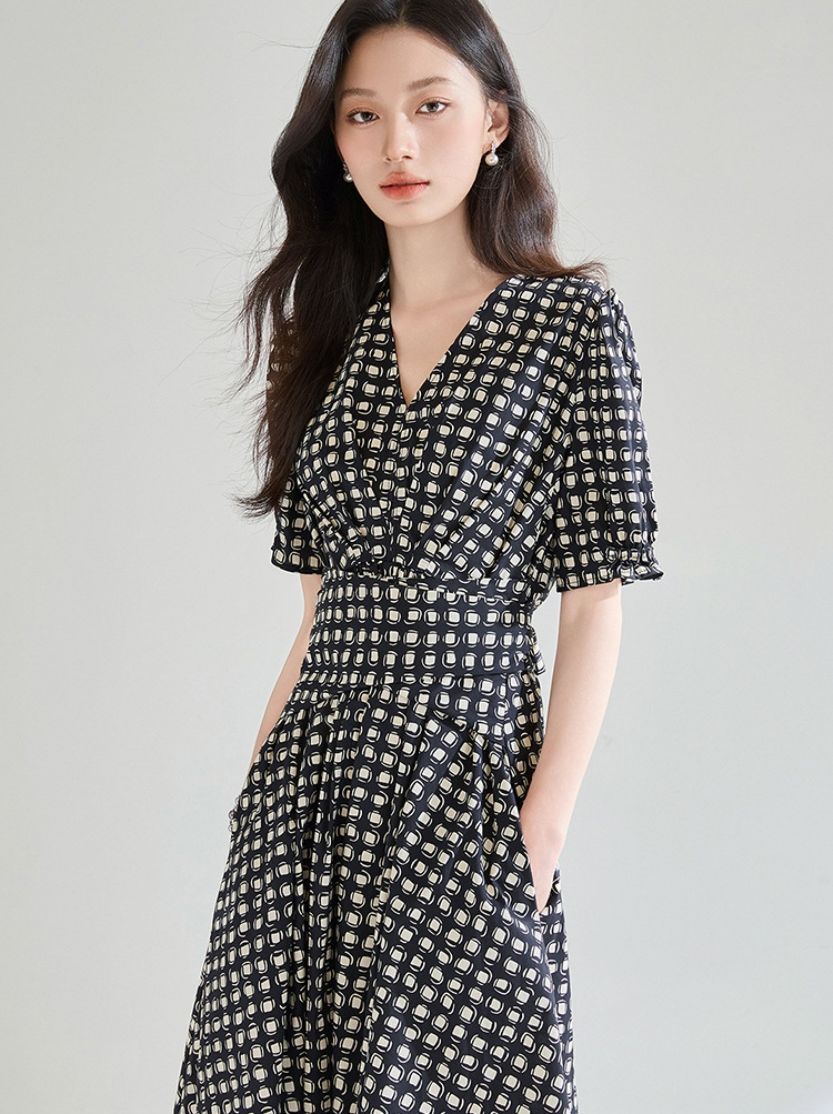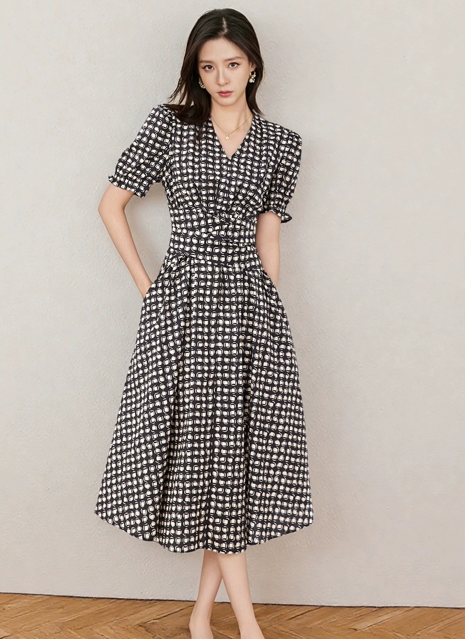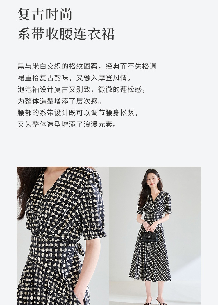 黑与米白交织的格纹图案,经典而不失格调裙重拾复古韵味,又融入摩登风情。泡泡袖设计复古又别致,微微的蓬松感,为整体造型增添了层次感。