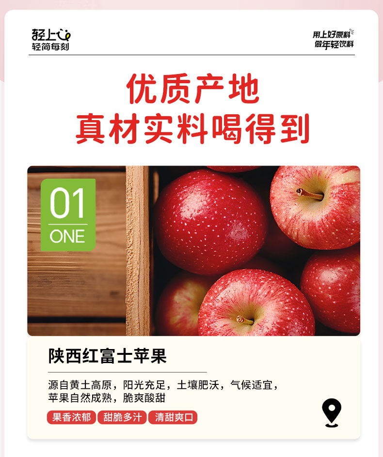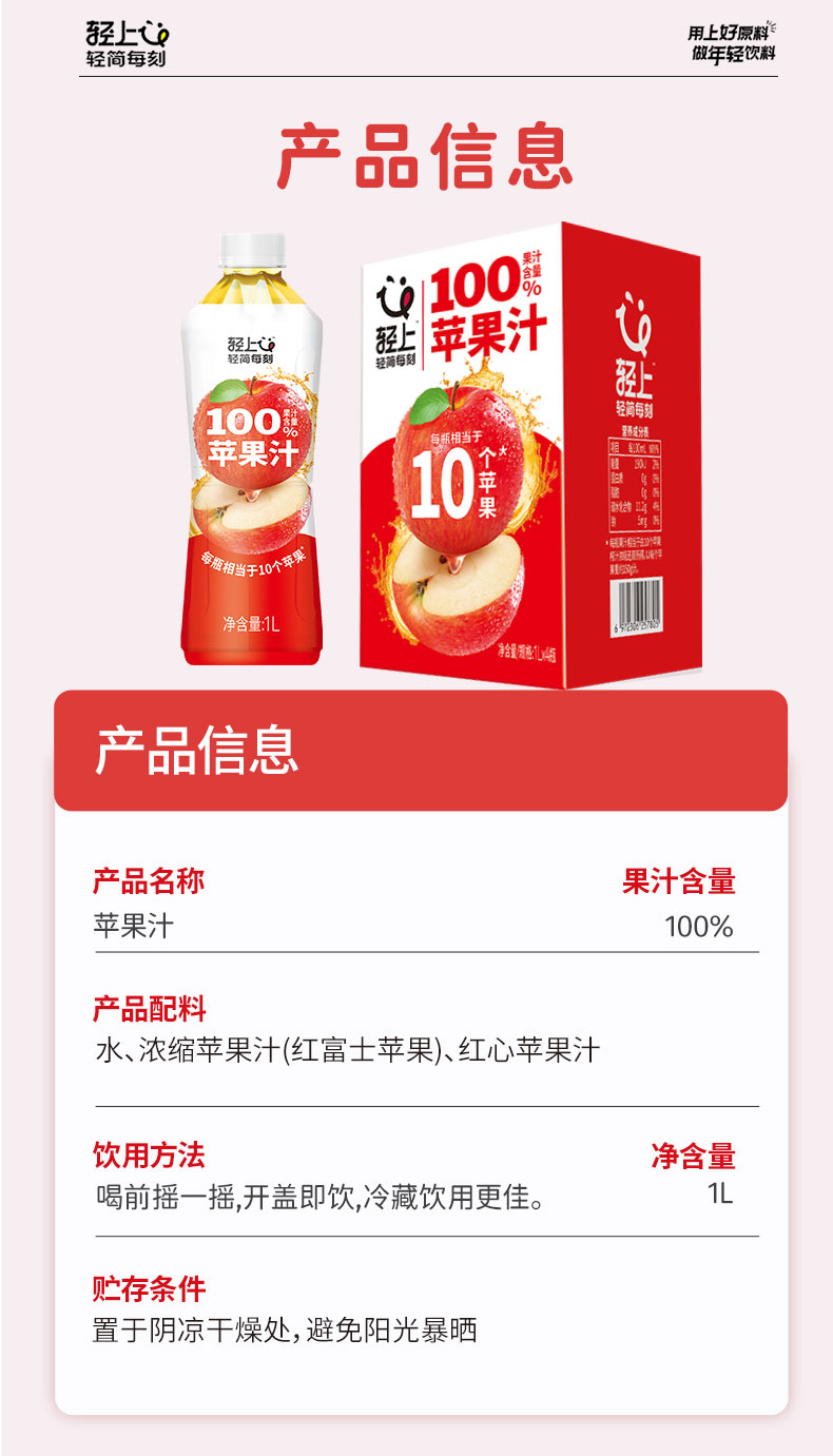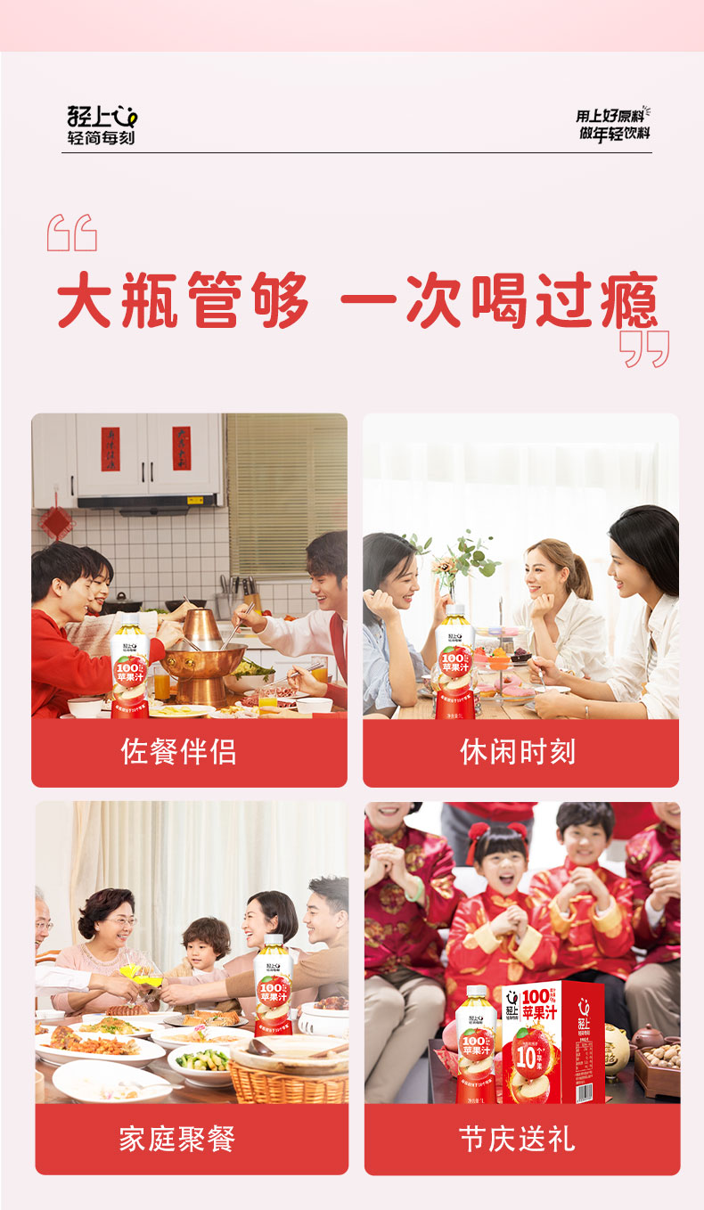 轻上100 %果汁苹果汁饮品1L大瓶装配料干净