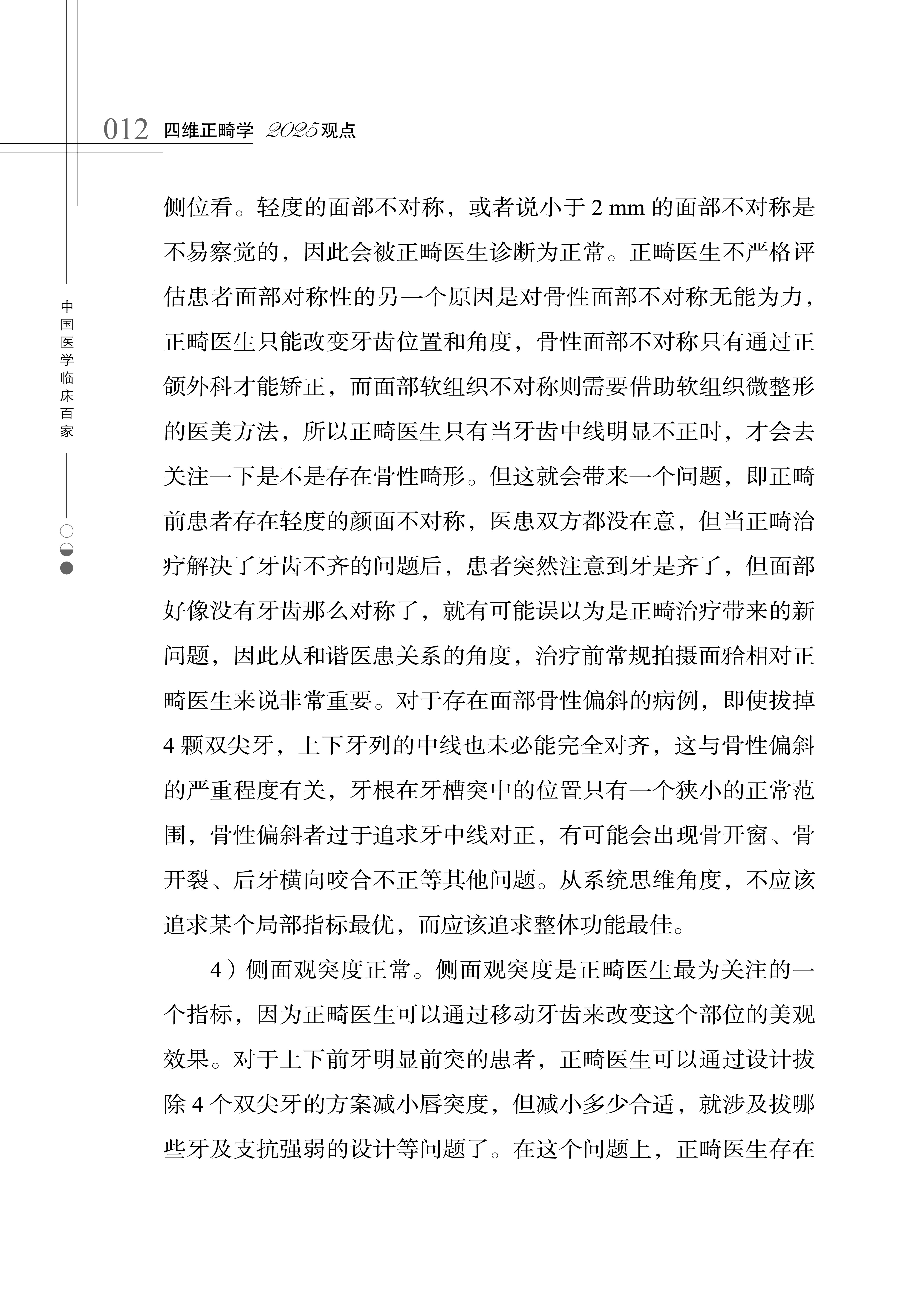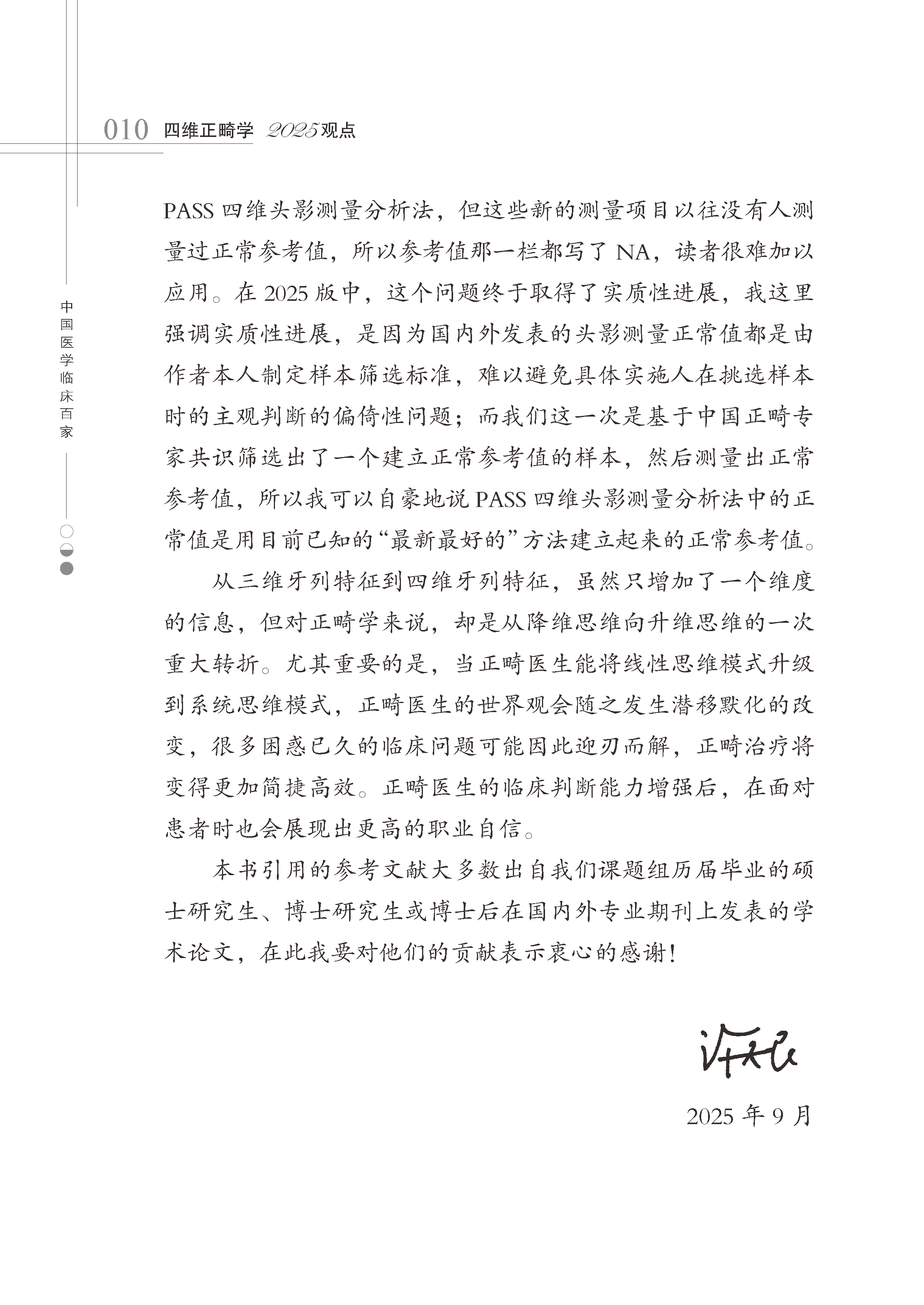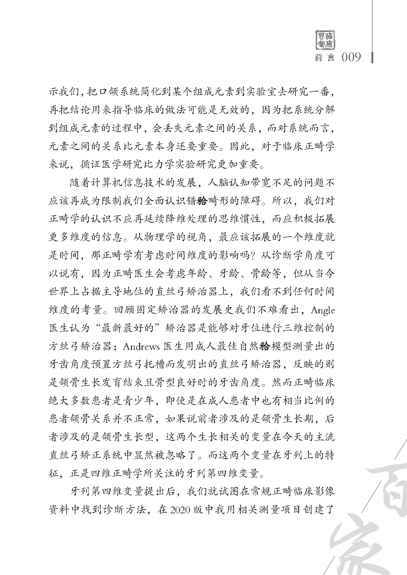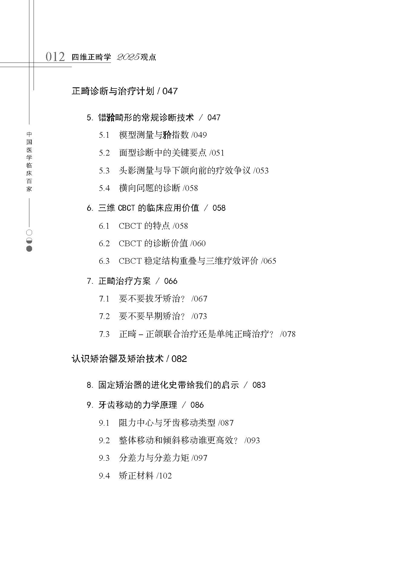 《四维正畸学许天民 2025观点》是正畸学领域的前沿著作。本书深入探讨了四维正畸学这一创新性理念,在传统三维空间矫正的基础上,融入时间维度,强调正畸治疗全程的动态变化与精细把控。书中详细阐述了从患者的诊断评估开始,运用先进的数字化技术进行精准分析,涵盖口腔颌面部结构在不同生长发育阶段的特征。在治疗方案制定方面,不仅介绍各类经典正畸技术,更着重展示新型矫治器的应用及多学科联合治疗策略。同时,通过大量丰富且典型的临床案例,生动呈现四维正畸学在实际应用中的效果与优势,包括对各类错颌畸形的有效矫治,以及对患者面部美观和口腔功能的全面改善。